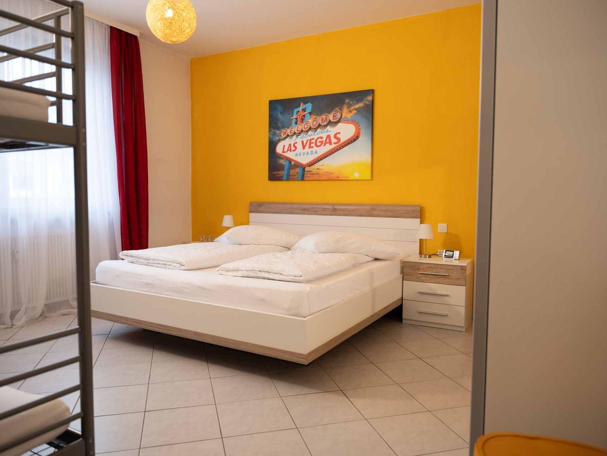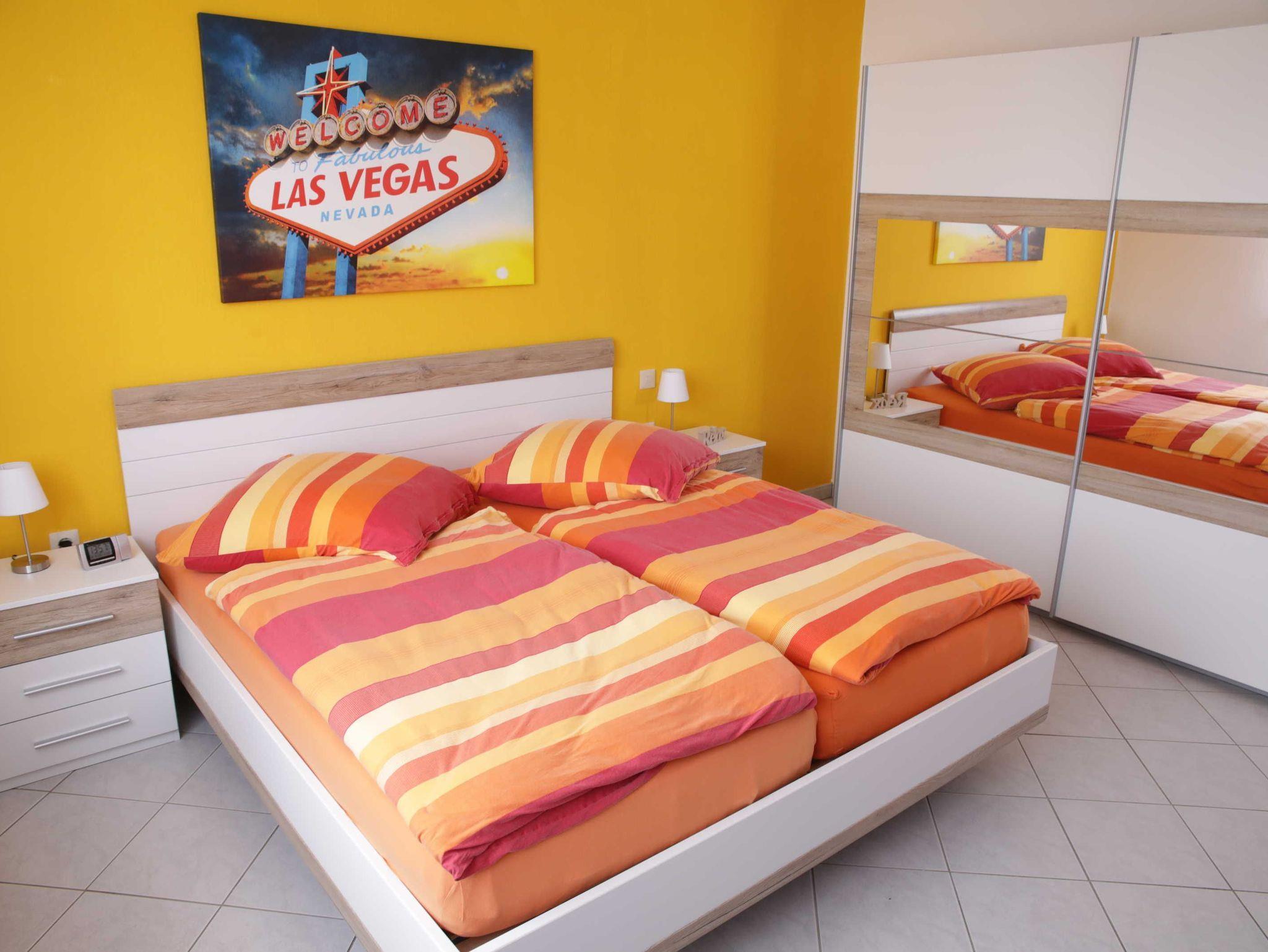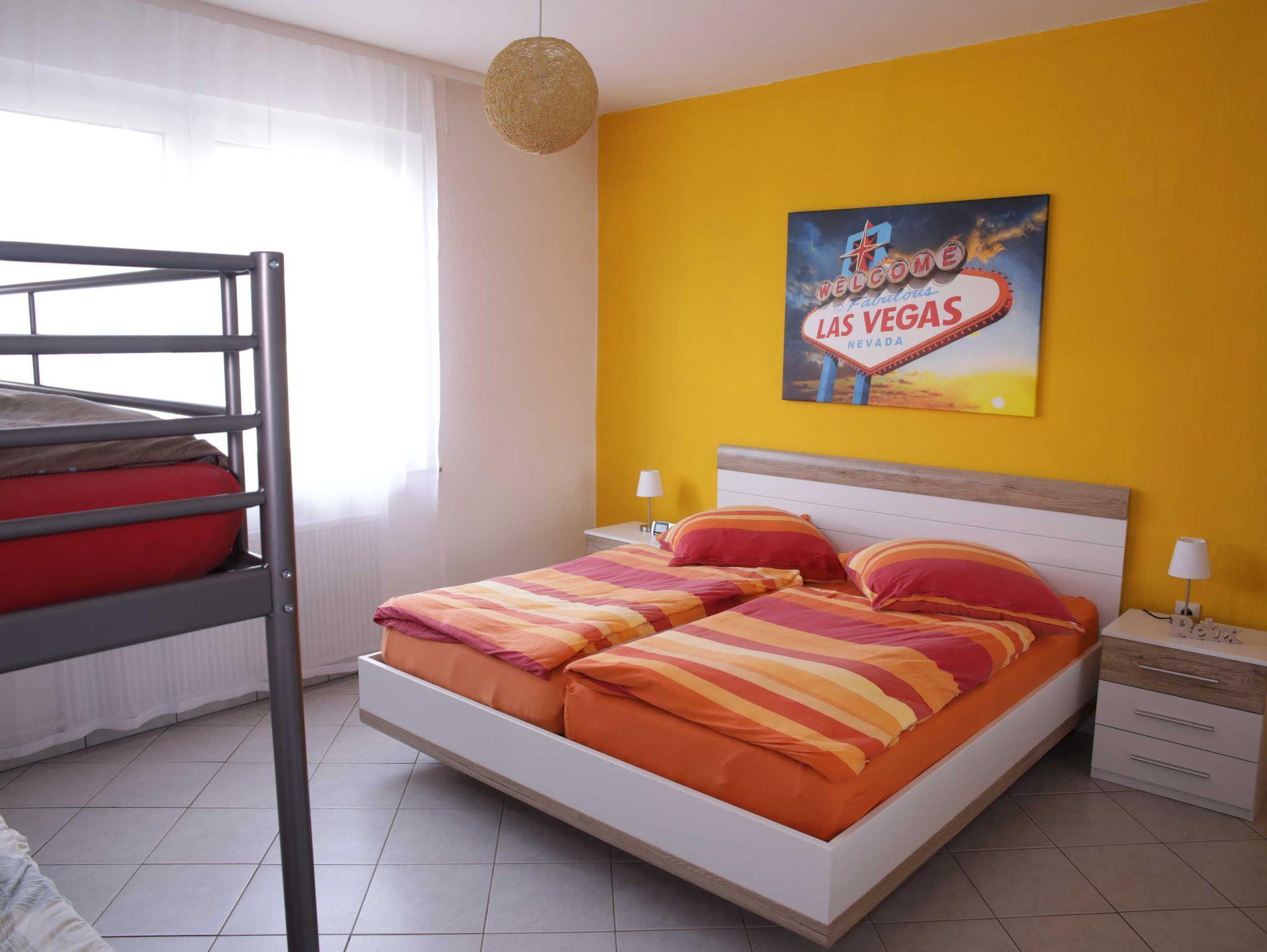 Das gemütliche und ruhige Schlafzimmer ist mit einem Doppelbett (1,80m x 2,00m), einem Doppel-Stockbett sowie einem großen Kleiderschrank ausgestattet. Im zweiten Schlafzimmer befindet sich ebenfalls ein Doppelbett (1,80m x 2,00m), ein kleiner Kleiderschrank sowie zusätzlich noch ein Schreibtisch. Die Schlafbereiche ist sehr ruhig.