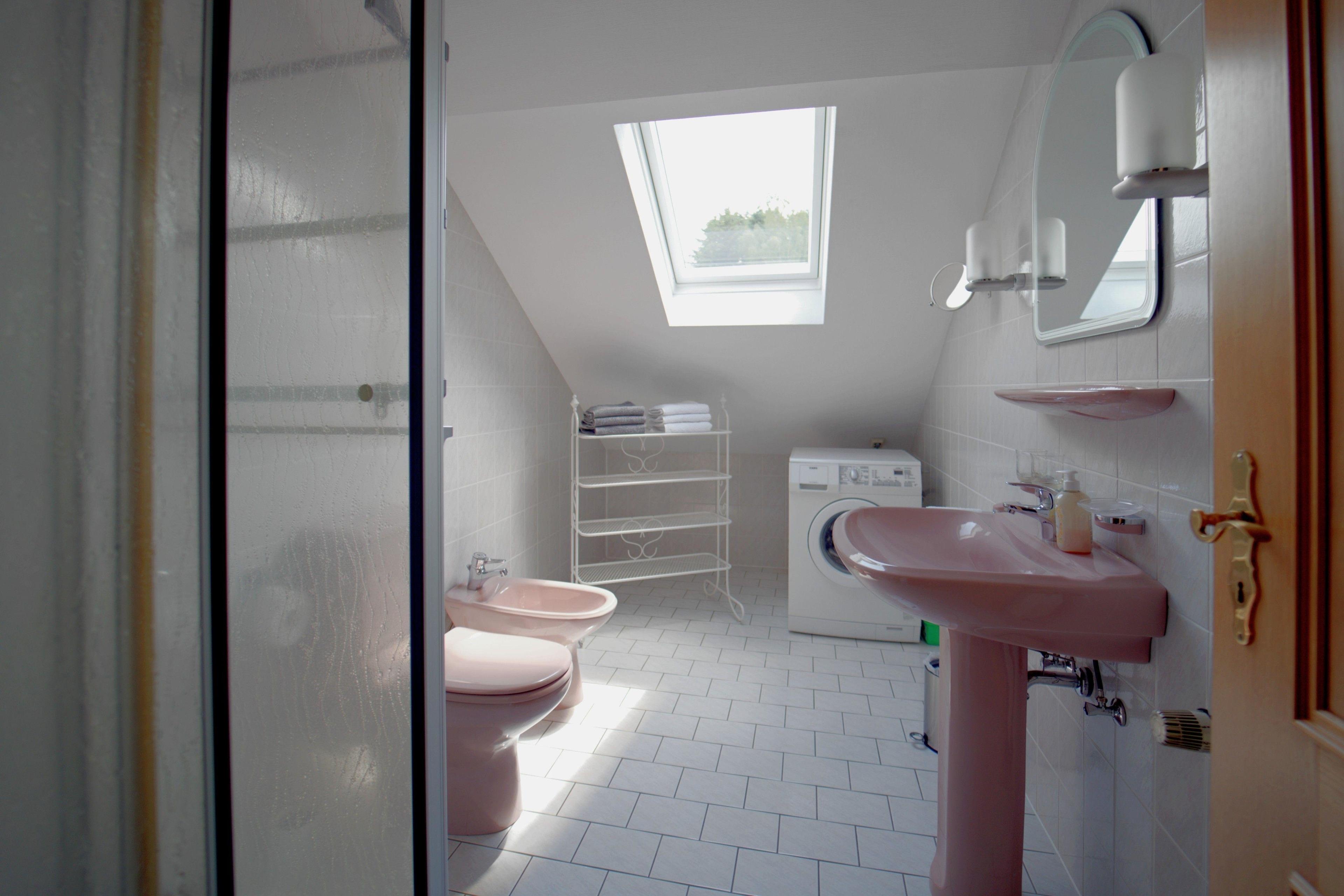 Im zweiten Bad befindet sich eine Dusche, ein Bidet, ein Waschbecken, ein WC und ein Schrank.
