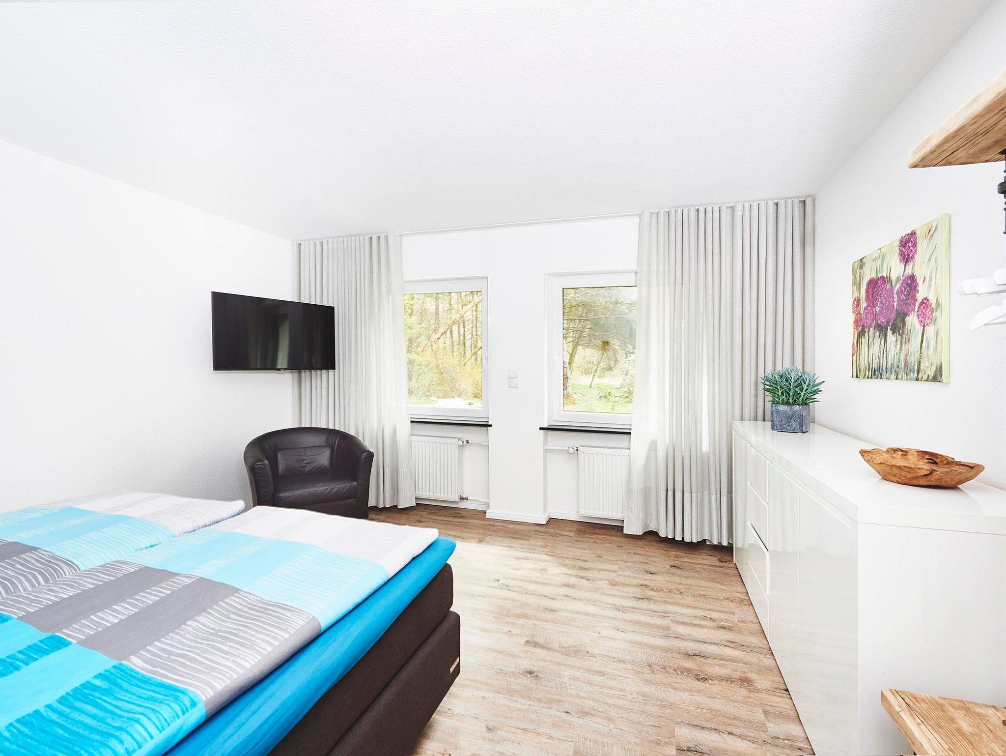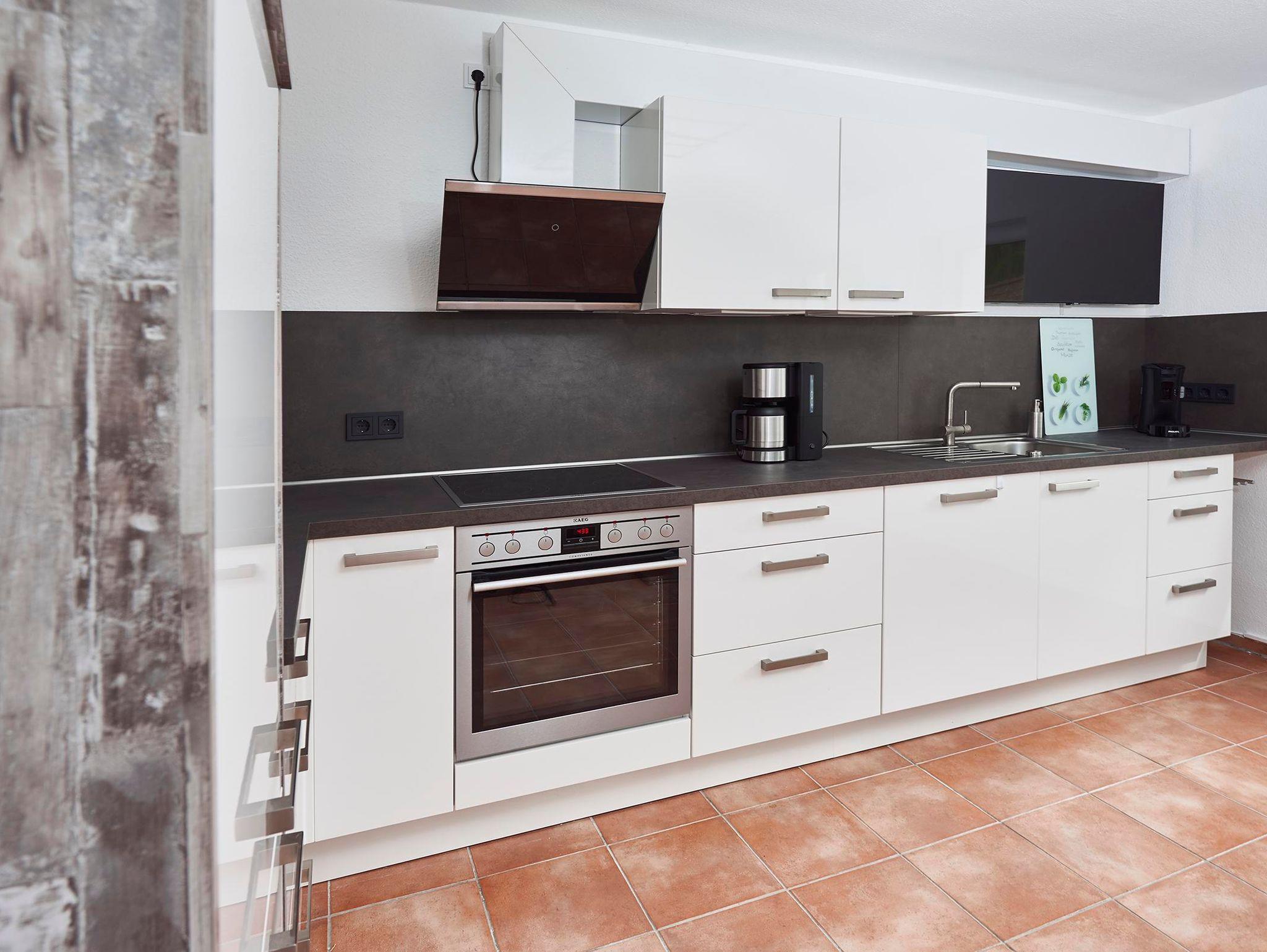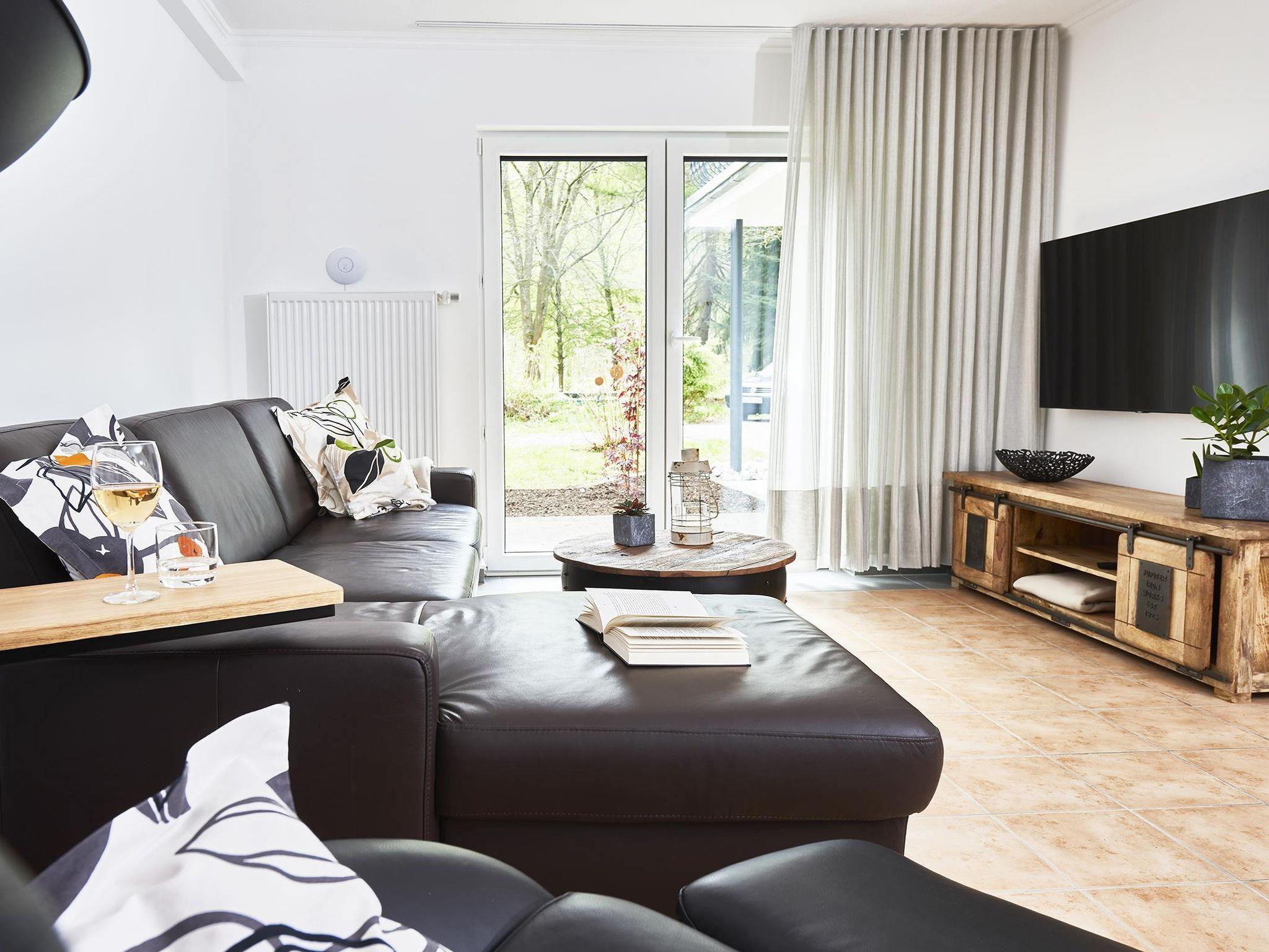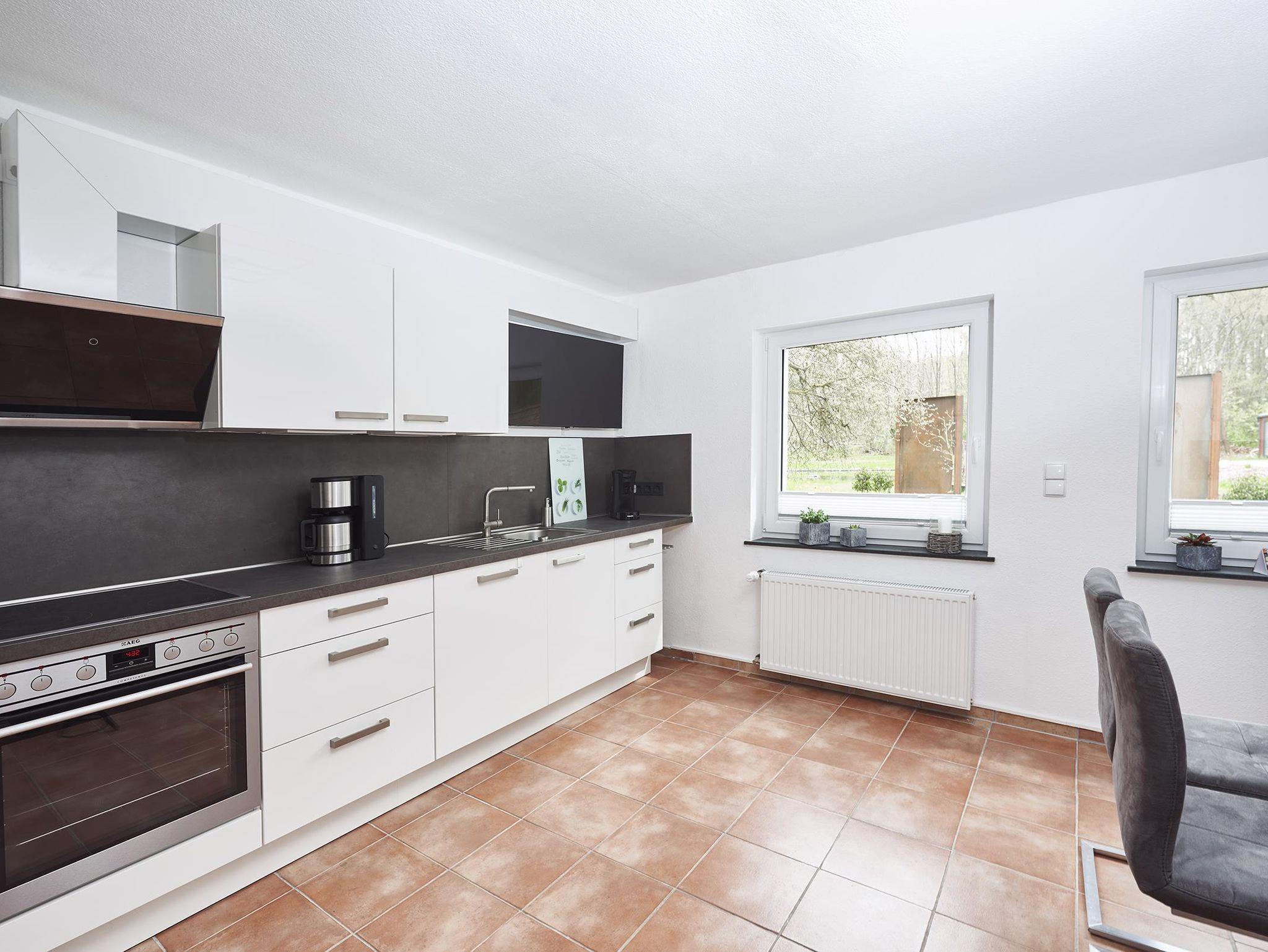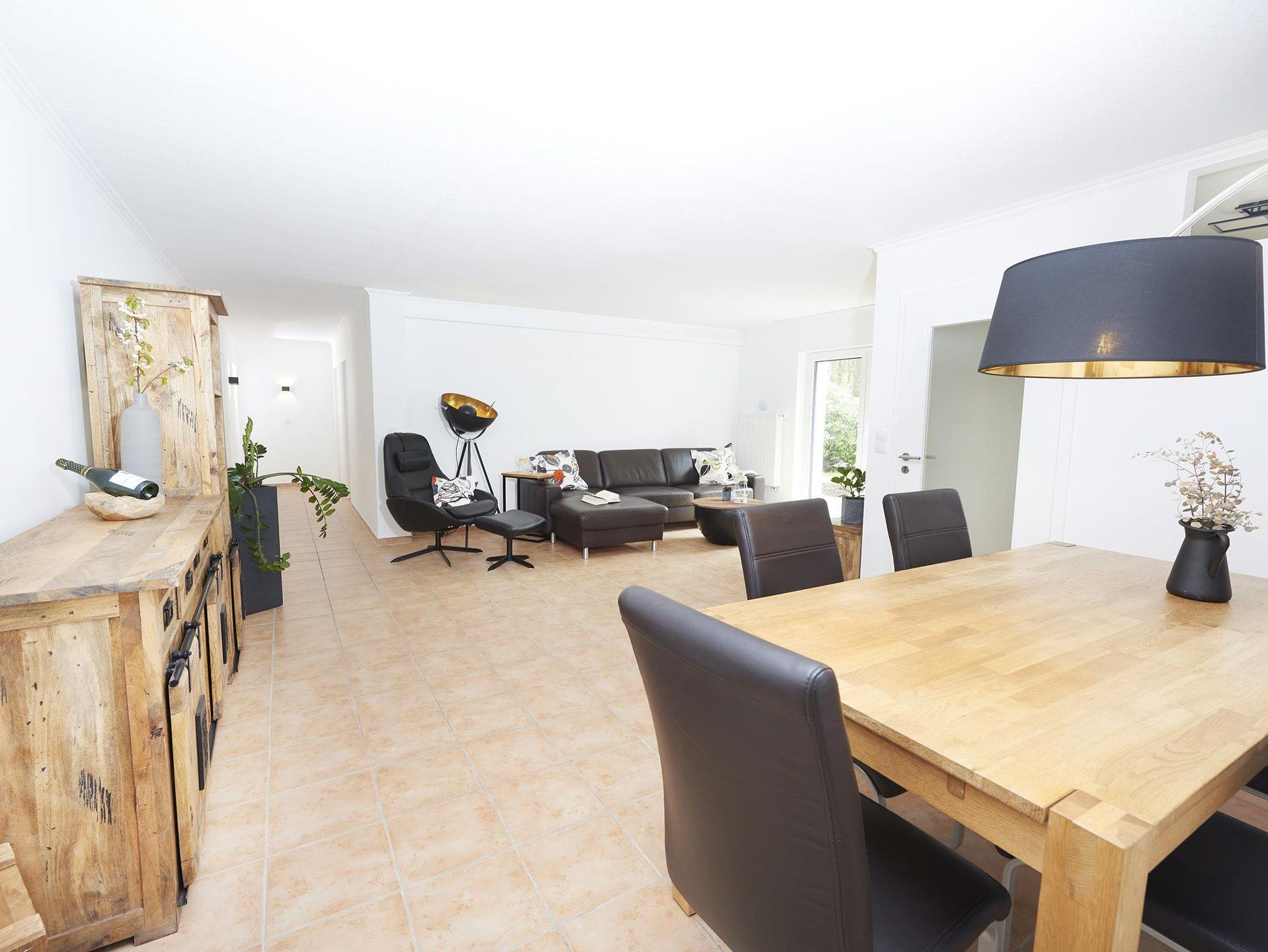 Die gemütlich eingerichtete Ferienwohnung bietet auf ca. 80 qm Platz für bis zu 4 Personen. Sie verfügt über eine modern eingerichtete Küche mit Geschirrspüler, Backofen, Mikrowelle, Kaffeemaschine, Toaster und Fernseher. Ein Schlafzimmer mit Boxspringbett und Flatscreen Fernseher. Weiteres Schlafzimmer mit zwei freistehenden Betten und Flatscreen Fernseher. Bad mit Regendusche, WC und Haartrockner. Wohn/Esszimmer mit Sofa, Relax-Sessel, Esstisch und großem Flatscreen Fernseher