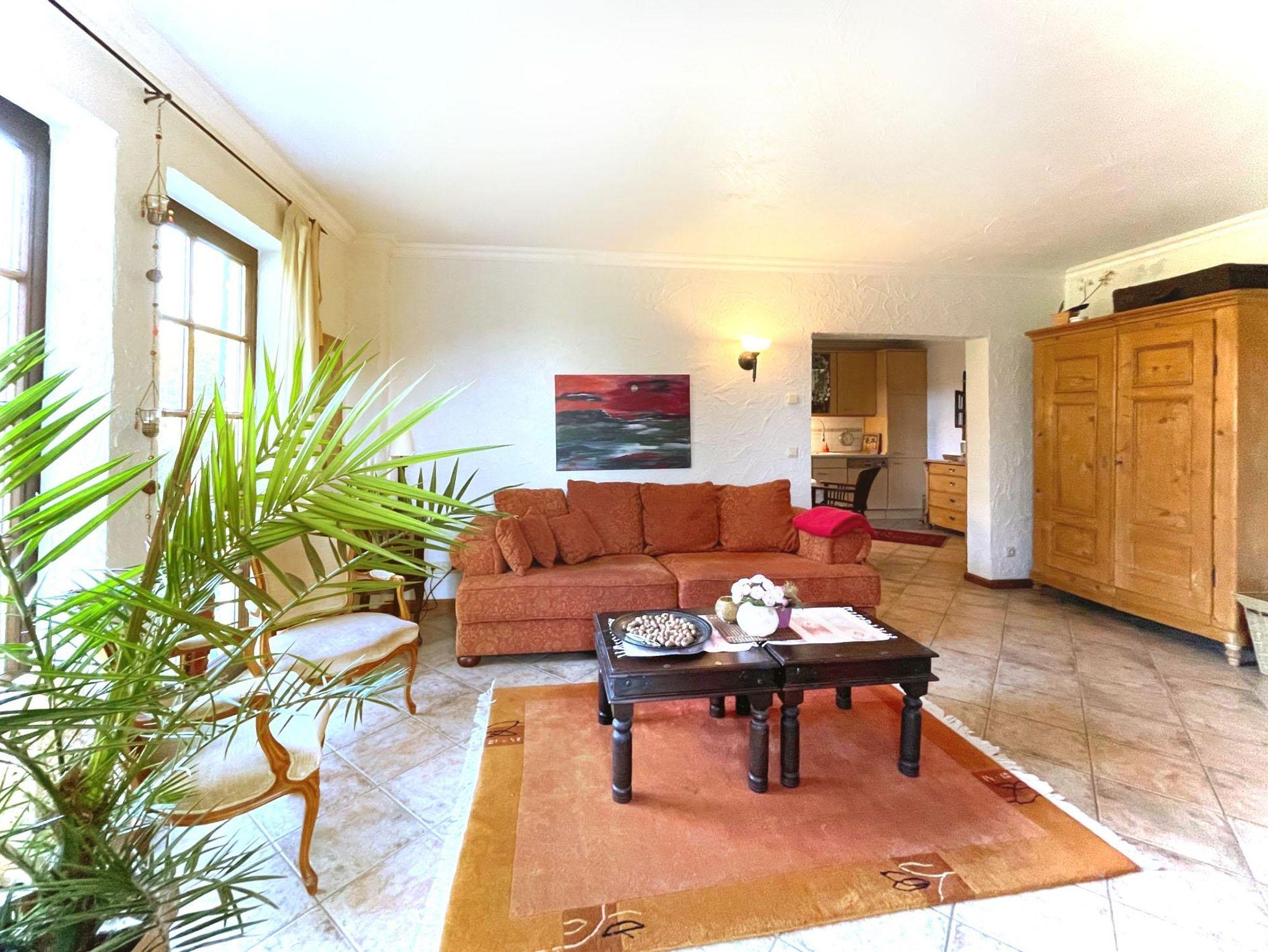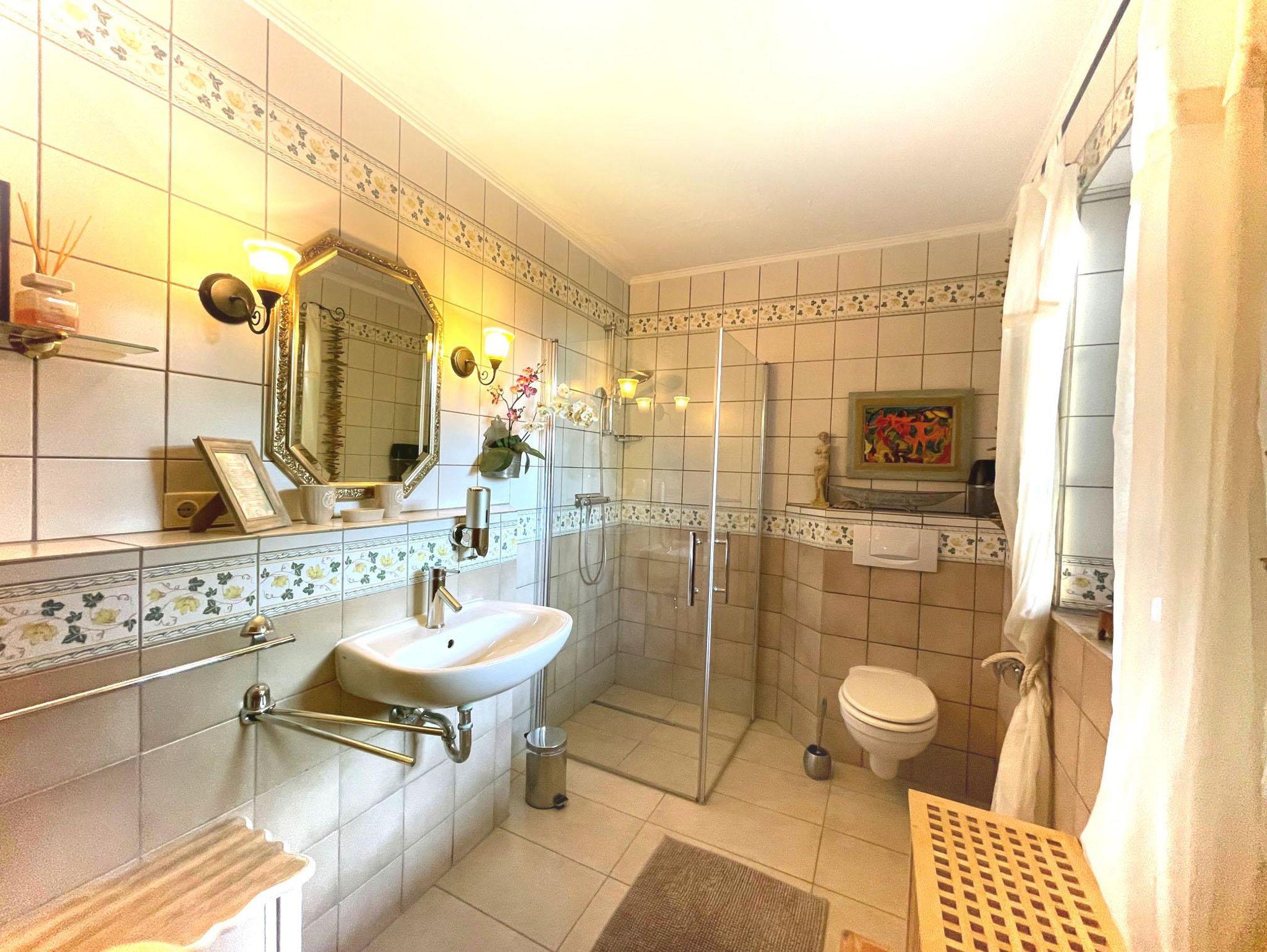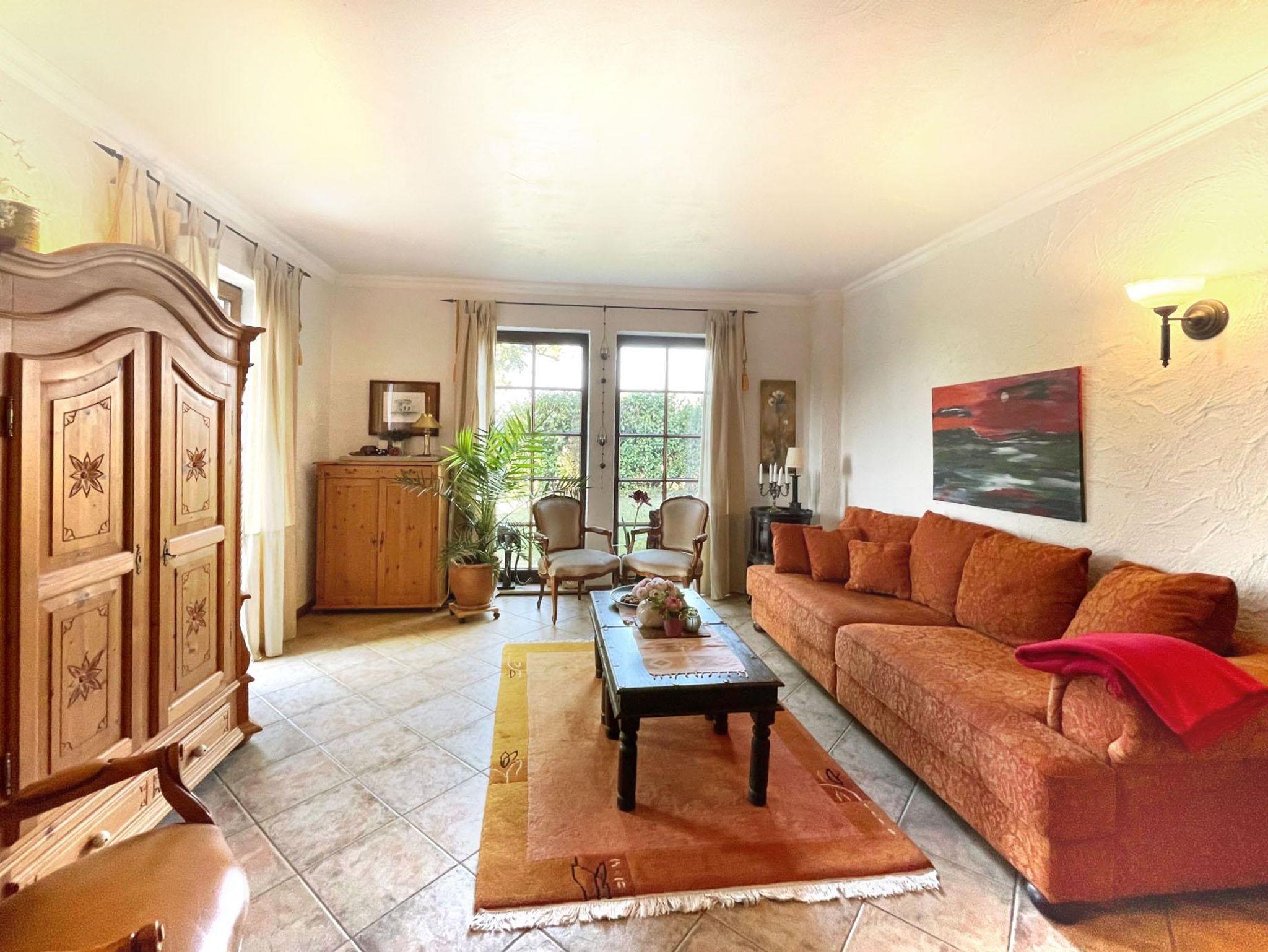 Hochwertig ausgestattet (60 qm) mit separatem Eingang im Untergeschoss: Großes, helles Wohnzimmer mit SAT-TV, DVD und Stereoanlage, Einbauküche mit Geschirrspüler, Mikrowelle, Kaffeemaschine, Toaster und Grill, 1 sep. Doppelschlafzimmer, großzügiges Bad mit Dusche, Föhn. Sonnenterrasse mit Gartenmöbeln.