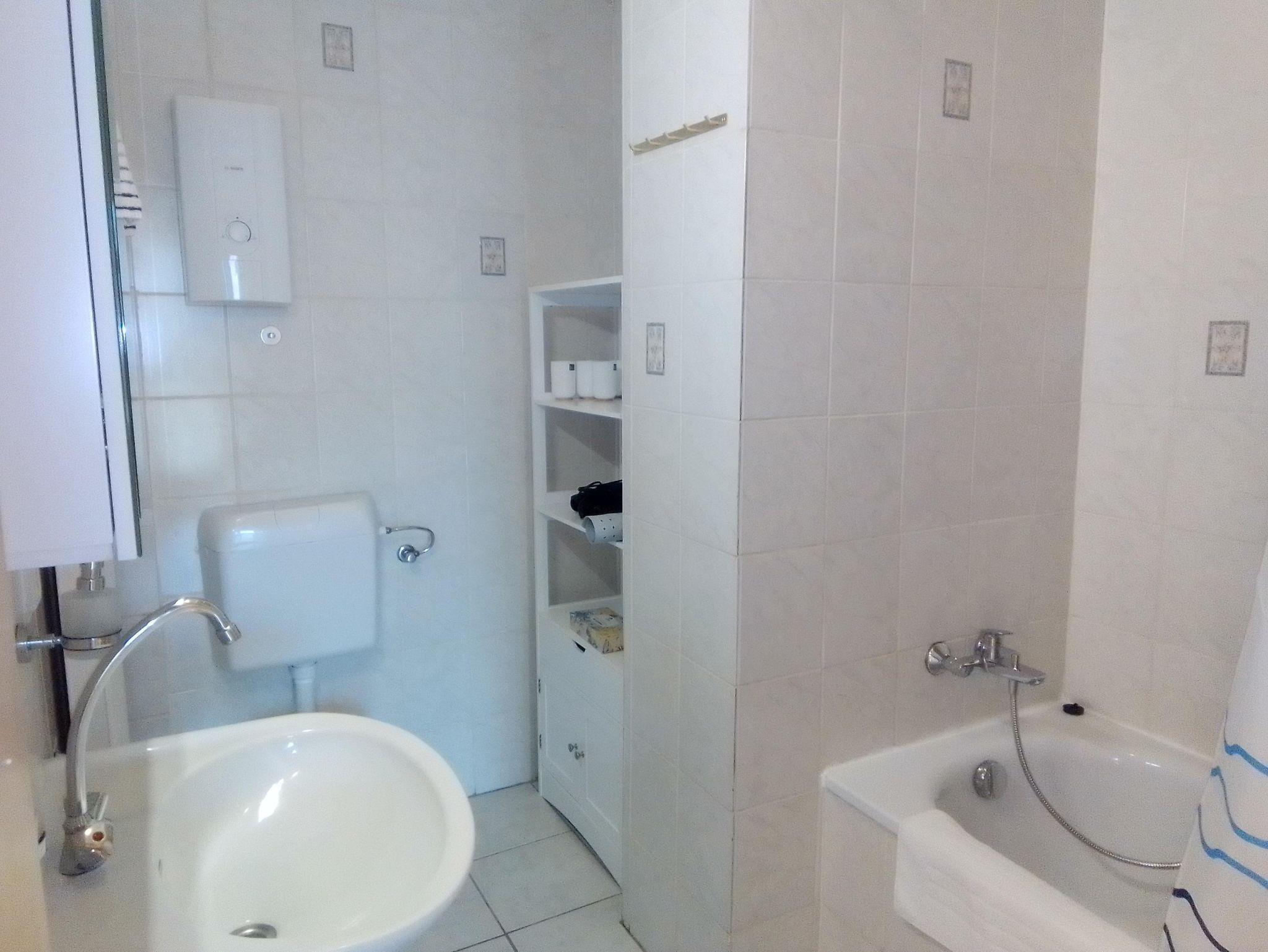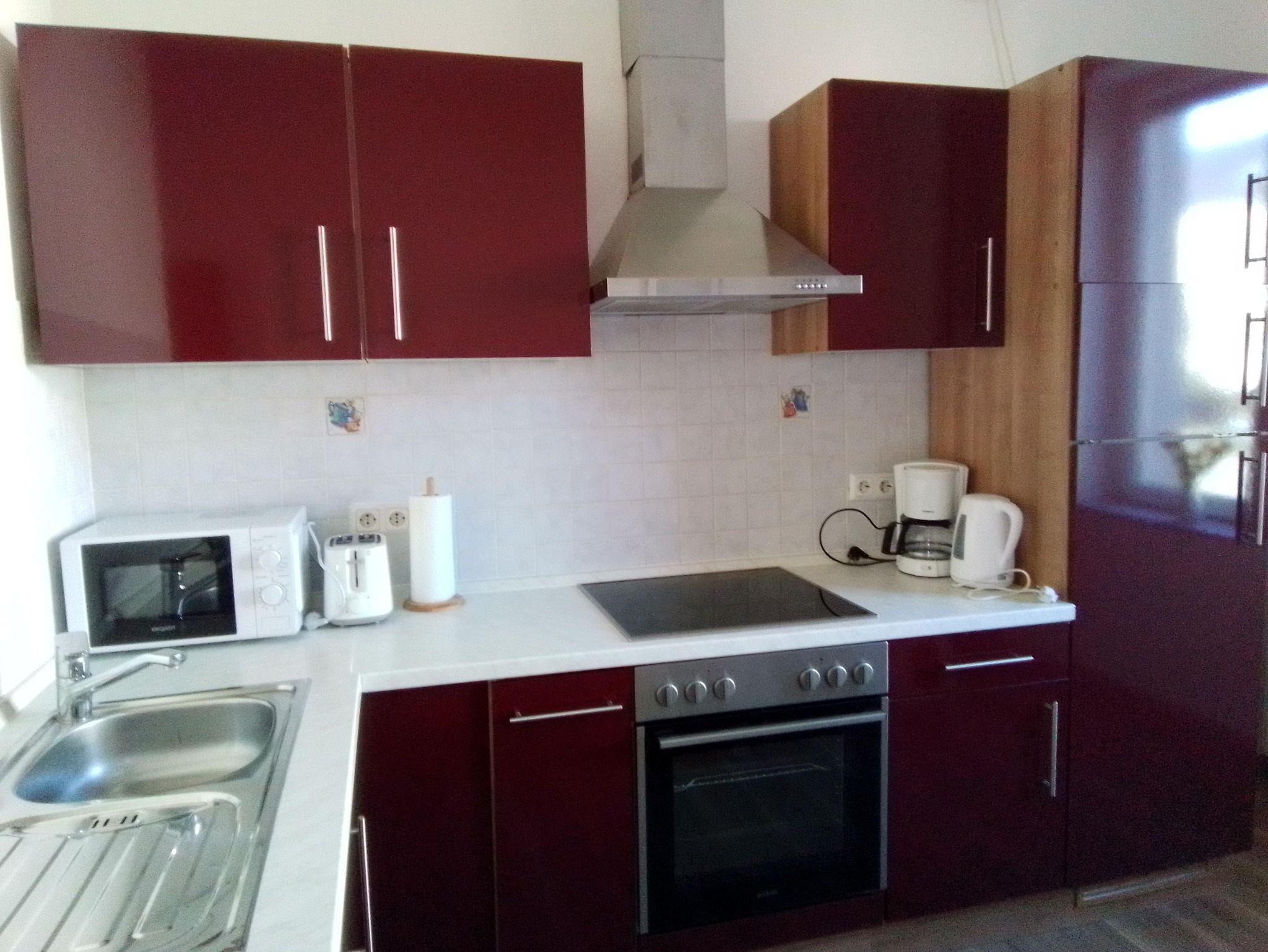 Außerdem hat die Wohnung ein Bad mit Badewanne und eine voll ausgestattete Küche mit kleinem Esstisch. Im 2. OG steht Ihnen eine Waschmaschine zur Verfügung, die sie ohne Aufpreis nutzen können. Auf Wunsch kann auch ein Kinderbett und ein Hochstuhl kostenlos zur Verfügung gestellt werden.