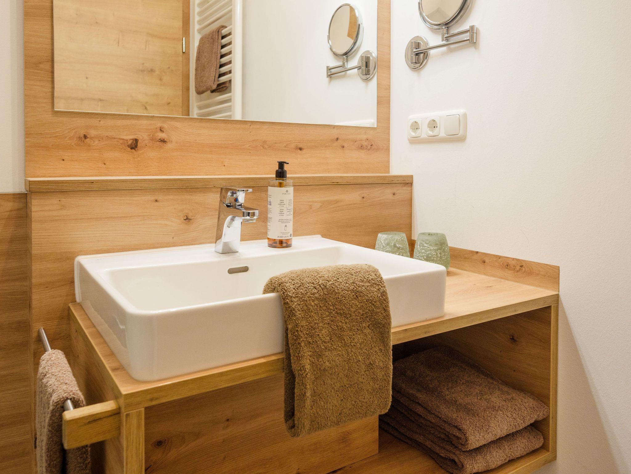 Im Bad befindet sich eine Dusche, ein Waschbecken, ein Handtuchheizkörper und ein WC.