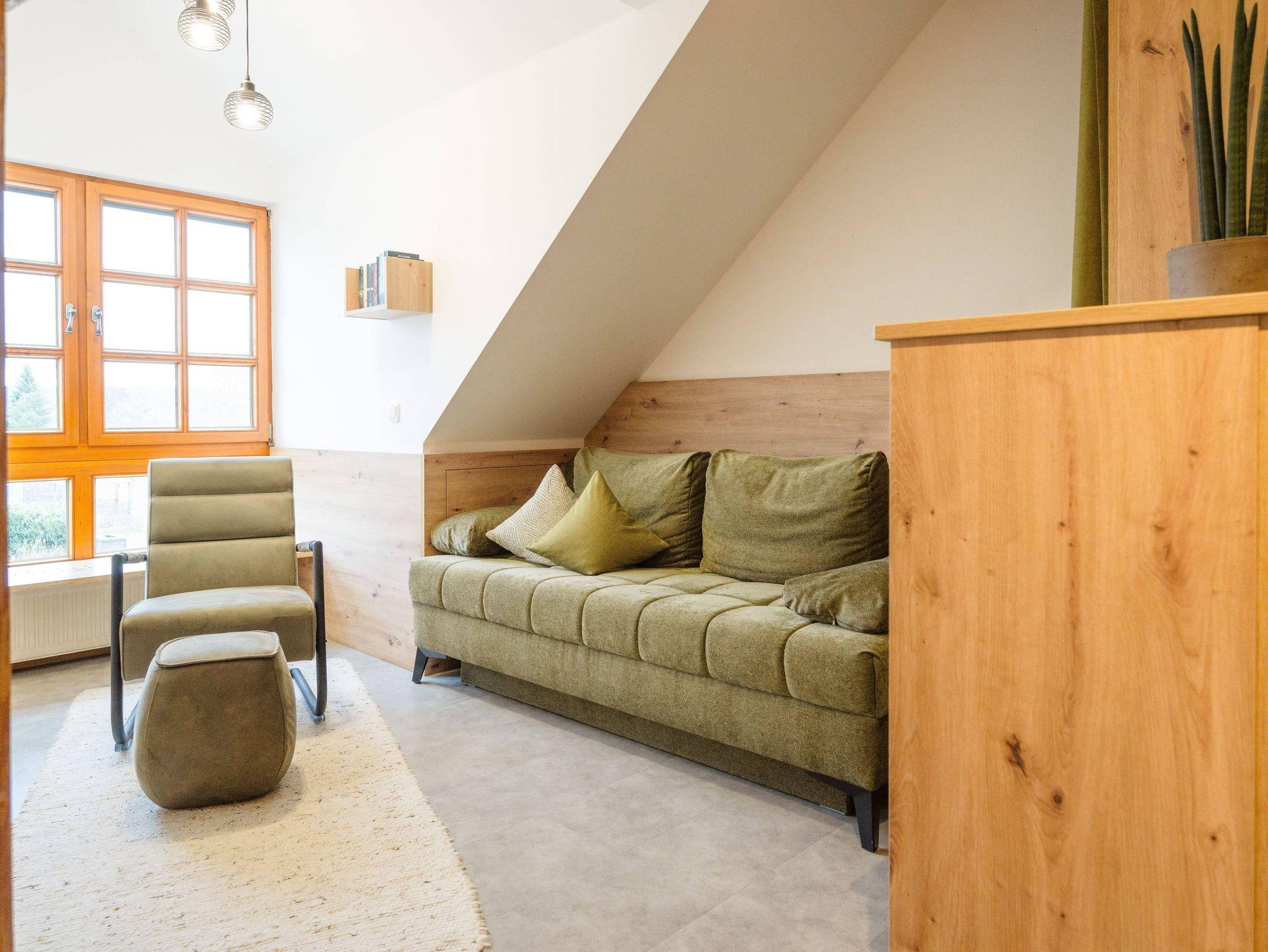 Das Apartment befindet sich im Dachgeschoss und bietet 36qm mit kombiniertem Wohn- und Schlafbereich. Das Doppelbett hat die Maße 180x200cm. Auf Wunsch lässt sich dieses auch teilen, sodass zwei Einzelbetten entstehen. Auf Anfrage ist eine Aufbettung für weitere Personen auf der Schlafcouch möglich. Diese lässt sich durch einen Vorhang etwas vom restlichen Wohnraum abtrennen. Selbstverständlich ist die Küchenzeile komplett ausgestattet: Kühlschrank, Backofen, Ceranfeld, Geschirrspülmaschine, Wasserkocher, Toaster, Kaffeemaschine und sämtliches Kochgeschirr sind vorhanden. Im Wohnraum befindet sich ein SMART-TV und ein Internetradio.