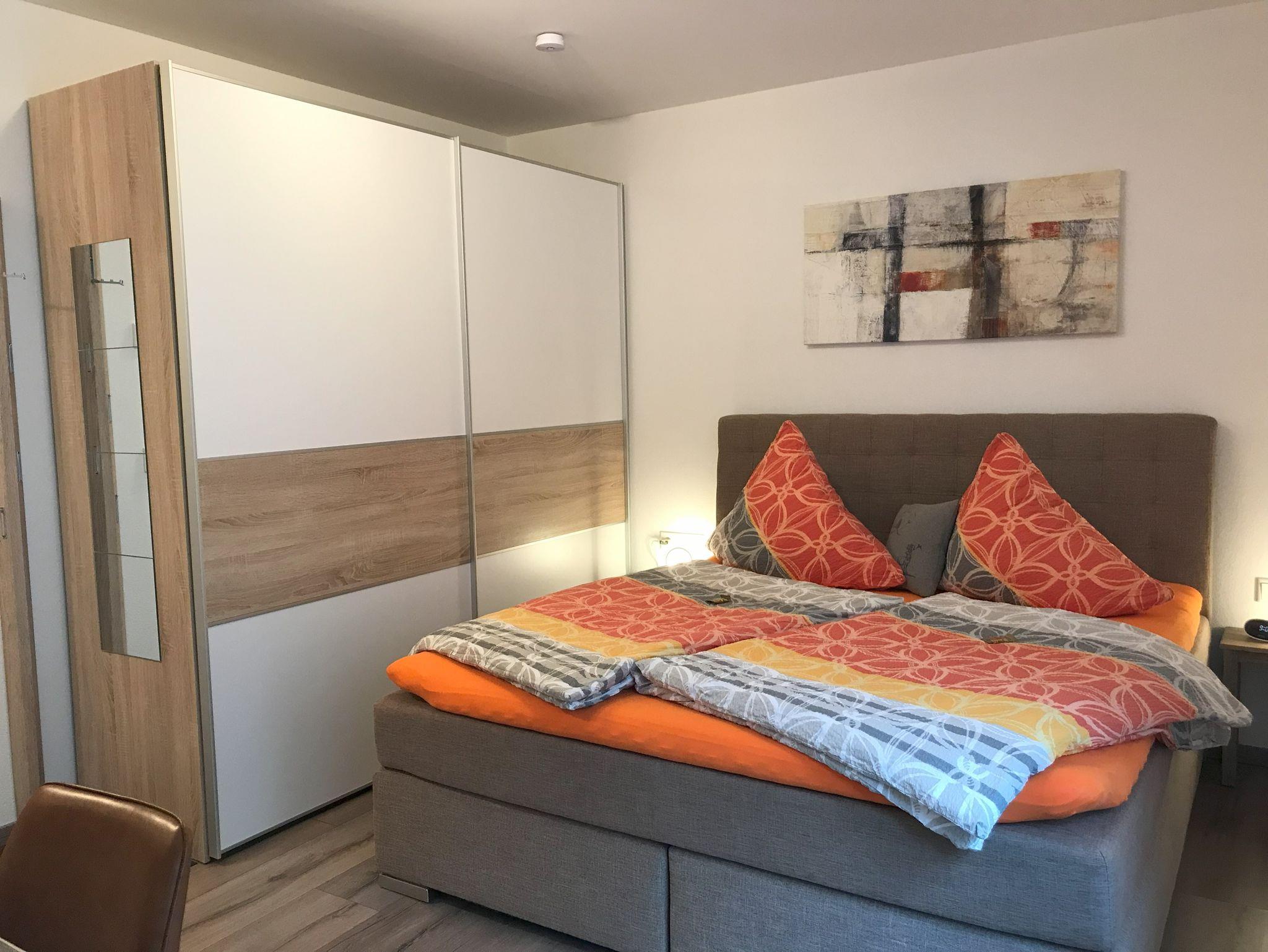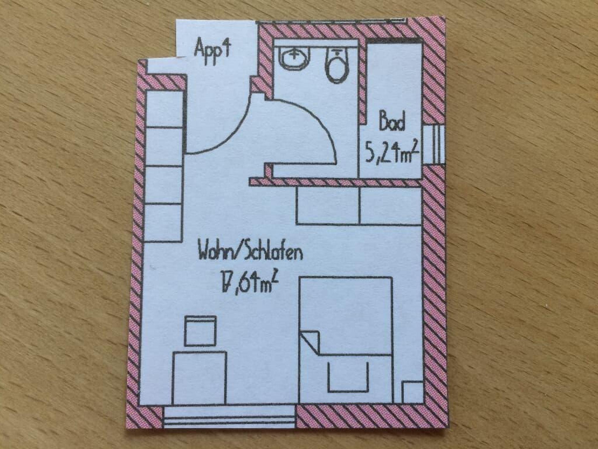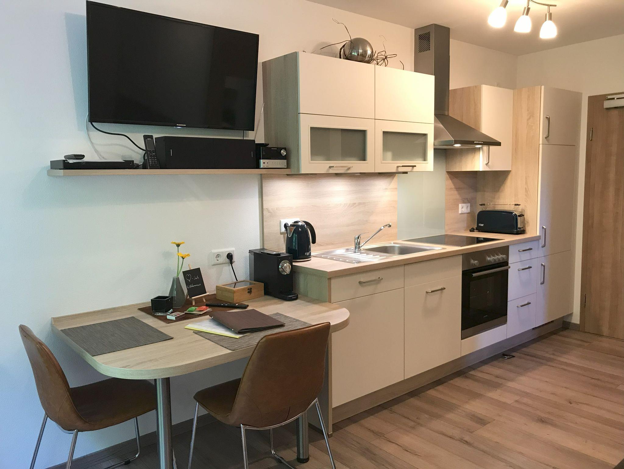 Unser kuscheliges, modern eingerichtetes 1 - Zimmer - Appartement mit 23 qm für max. 2 Personen ist ausgestattet mit einem Doppelbett (1.80 x 2,00 m), Küche und einem modernen Badezimmer mit begehbarer barrierefreier Dusche.