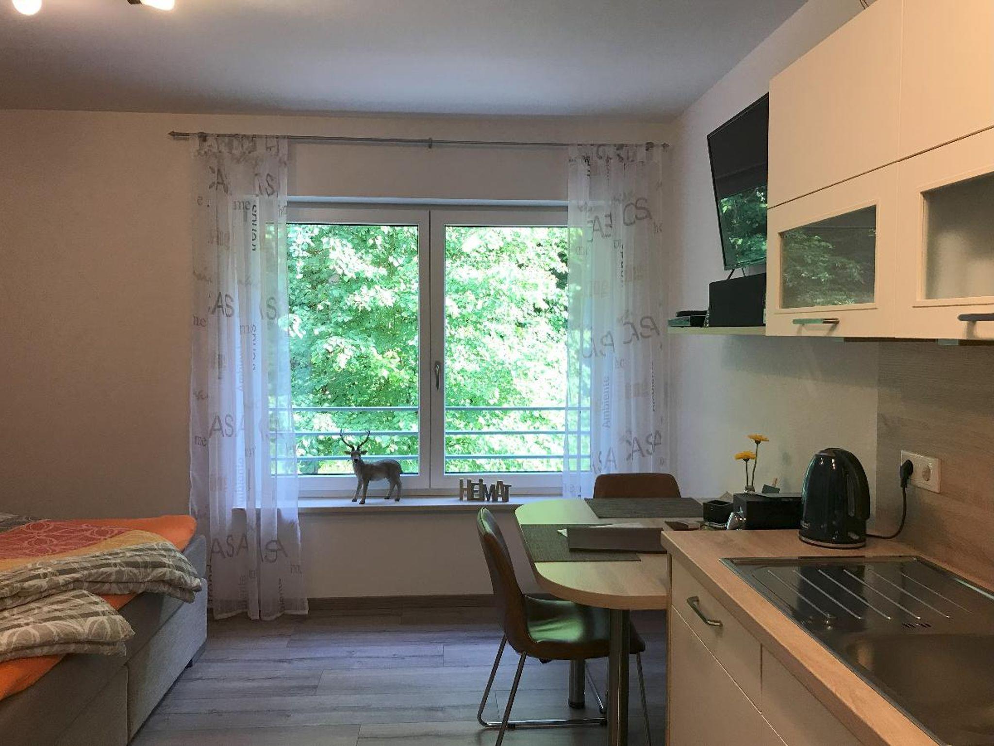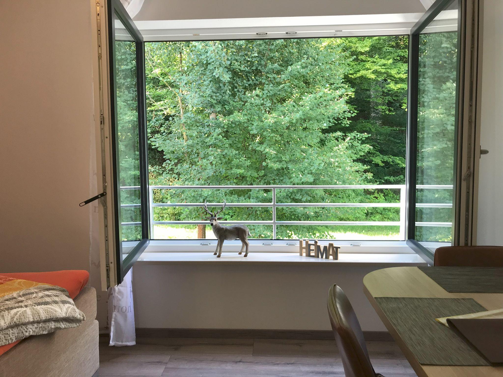 Das Appartement befindet sich im OG und hat einen schönen Ausblick in den Wald. Eine Sitzgelegenheit im Außenbereich ist vorhanden.