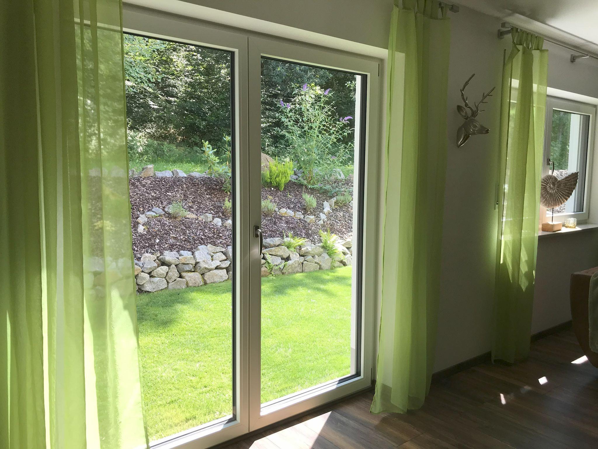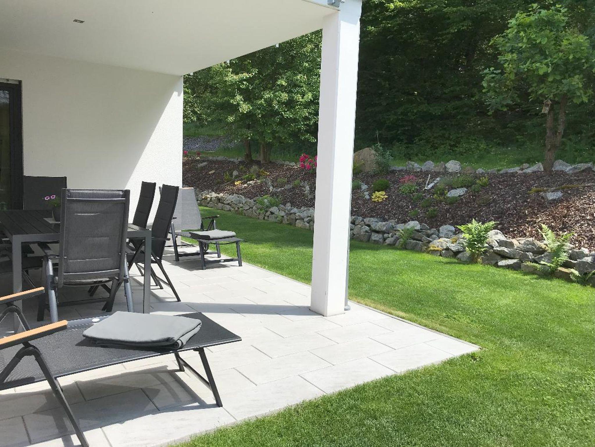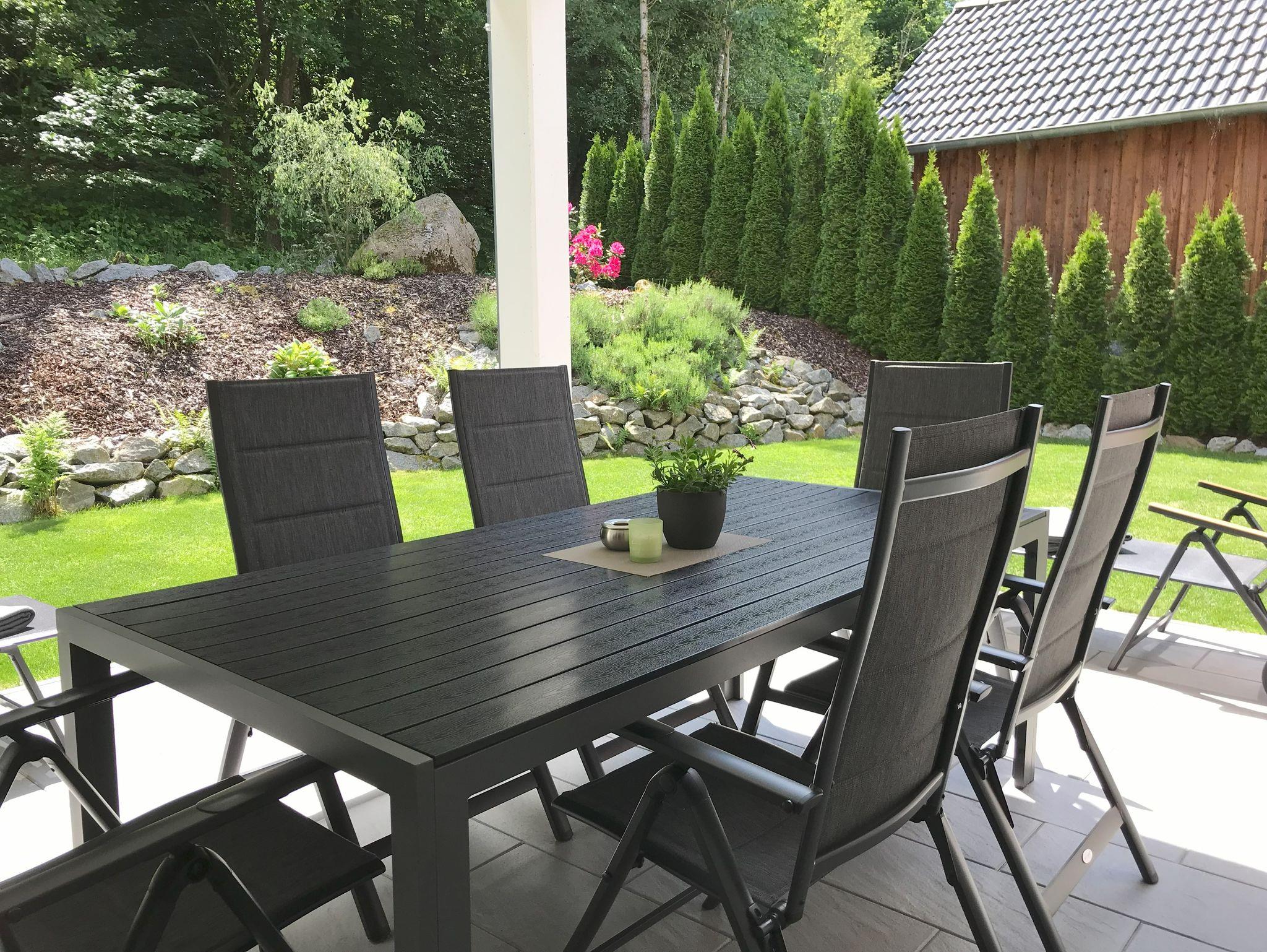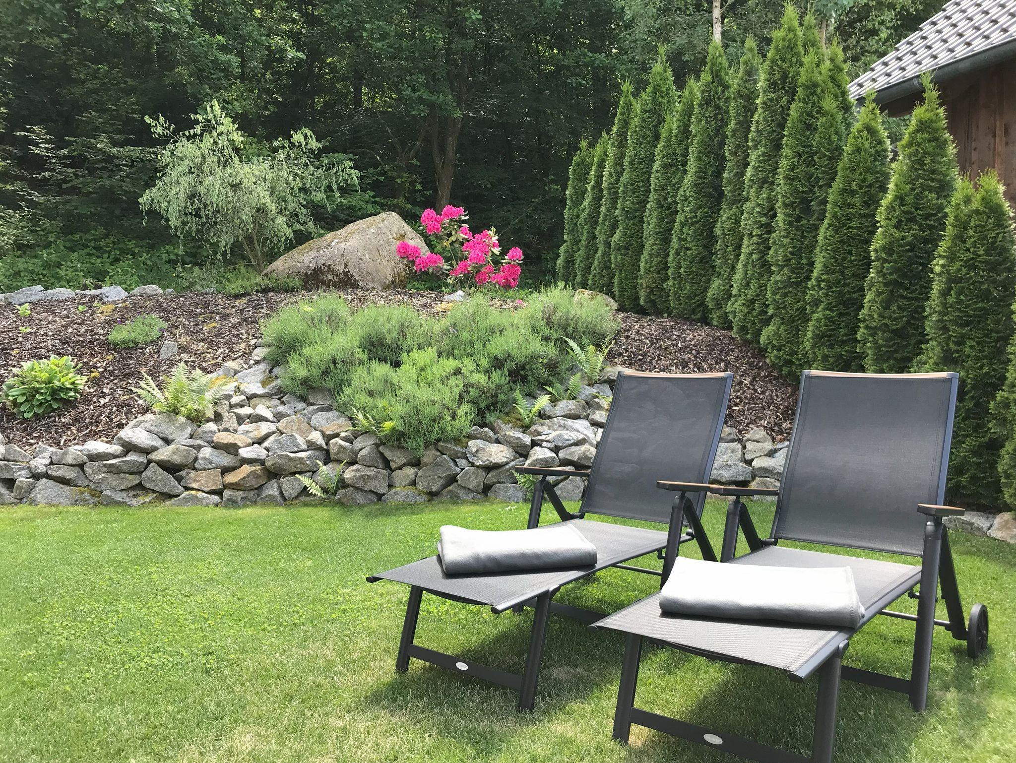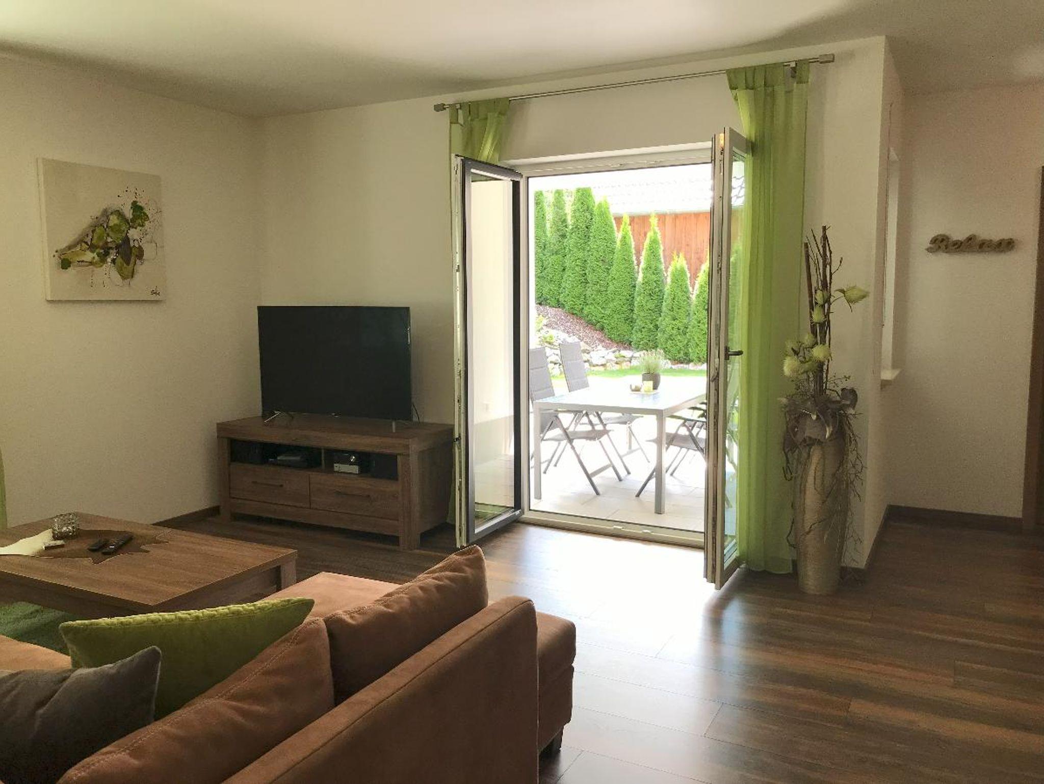 Das große Appartement befindet sich im Erdgeschoss mit Blick in den Wald. Auf der großen überdachten Terrasse mit Garten können Sie es sich gemütlich machen und den Ausblick in die Natur genießen.