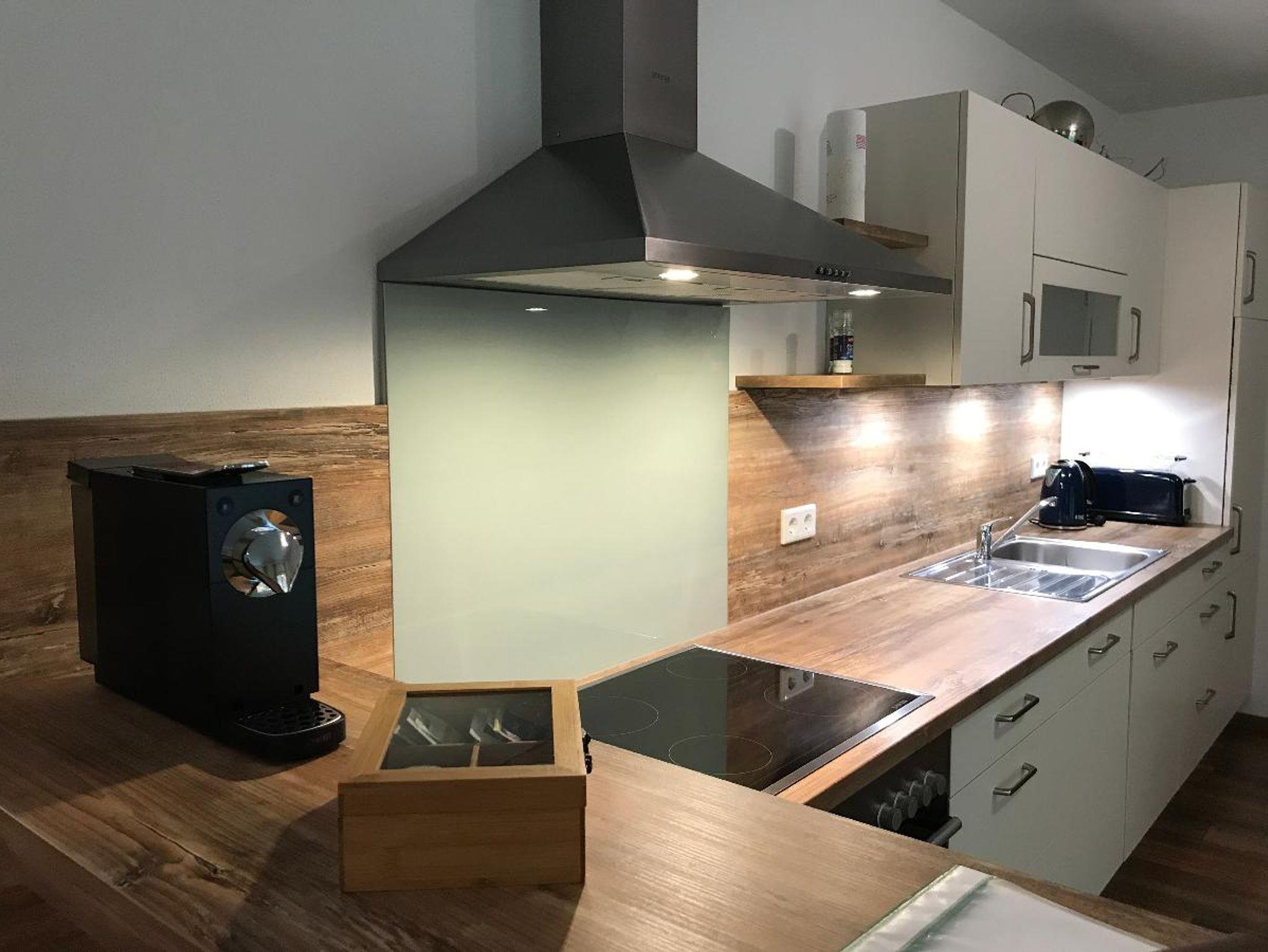 Küche: Geschirrspüler, Backofen, Ceranfeld, Kühlschrank mit Gefrierfach, Kaffeemaschine, Toaster, Wasserkocher