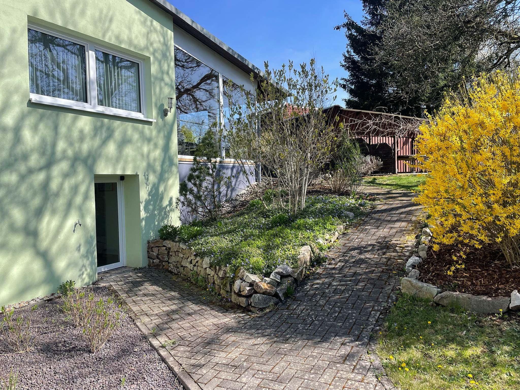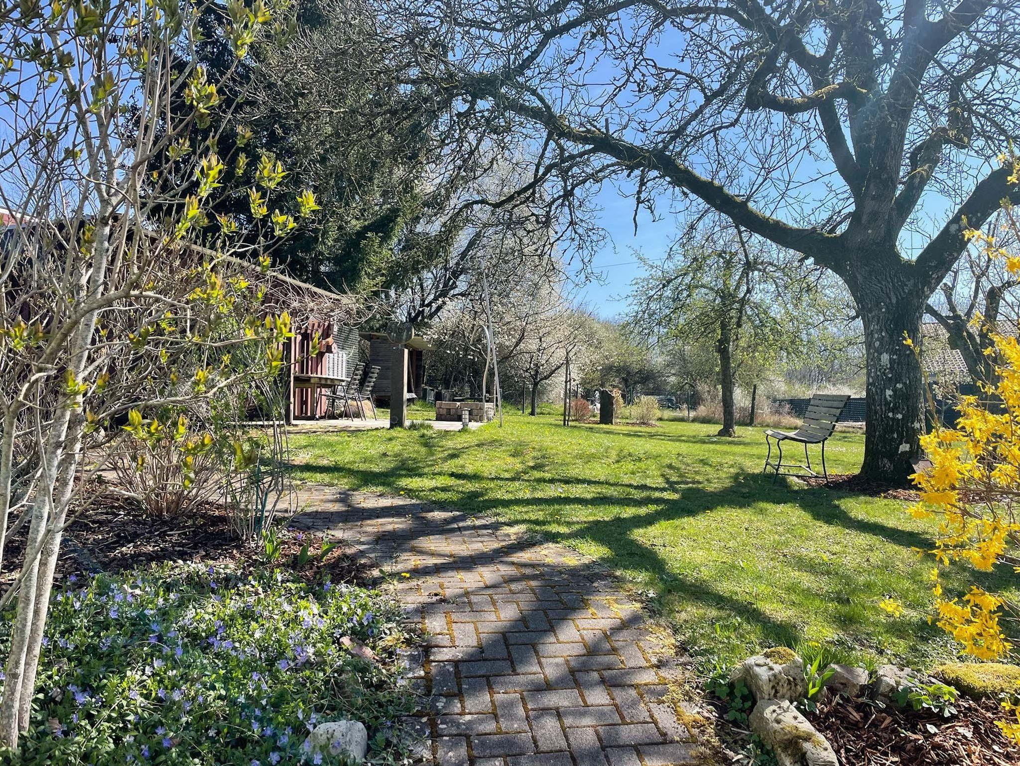 Das weitläufige Grundstück begeistert mit einer gepflegten Rasenfläche, alten Obst- und Zierbäumen, einem kleinen Kräutergarten sowie einem stilvoll angelegten Gräsergarten. Eine gemütliche Terrasse mit Natursteinmauerung und gemauerter Grillstelle lädt zum Verweilen und Genießen ein – perfekt für entspannte Urlaubstage im Grünen.