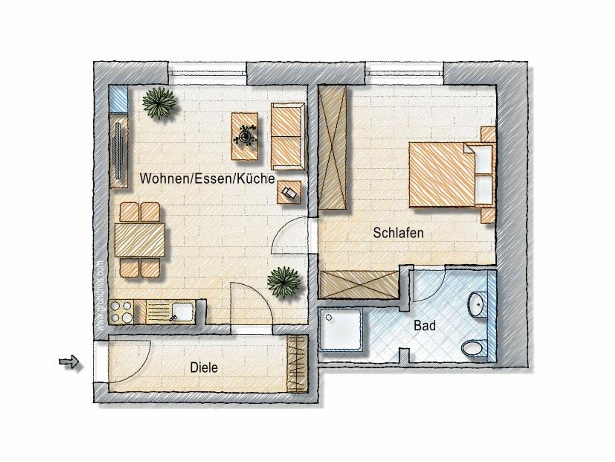Perfekter Wohnkomfort auf kleinem Raum! Bestehend aus Diele, Wohn-/Essbereich und Schlafzimmer mit angrenzendem Bad mit ebenerdiger Dusche zeichnet sich dieses Apartment vor allem durch seine ruhige Lage mit Blick in den Garten aus. Ein separater Schreibtisch sorgt dafür, dass sich auch Geschäftsreisende hier rundum wohl fühlen.