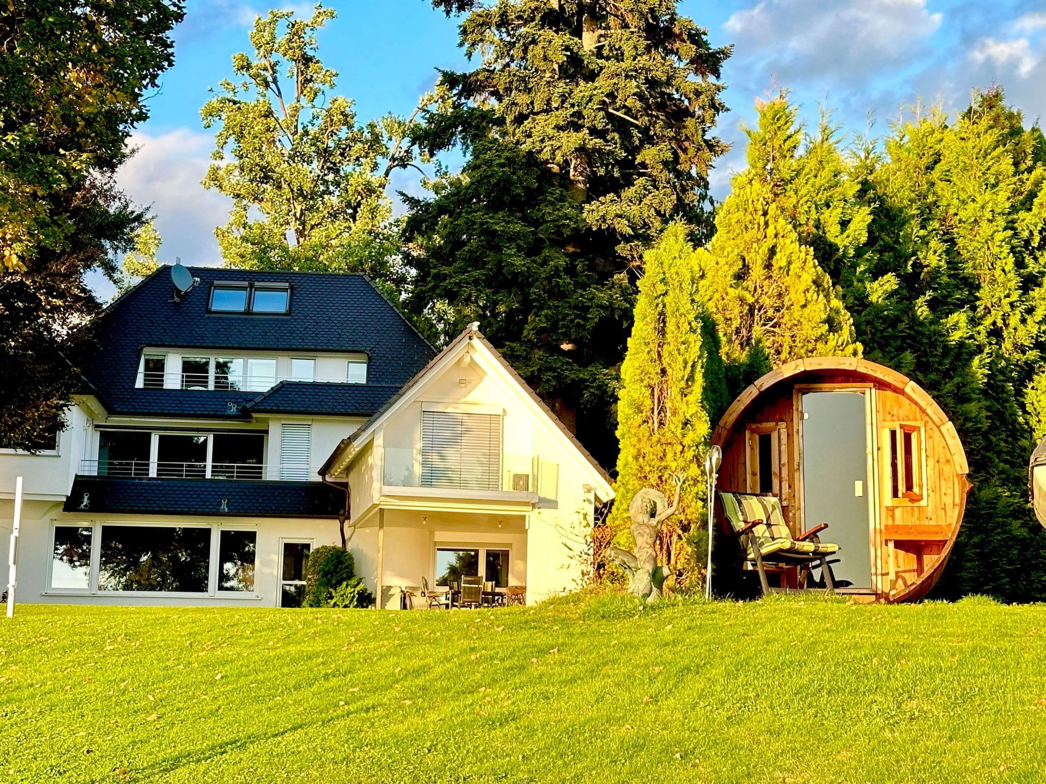 Villa Noho promises unforgettable holiday experiences in a dreamlike setting! It is nestled in a garden with centuries-old trees and offers a particularly high quality of life. The solid concrete walls of the house ensure a pleasant indoor climate, while the excellent air quality in Nonnenhorn and the fresh breeze from Lake Constance further enrich the atmosphere.