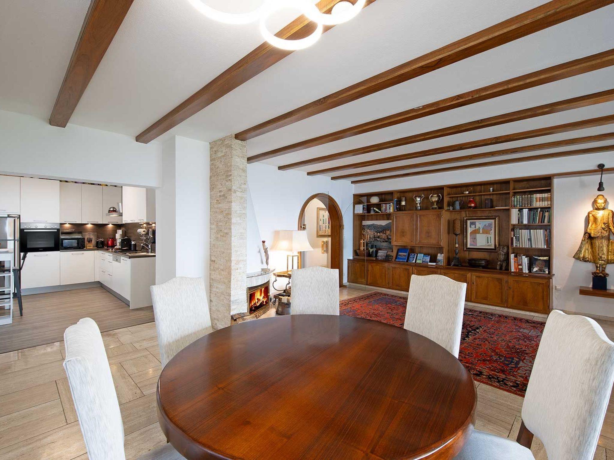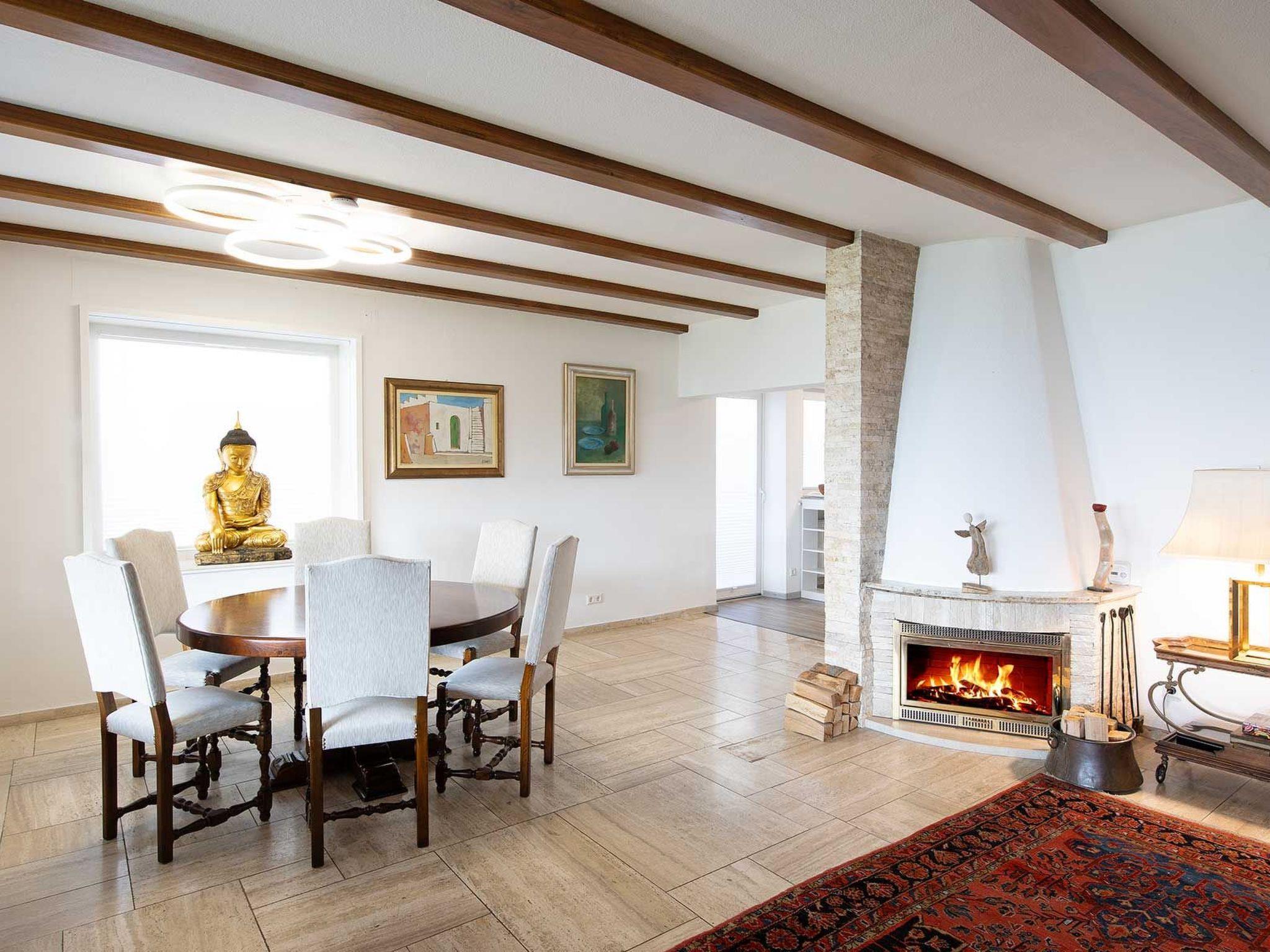 The living area invites you to relax with a large dining table and a fireplace.