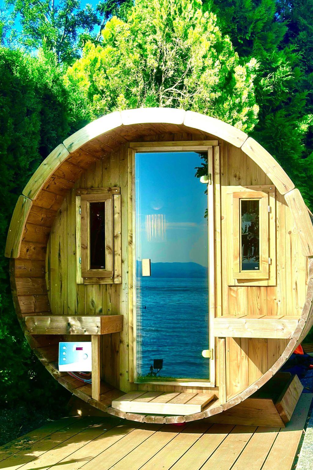 Close to the beach is our barrel sauna, just a few steps from the lake, which can accommodate up to four seated people.