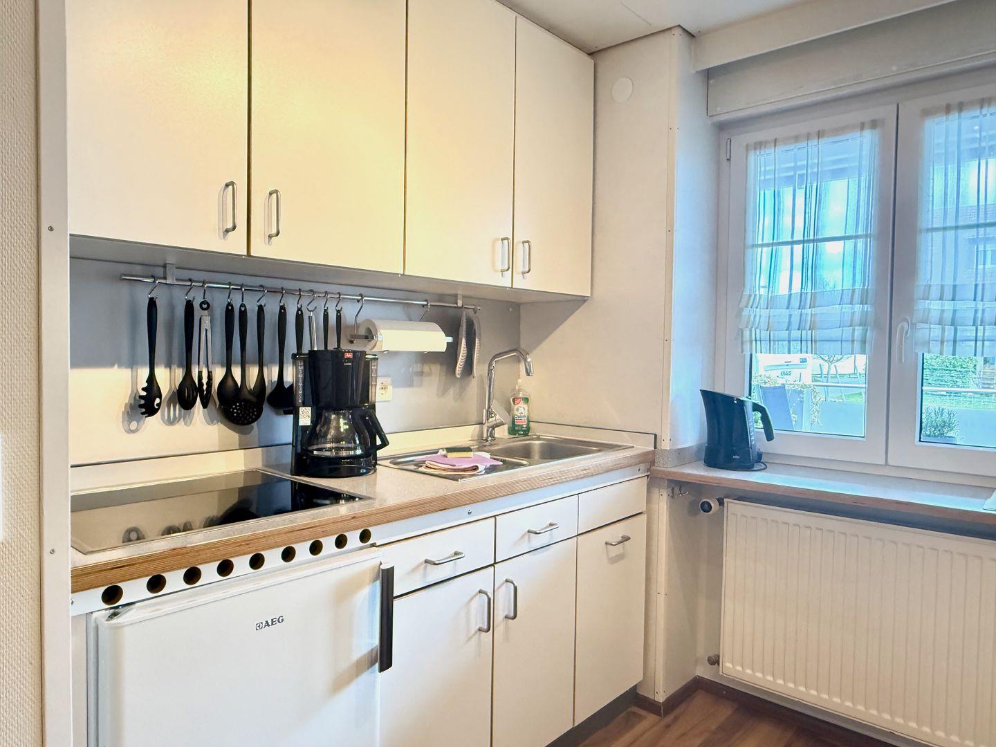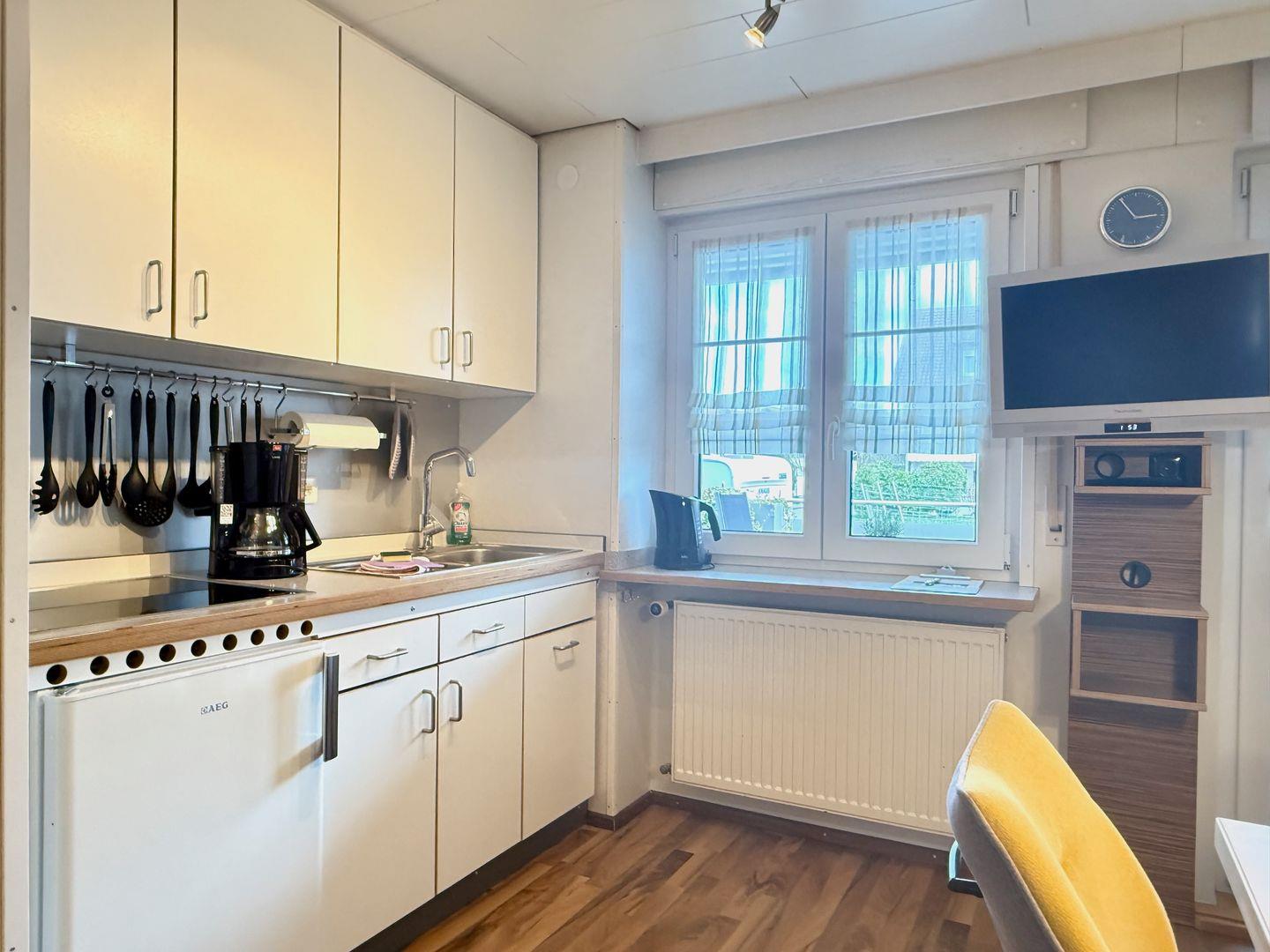 Der Wohn- und Essbereich ist der zentrale Treffpunkt der Wohnung. Hier finden Sie eine voll ausgestattete Einbauküche mit allem, was das Herz begehrt: ein 4-Platten-Ceranfeld, Kühlschrank, Kochutensilien, Kaffeemaschine, Wasserkocher, Toaster, Eierkocher, Salatschleuder und ein Handrührgerät – ideal für gemeinsame Kochabende. Die gemütliche Sitzecke mit Blick auf den großen Balkon lädt zum Entspannen, TV-Schauen oder zu gemeinsamen Mahlzeiten ein.