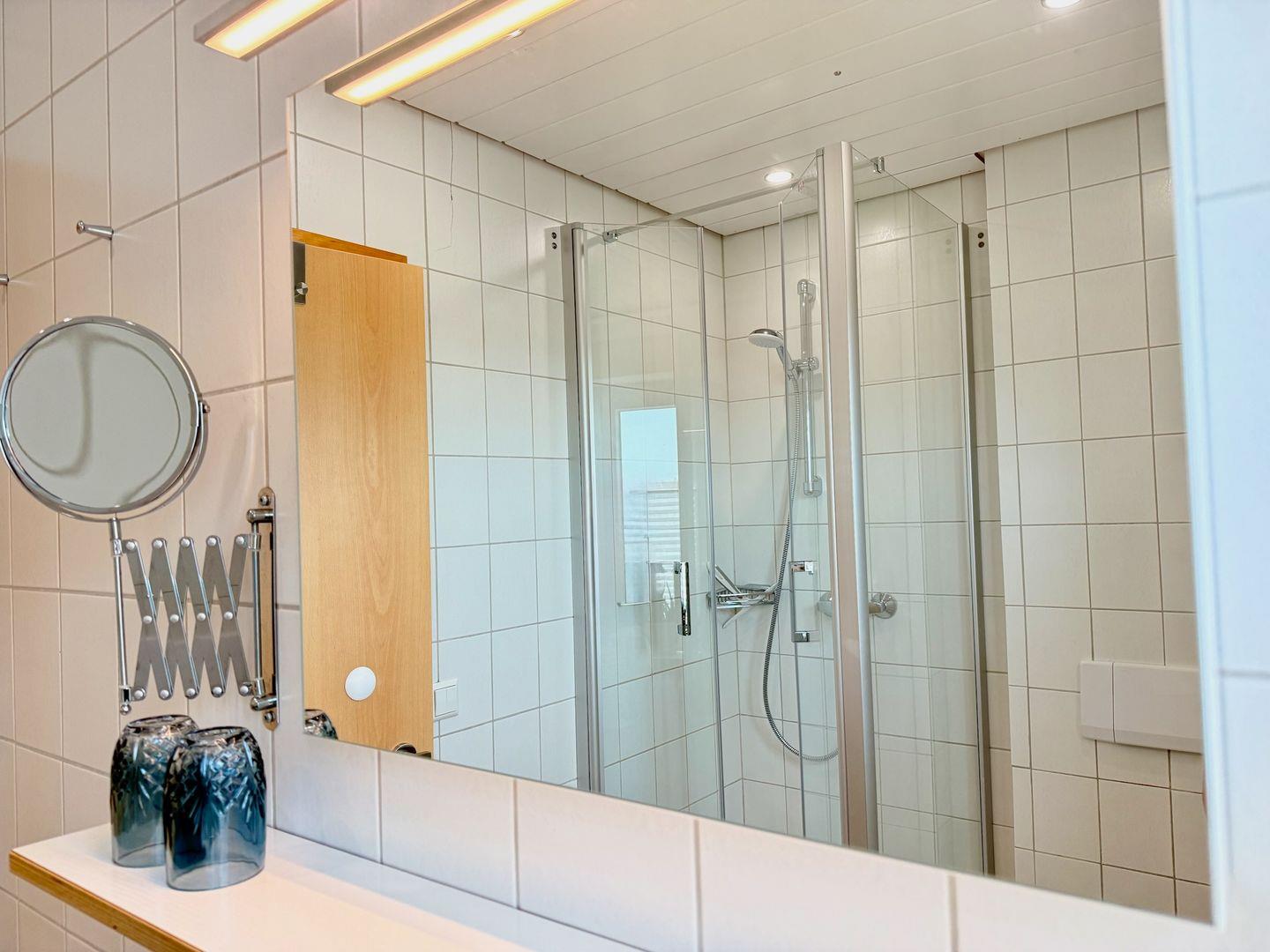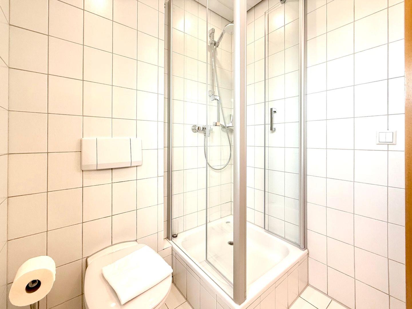 Das Badezimmer verfügt über eine Dusche und ein WC und sorgt für einen angenehmen Start in den Tag.