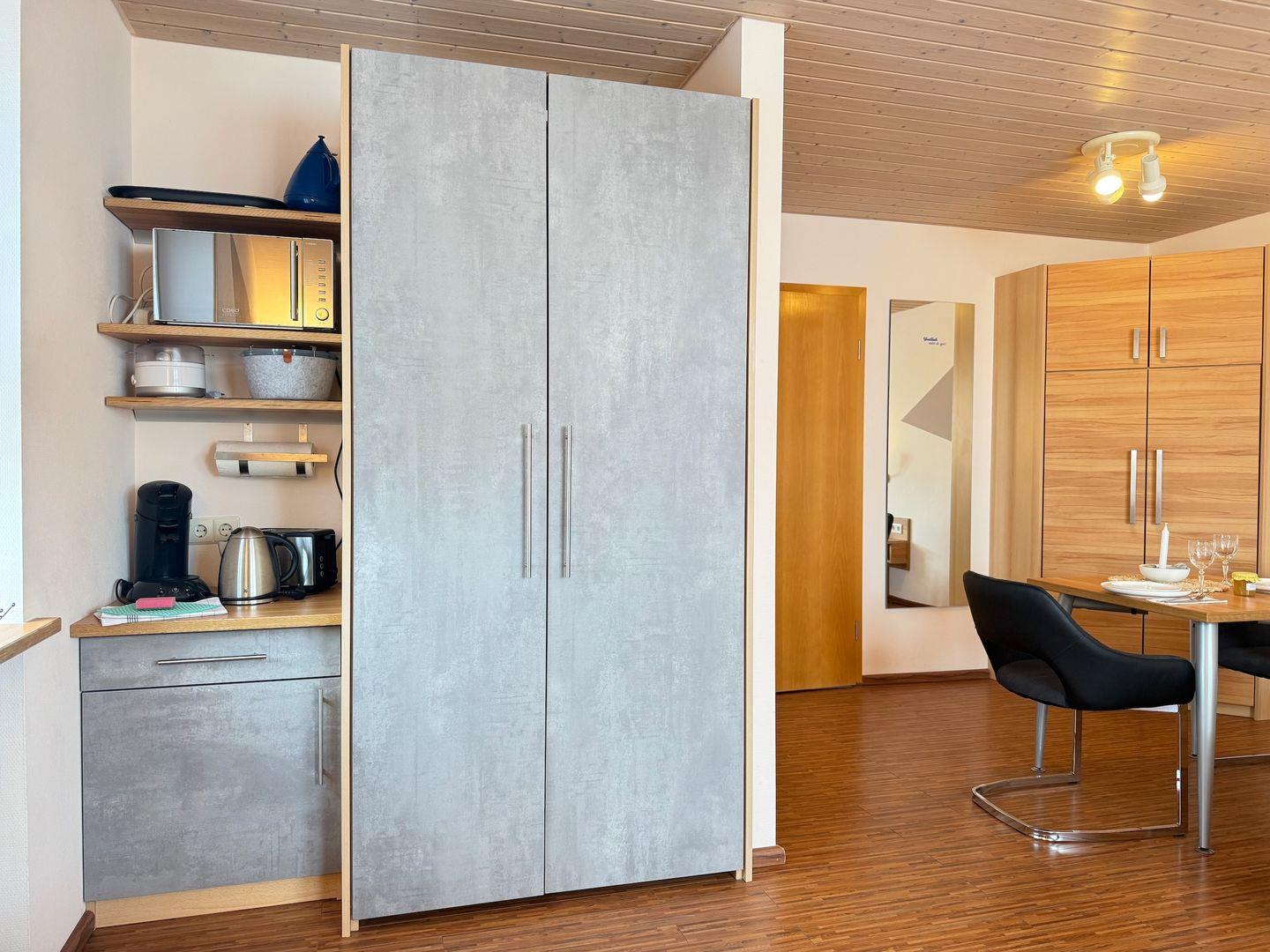 Der kombinierte Wohn- und Schlafraum ist komfortabel und praktisch gestaltet. Hier erwartet Sie ein bequemes Doppelbett, ein geräumiger Kleiderschrank, eine gemütliche Sitzgelegenheit mit Couch und Tisch sowie ein Farb-Sat-TV und ein anwählbares Telefon. Die integrierte Pantryküche ist mit einem 2-Plattenherd, Kühlschrank, Kaffeemaschine (Pads), Wasserkocher, Toaster, Eierkocher und allem nötigen Kochzubehör ausgestattet – ideal für kleinere Mahlzeiten oder ein Frühstück mit Aussicht.