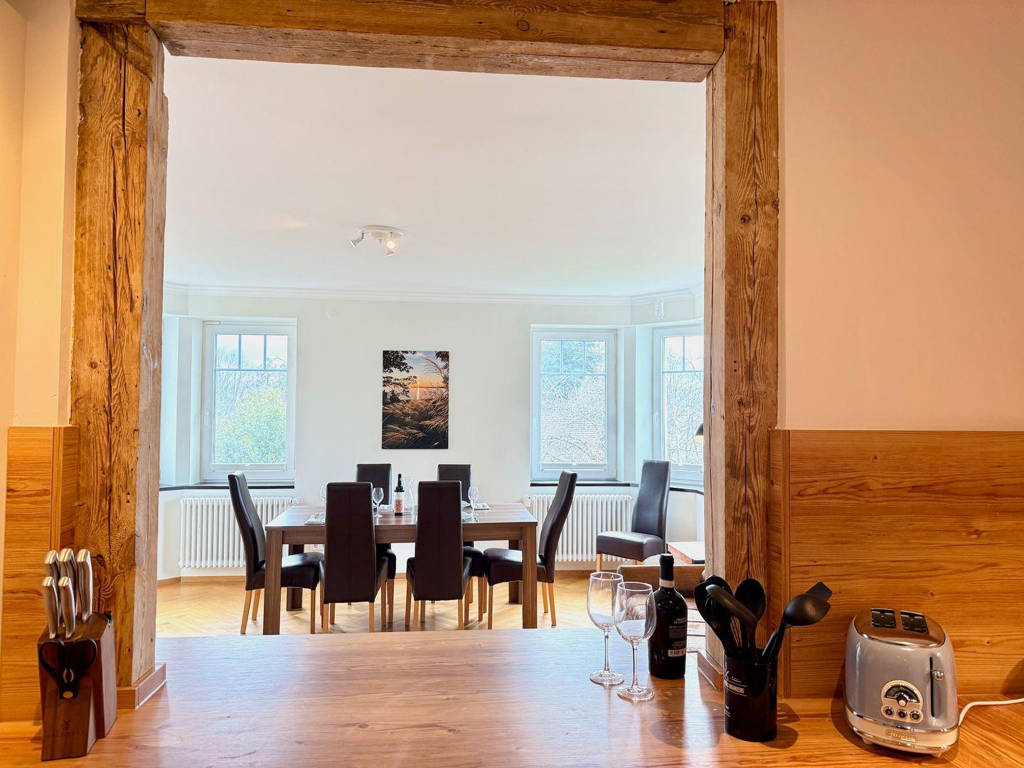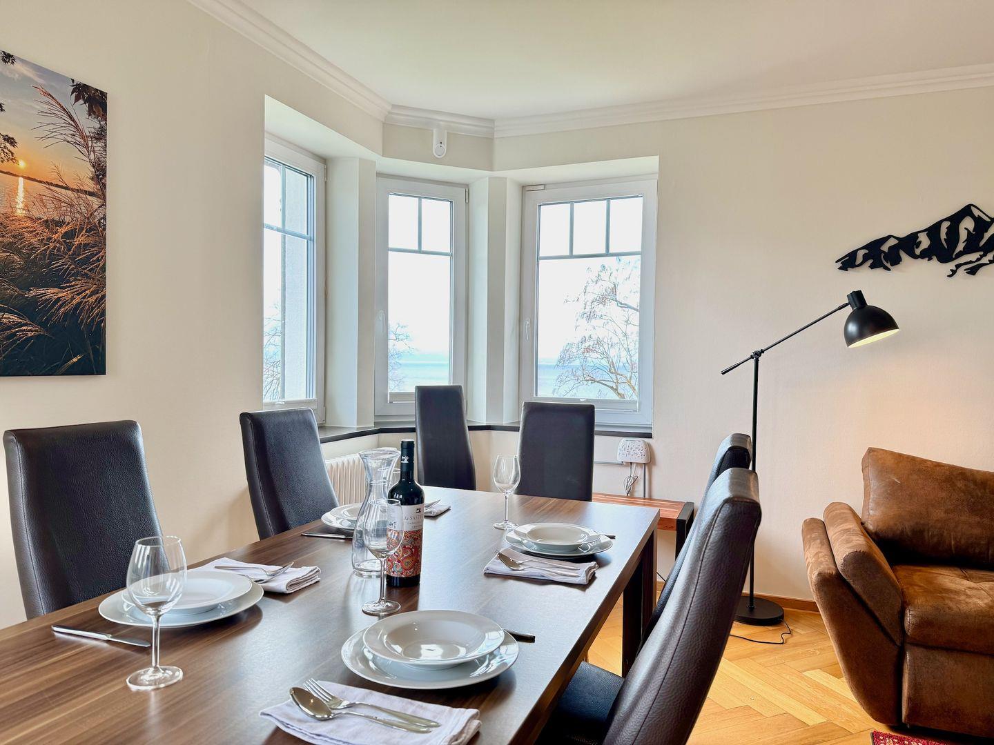 Ihr vollausgestattetes Domizil im 2. OG der Villa ist mit dem Aufzug erreichbar und auf dem neuesten technischen Stand. Eine neue Küche mit hochwertigen Geräten und einer praktischen Durchreiche zum Essbereich sorgt für kulinarischen Komfort. Der Ess-/Wohnbereich mit Couch und TV bietet Ihnen direkte abwechslungsreiche Sicht auf den Bodensee. Die Couch kann bei Bedarf zu einem Schlafsofa zur zusätzlichen Schlafgelegenheit für Kinder und junge Erwachsene umfunktioniert werden.