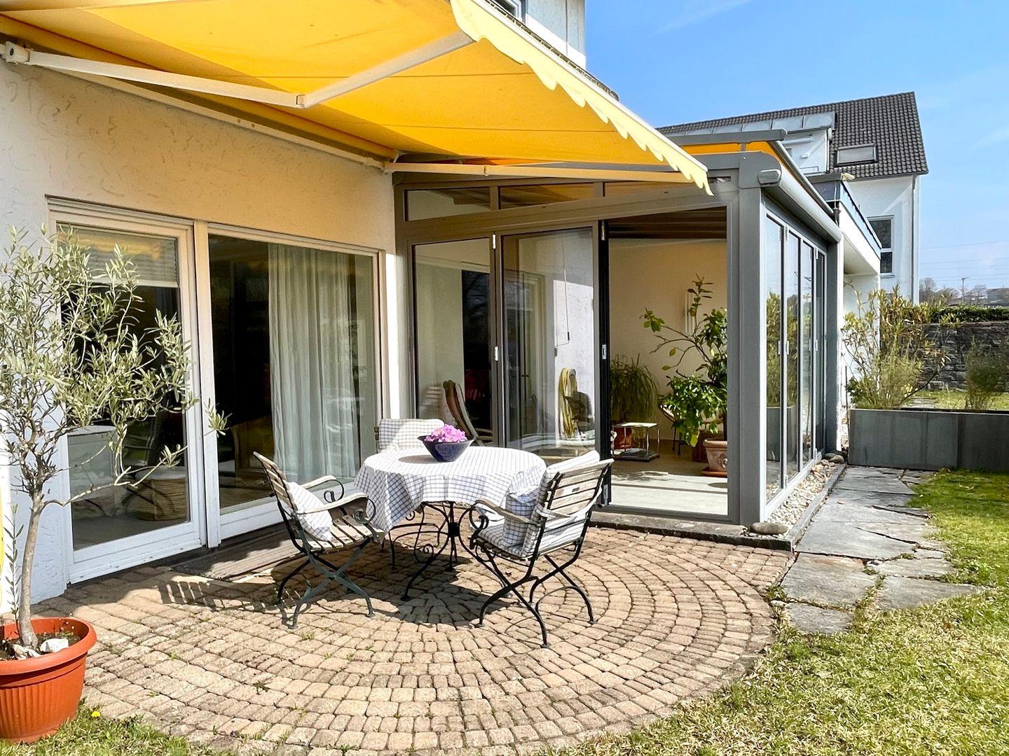 Der gemütliche Wohnbereich mit Sofaecke, Essplatz und TV lädt zum Entspannen ein. Ein heller Wintergarten erweitert den Wohnraum und schafft eine angenehme Atmosphäre. Von hier aus gelangen Sie direkt auf die Terrasse mit Garten und Liegewiese. Gartenmöbel und Sonnenliegen stehen bereit – ideal, um die frische Seeluft zu genießen. Vom Grundstück aus haben Sie Gartenblick und teilweise auch einen kleinen Blick auf den Bodensee.