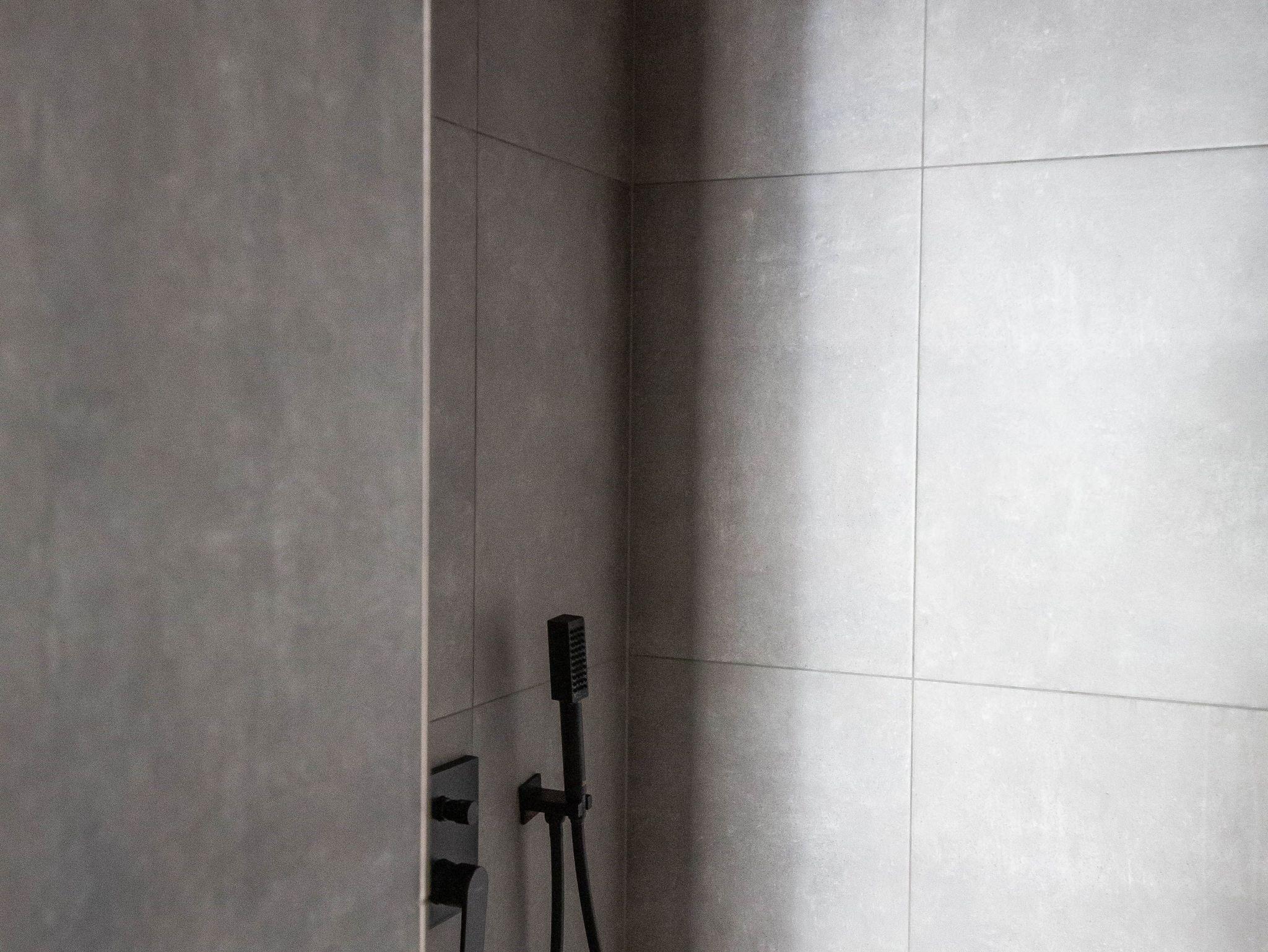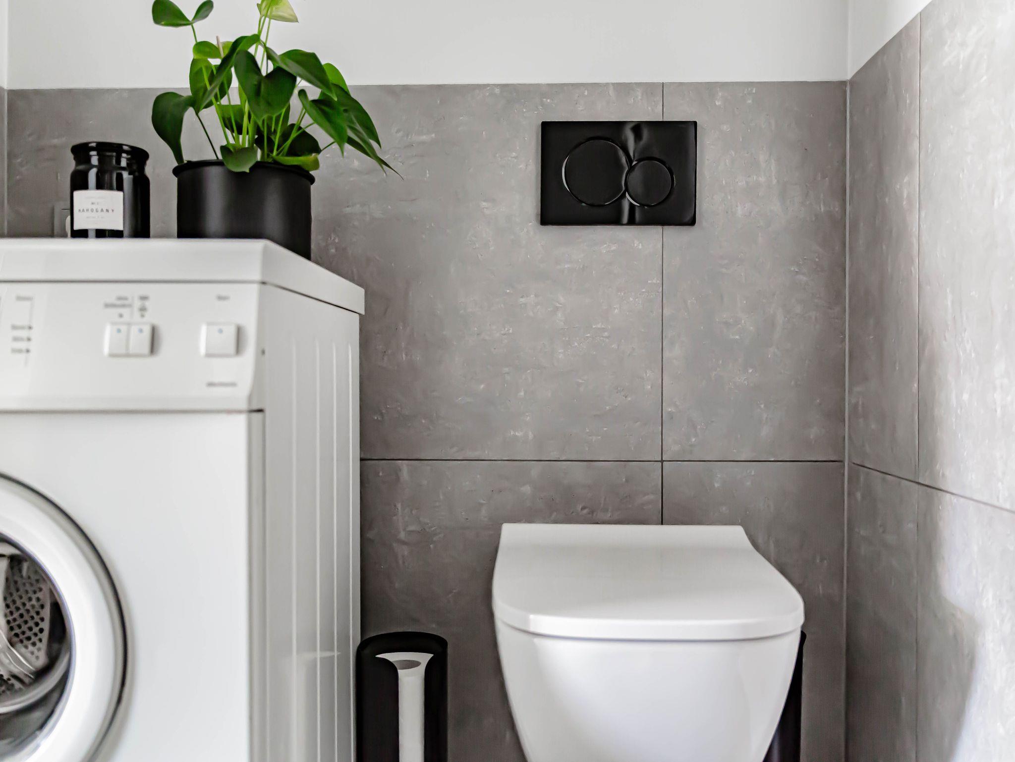 - Badezimmer mit Regendusche, Fön und Waschmaschine (Wäscheständer im Hauswirtschaftsraum)