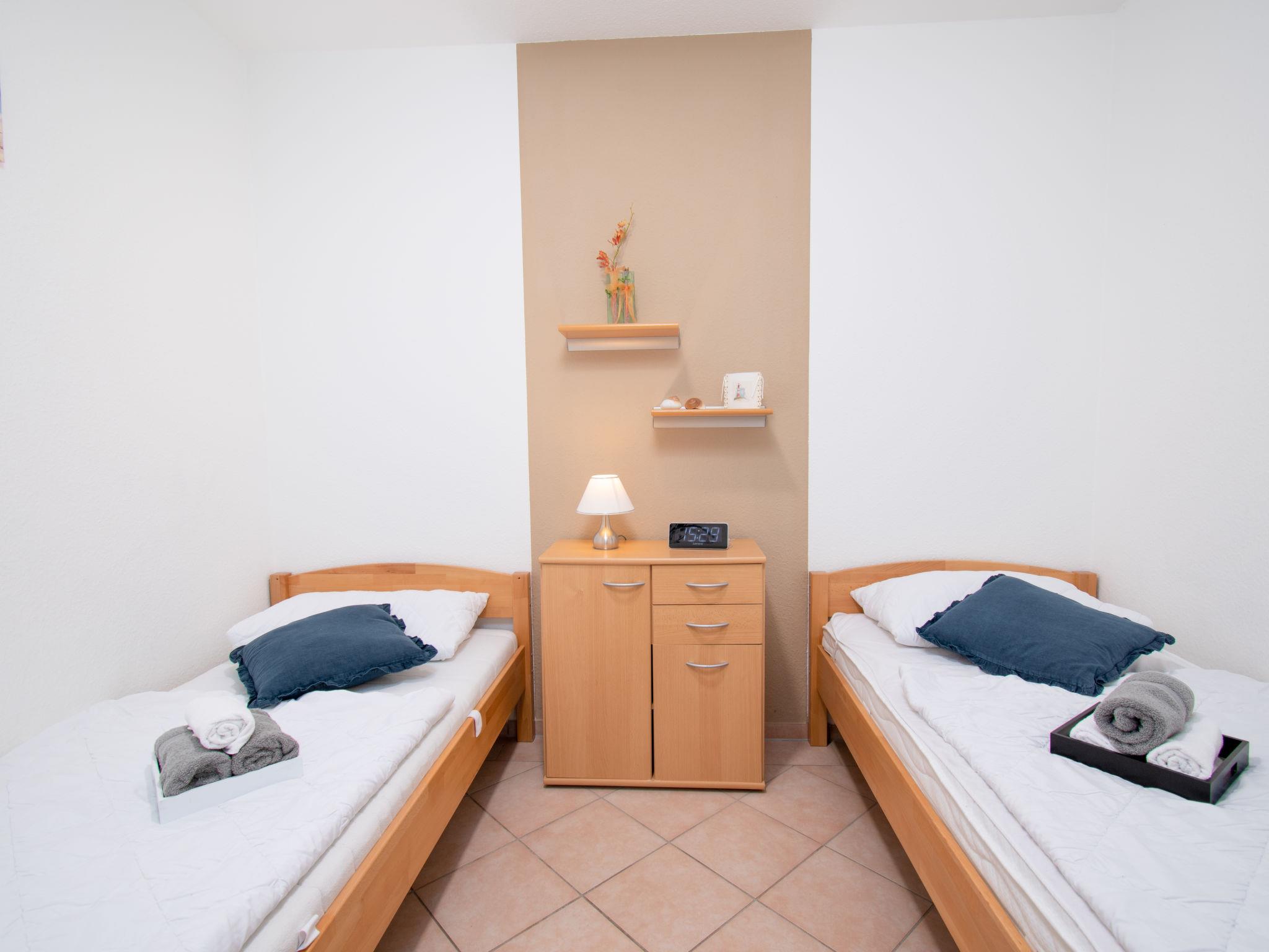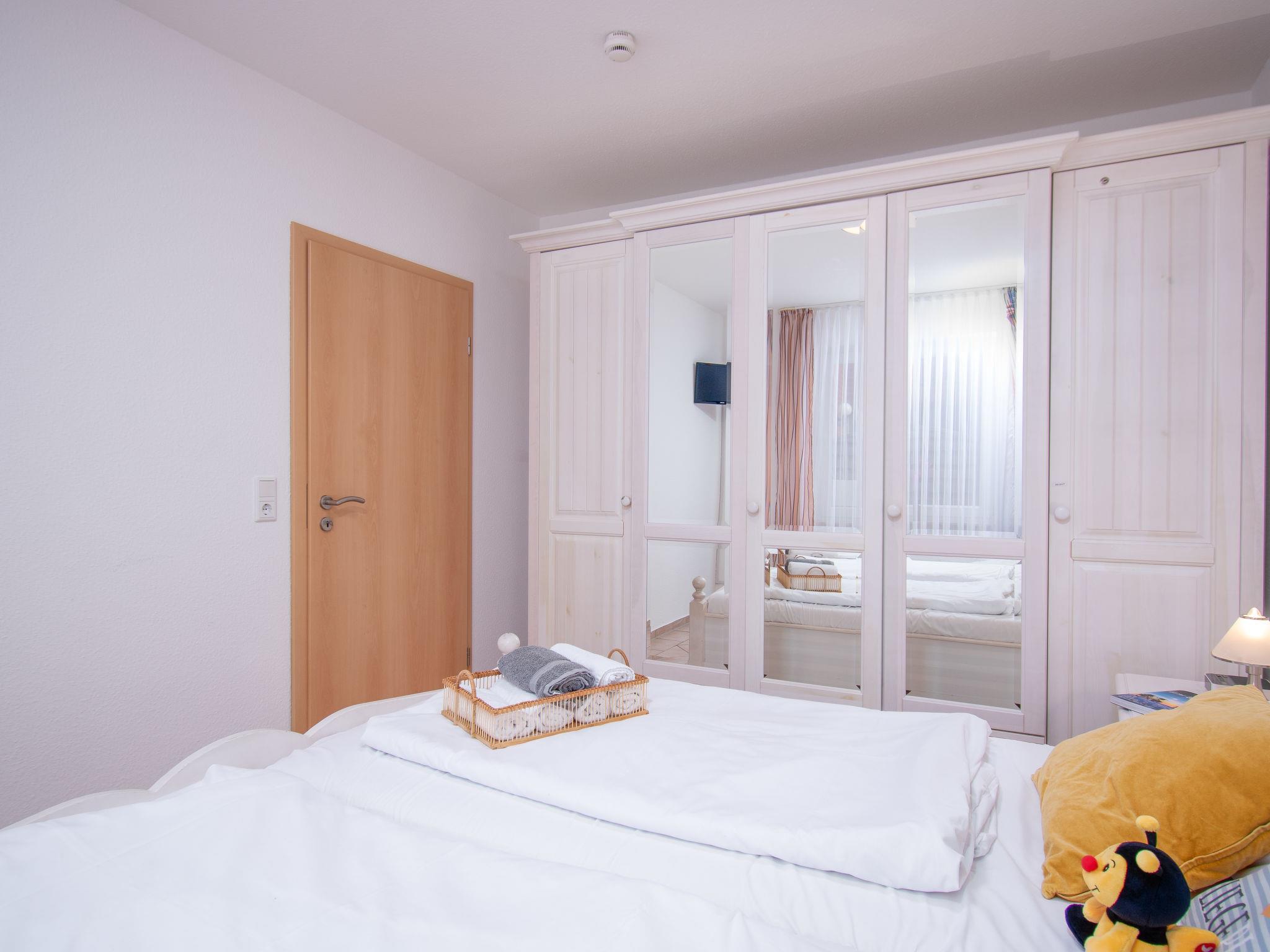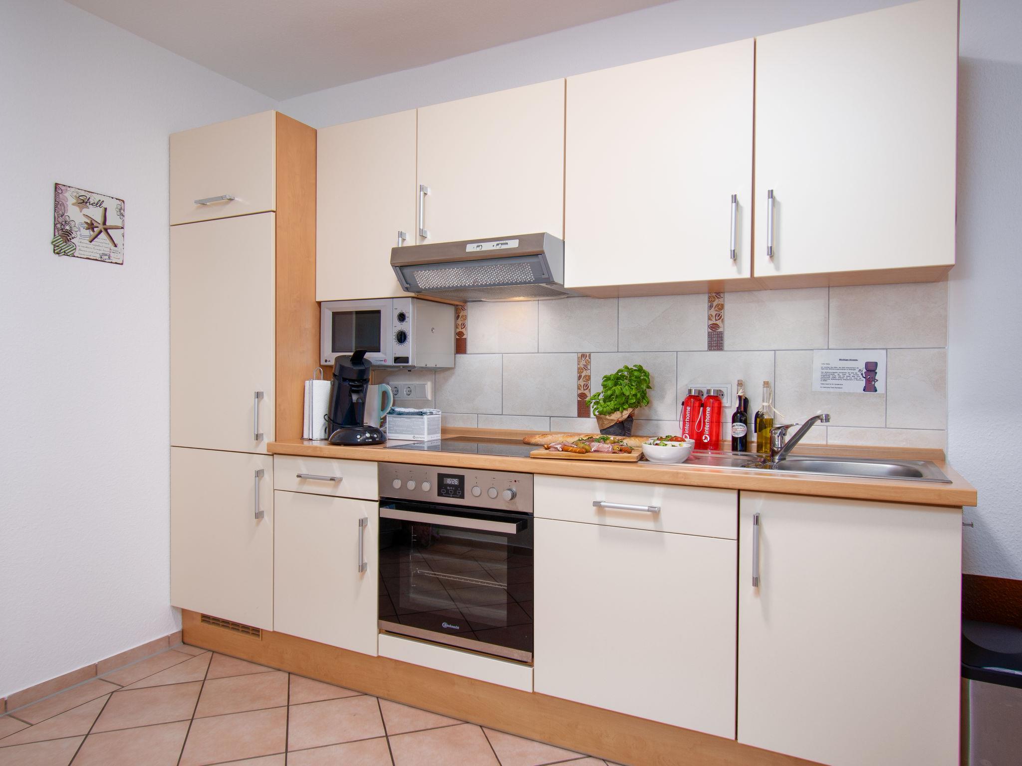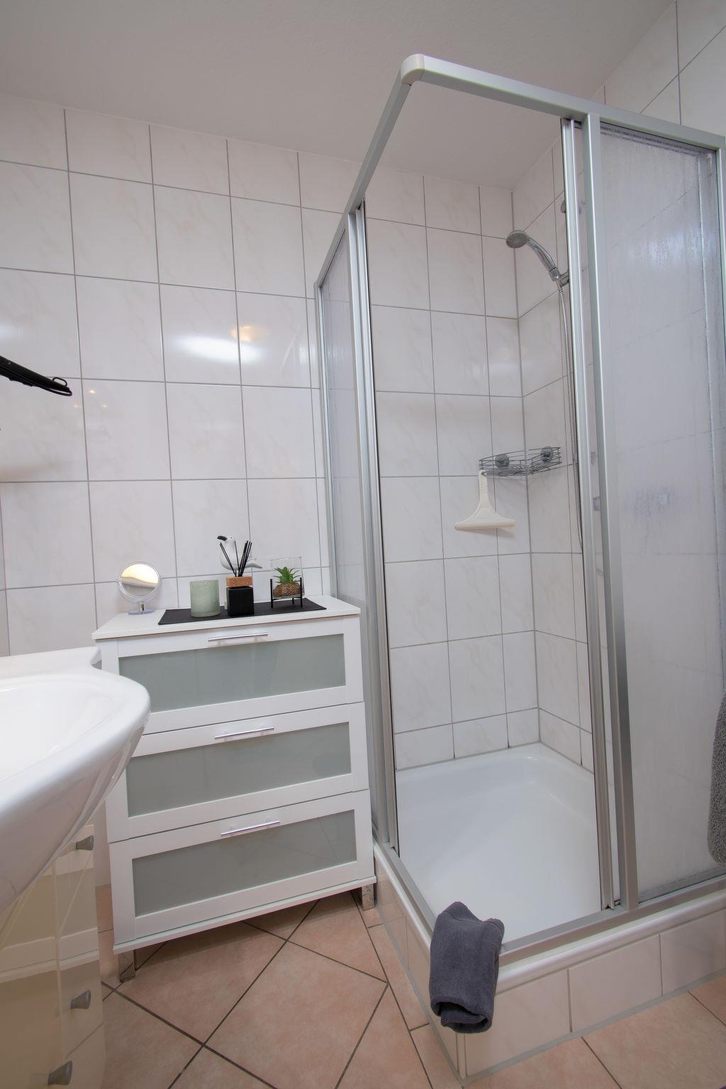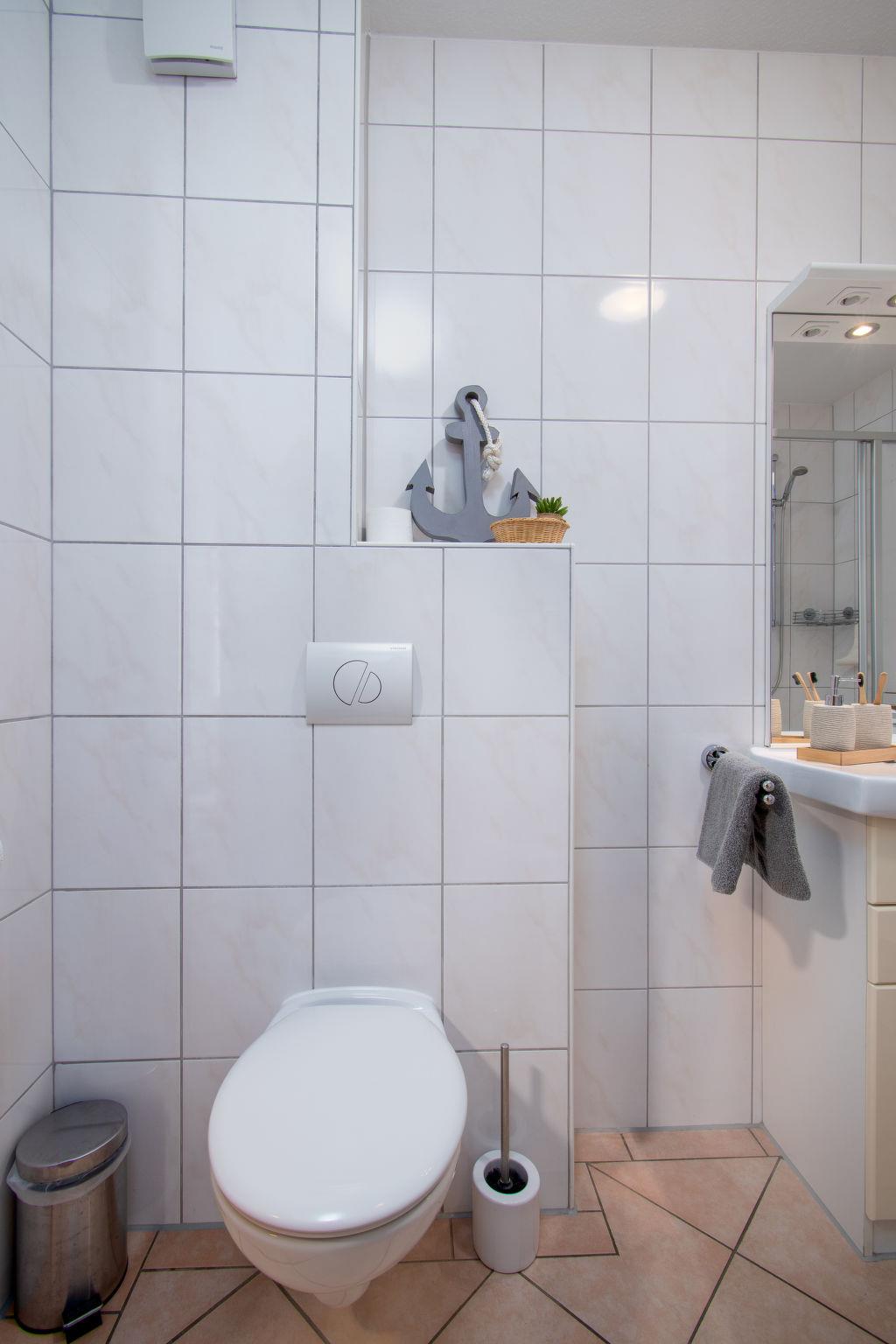 "Seestern", 3-room apartment 65 m2, on the ground floor. Comfortable and modern furnishings: living/dining room 30 m2 with satellite TV (flat screen), radio, DVD and DVD collection available. Exit to the terrace. 1 room 10 m2 with 1 double bed (2 x 90 cm, length 200 cm), satellite TV. 1 room 6 m2 with 2 beds (90 cm, length 200 cm). Kitchenette (oven, dishwasher, 4 ceramic glass hob hotplates, toaster, kettle, microwave, electric coffee machine). Shower/WC. Underfloor heating. Terrace. Terrace furniture, box-room. Facilities: washing machine, iron, children's high chair, hair dryer. Internet (WiFi, free). Please note: non-smokers only. Smoke alarm. The double bedroom faces inwards and has a window to the living / dining room instead of an exterior window. Sockets for e-bikes available in the garden shed. The TV is a SMART TV.