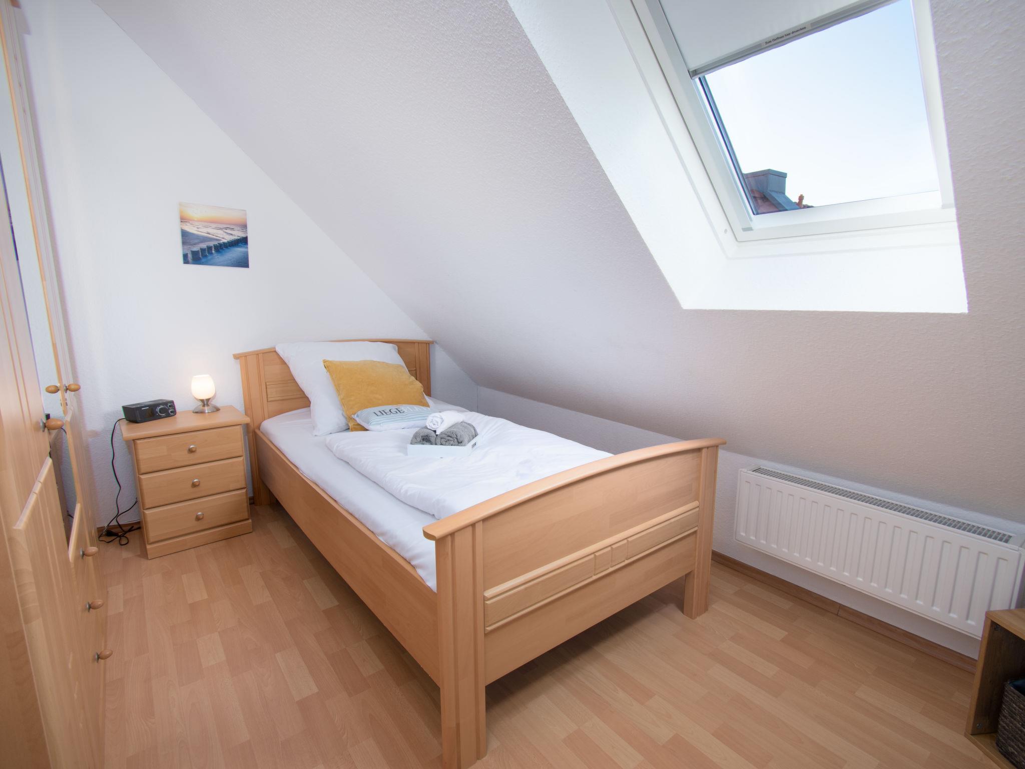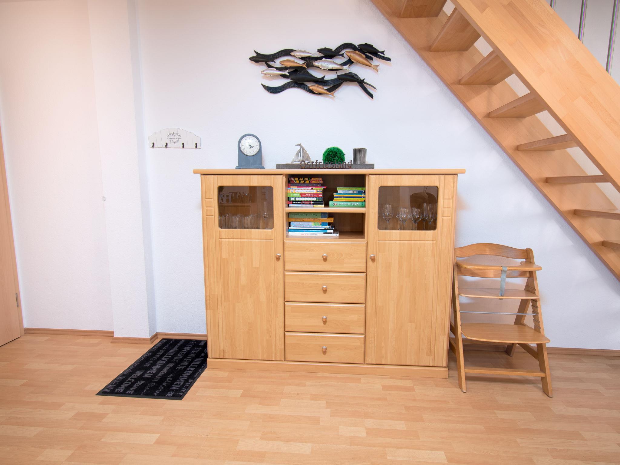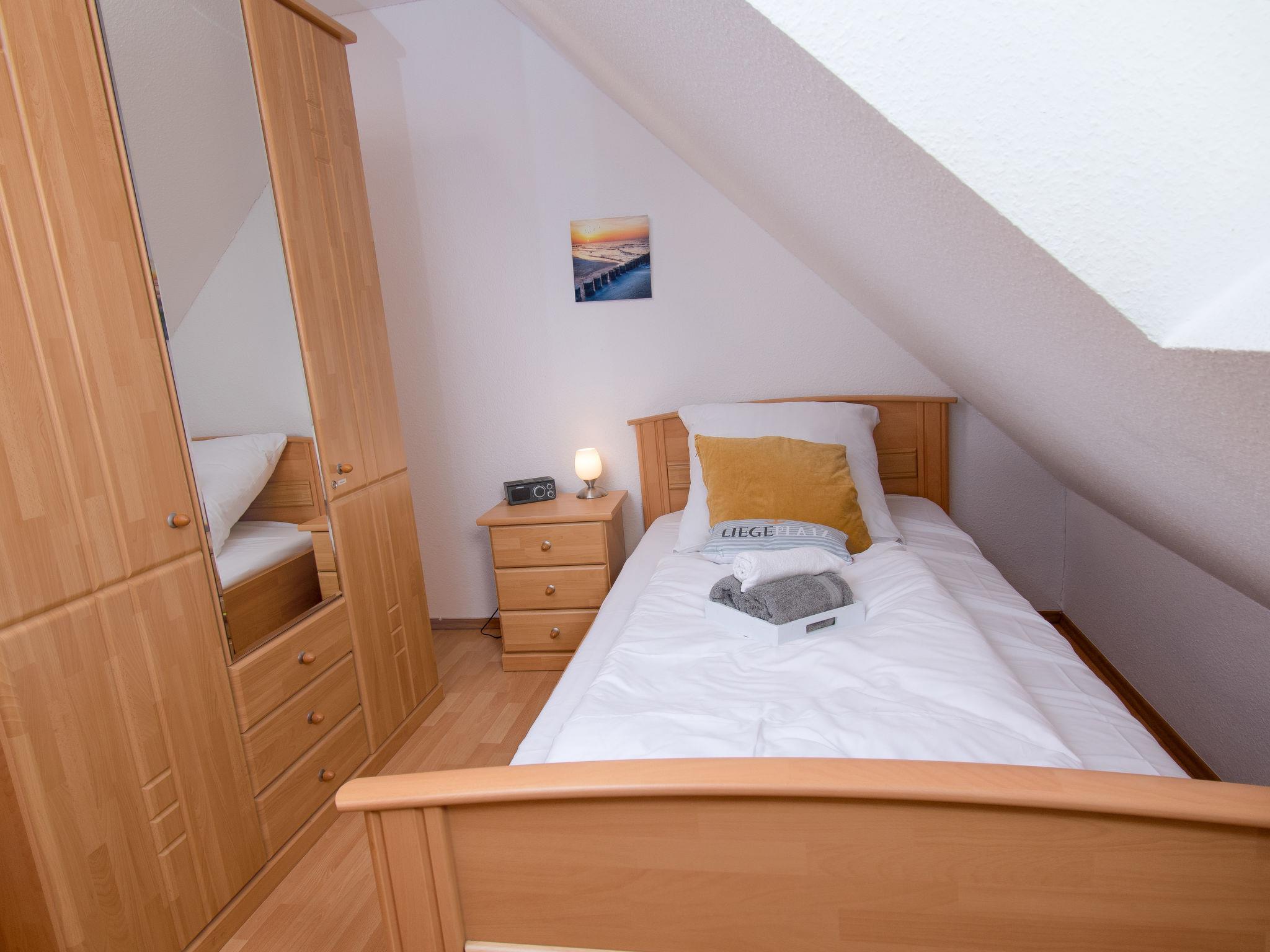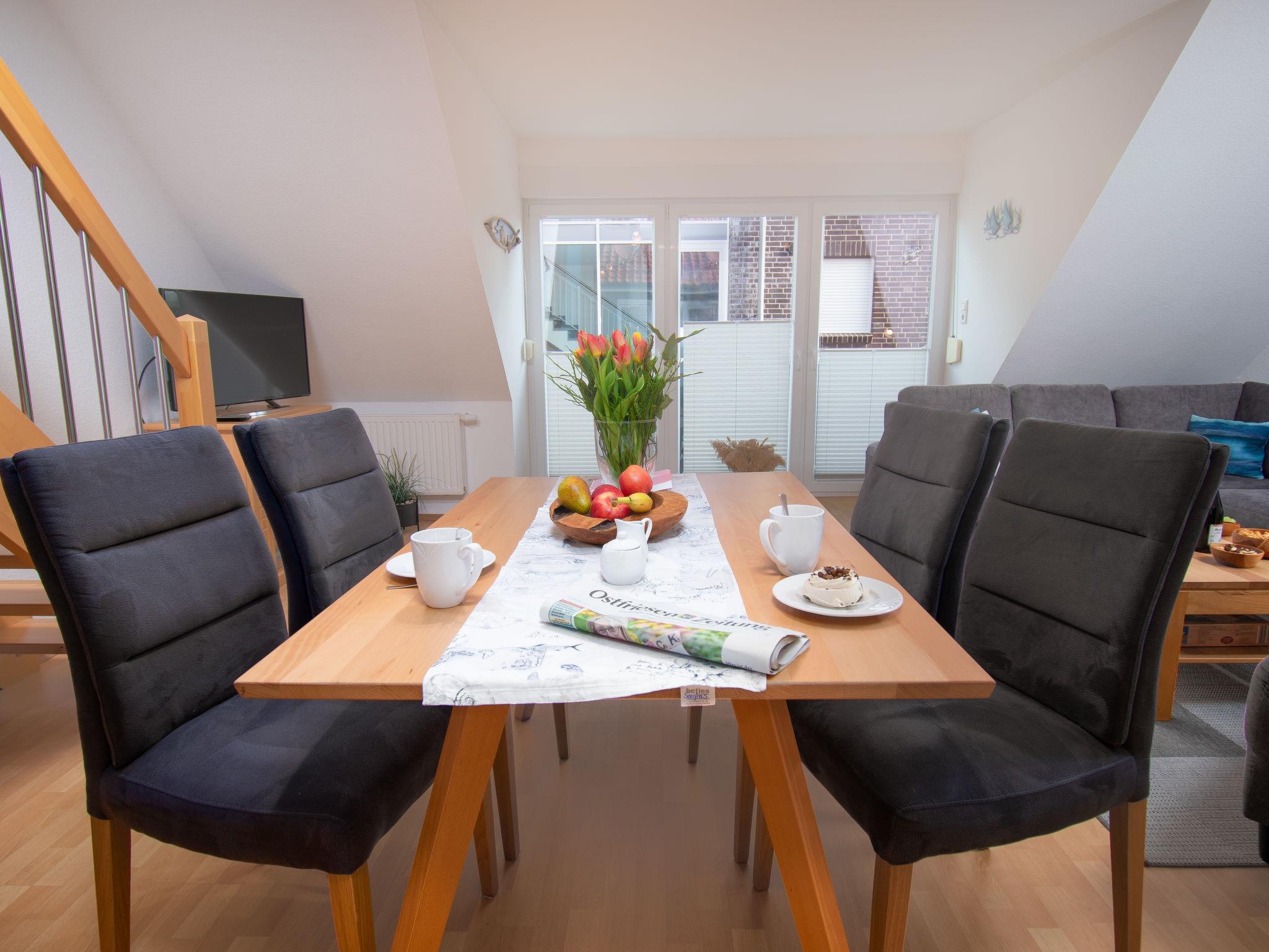 "Seegras", 4-room apartment 74 m2 on 2 levels on 1st floor. Spacious, partly with sloping ceilings, comfortable and modern furnishings: living/dining room 32 m2 with satellite TV (flat screen), radio, DVD and DVD collection available. Exit to the balcony. 1 room 10 m2 with 1 double bed (2 x 90 cm, length 200 cm). Kitchenette (oven, dishwasher, 4 ceramic glass hob hotplates, toaster, kettle, microwave, freezer, electric coffee machine, Capsules for coffee machine (Senseo) extra). Shower/WC. Underfloor heating. Top floor: 1 room 6 m2 with 1 bed and satellite TV (flat screen). 1 room 6 m2 with 1 bed. Sep. WC. Balcony furniture. Facilities: washing machine, iron, children's high chair, hair dryer. Internet (WiFi, free). Please note: non-smokers only. Smoke alarm. Sockets for e-bikes available in the garden shed. TV is a SMART TV.