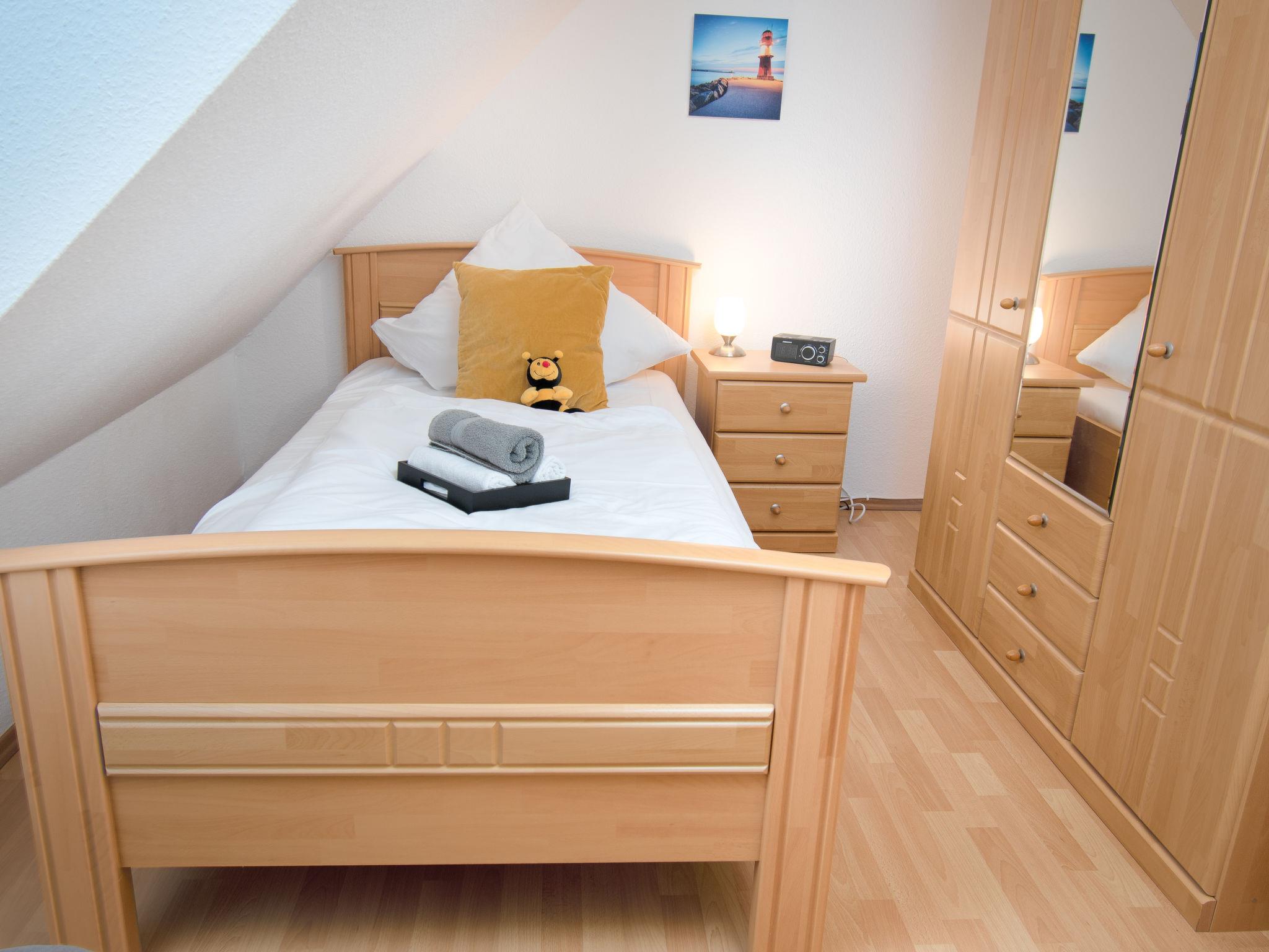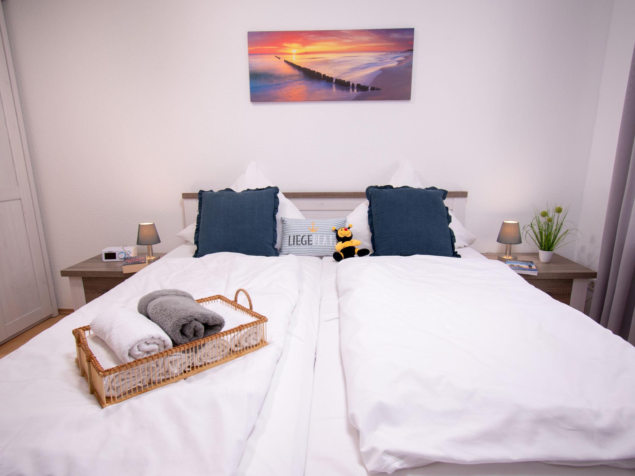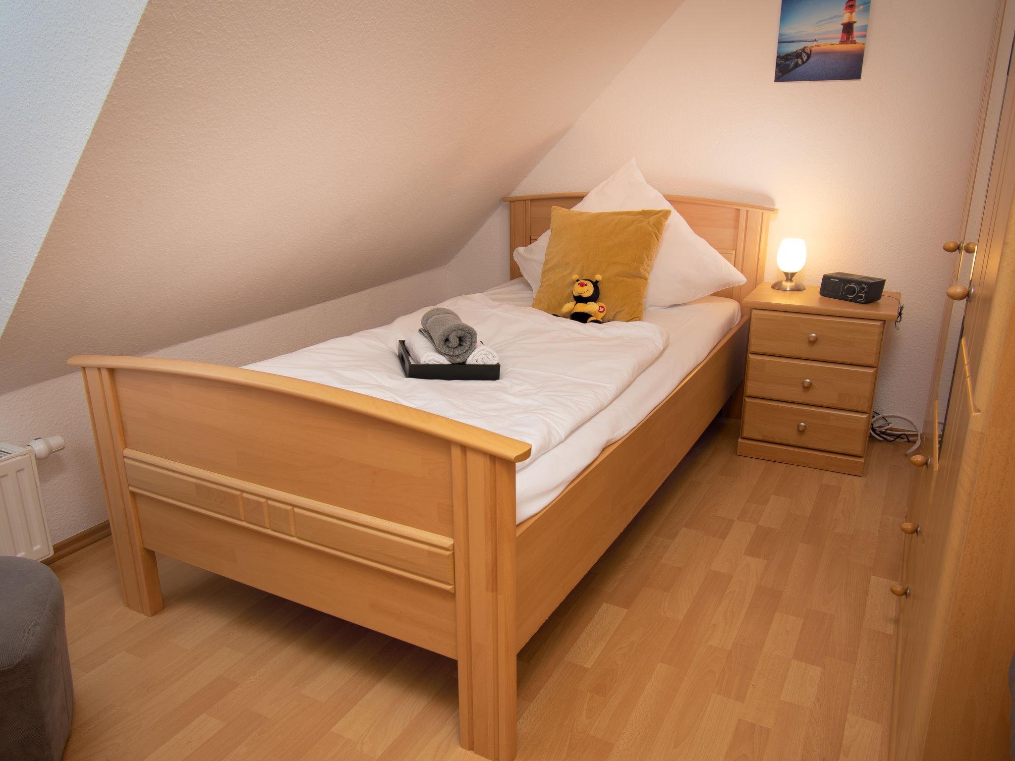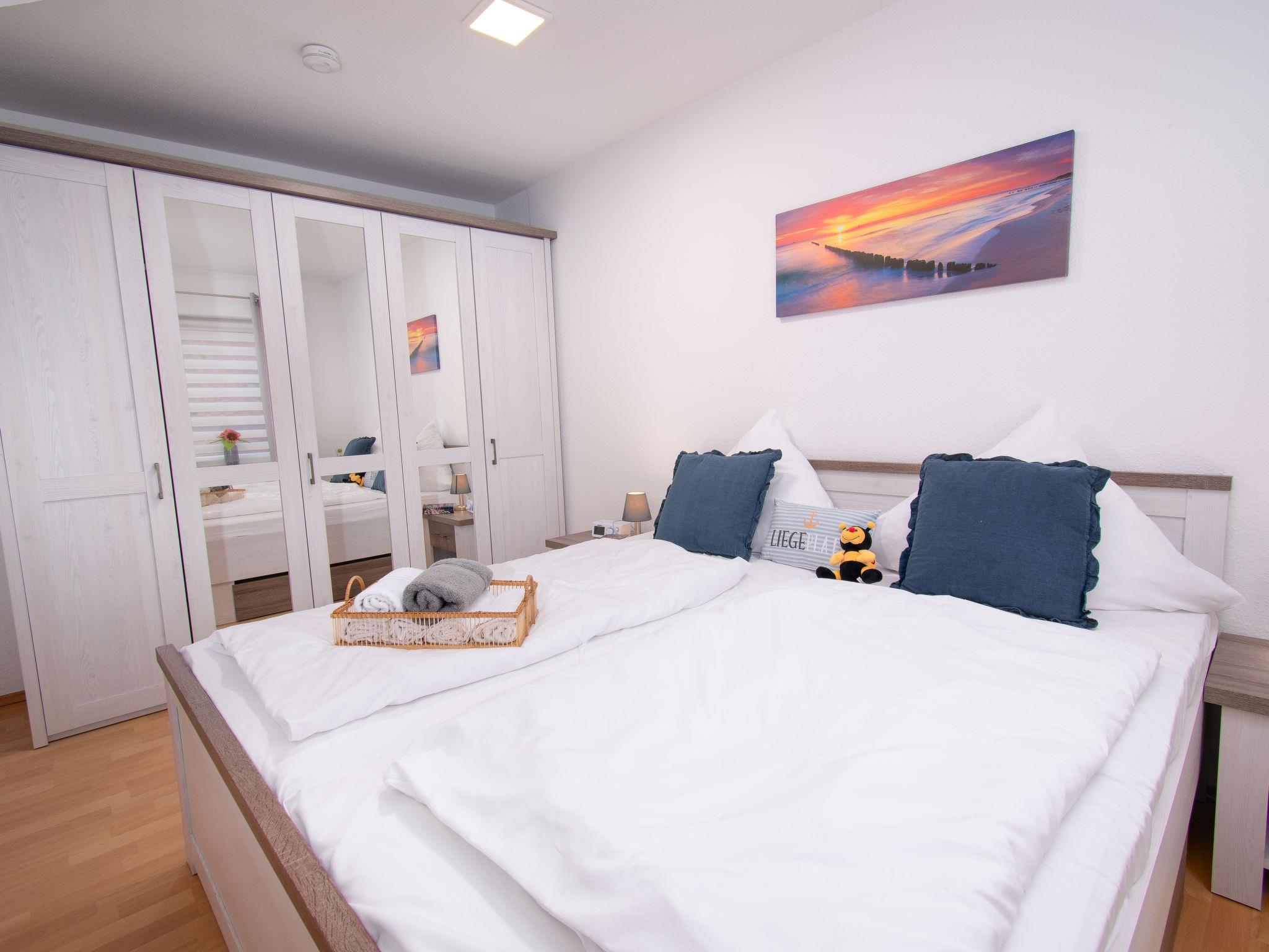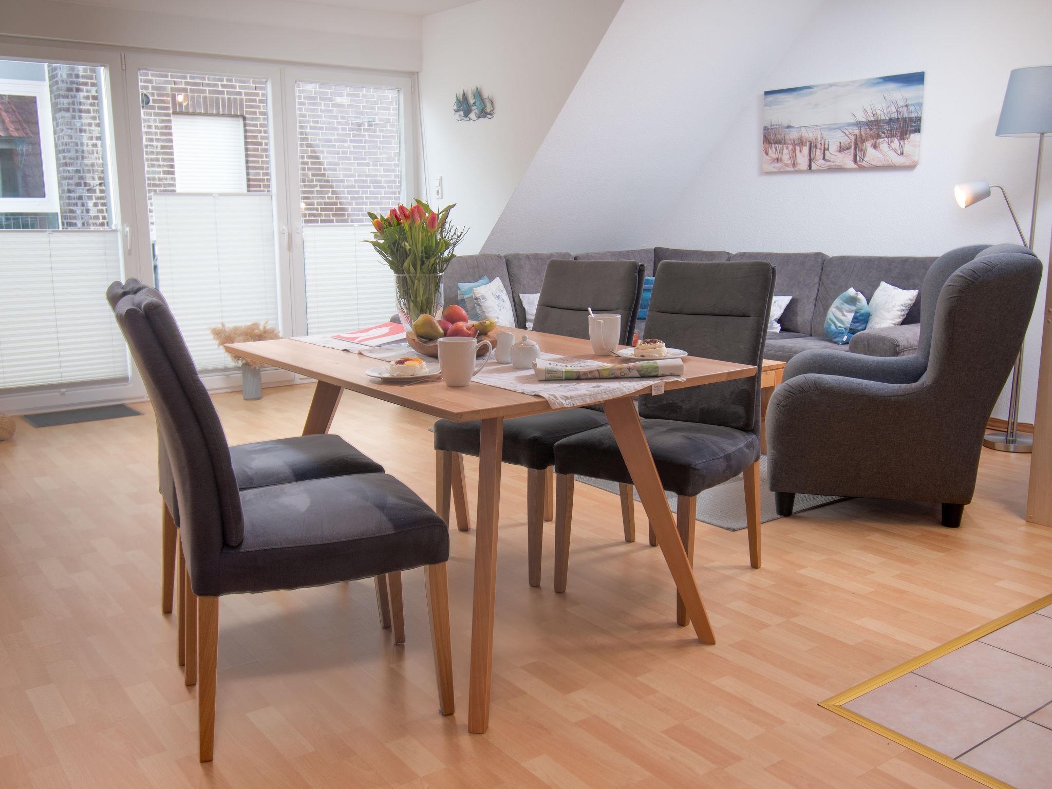 "Seegras", 4-room apartment 74 m2 on 2 levels on 1st floor. Spacious, partly with sloping ceilings, comfortable and modern furnishings: living/dining room 32 m2 with satellite TV (flat screen), radio, DVD and DVD collection available. Exit to the balcony. 1 room 10 m2 with 1 double bed (2 x 90 cm, length 200 cm). Kitchenette (oven, dishwasher, 4 ceramic glass hob hotplates, toaster, kettle, microwave, freezer, electric coffee machine, Capsules for coffee machine (Senseo) extra). Shower/WC. Underfloor heating. Top floor: 1 room 6 m2 with 1 bed and satellite TV (flat screen). 1 room 6 m2 with 1 bed. Sep. WC. Balcony furniture. Facilities: washing machine, iron, children's high chair, hair dryer. Internet (WiFi, free). Please note: non-smokers only. Smoke alarm. Sockets for e-bikes available in the garden shed. TV is a SMART TV.