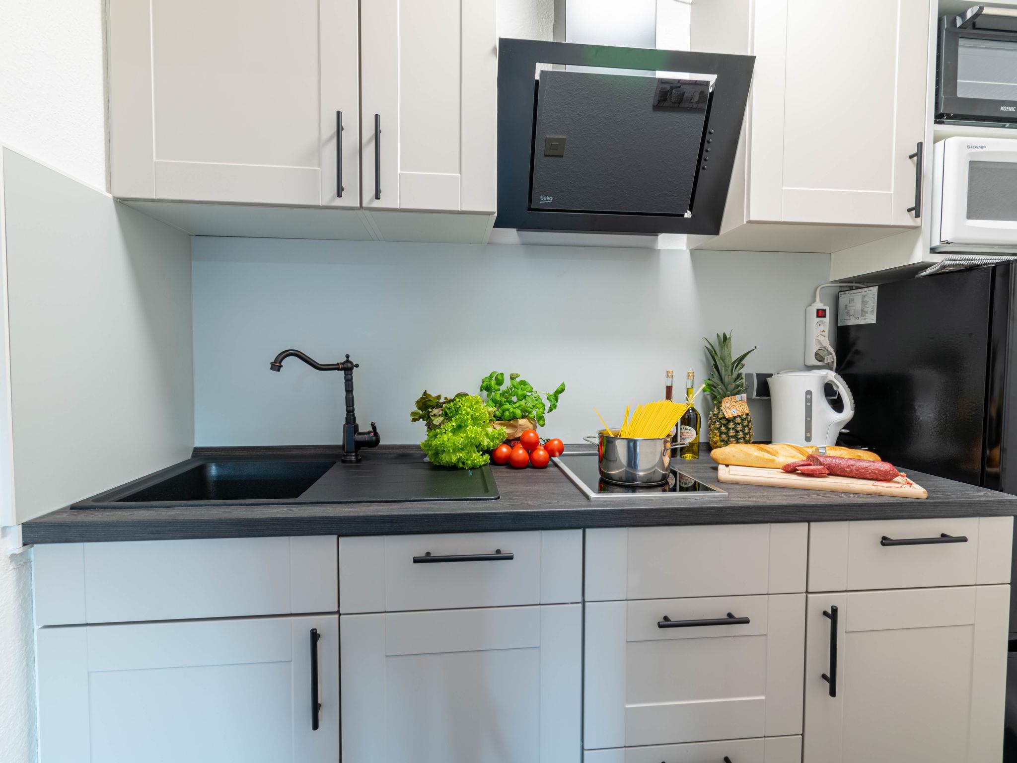 "Lydia", 3-room apartment 43 m2, on the ground floor. Cosy furnishings: living/dining room with satellite TV (flat screen), radio. Exit to the terrace. 1 room with 2 beds (90 cm, length 200 cm). 1 room with 1 x 2 bunk beds (90 cm, length 200 cm). Kitchenette (oven, 2 ceramic glass hob hotplates, toaster, kettle, microwave, electric coffee machine). Shower/WC. Terrace. Terrace furniture. Facilities: children's high chair (extra), hair dryer. Internet (WiFi, free). Please note: non-smokers only. Smoke alarm.