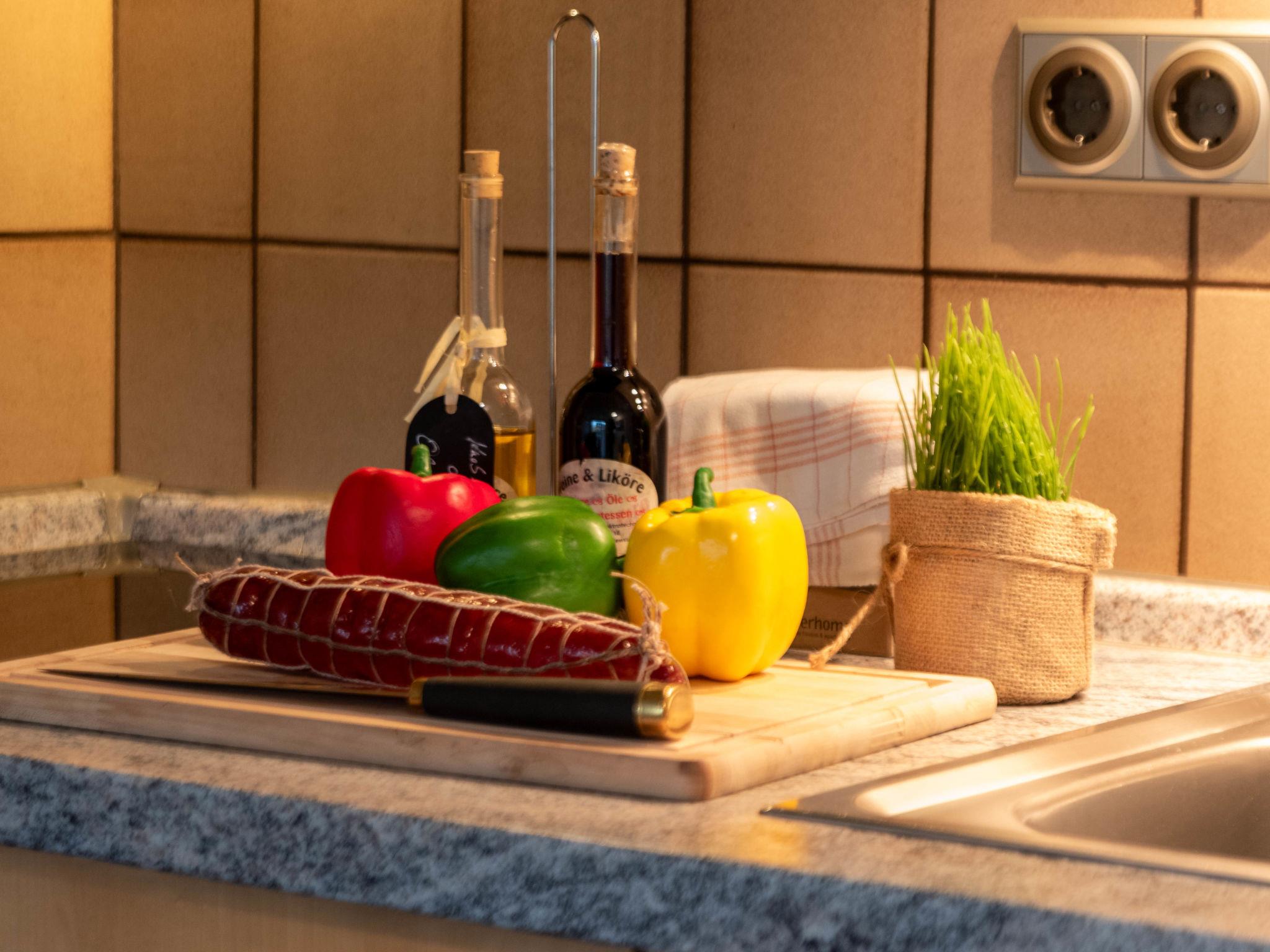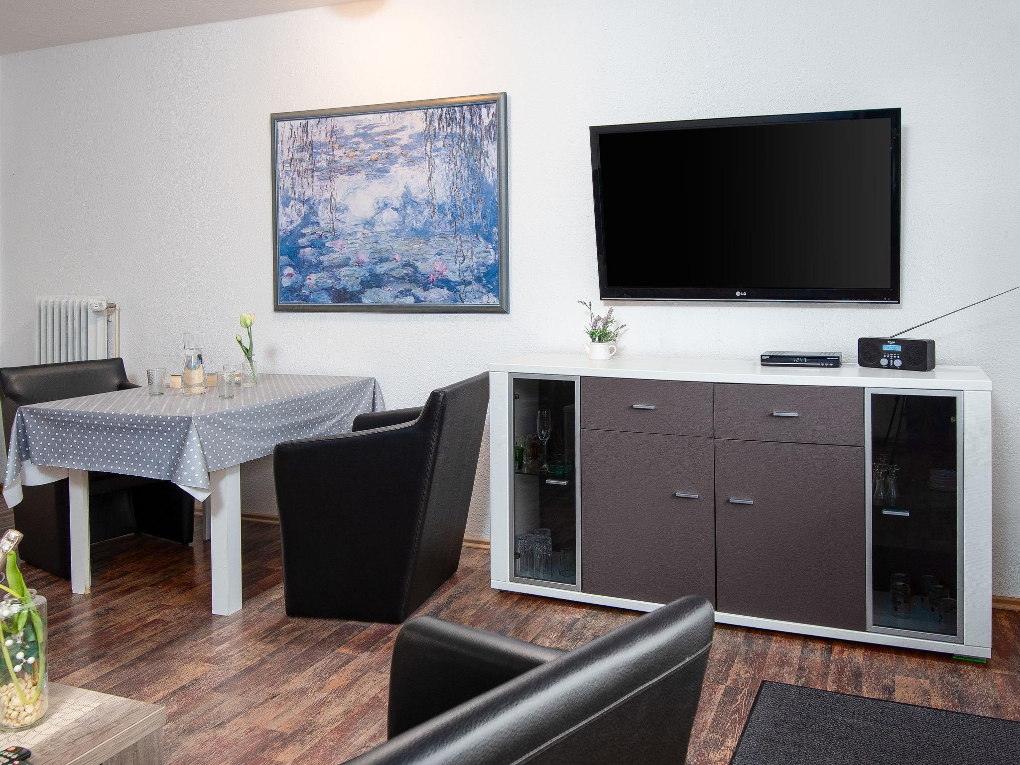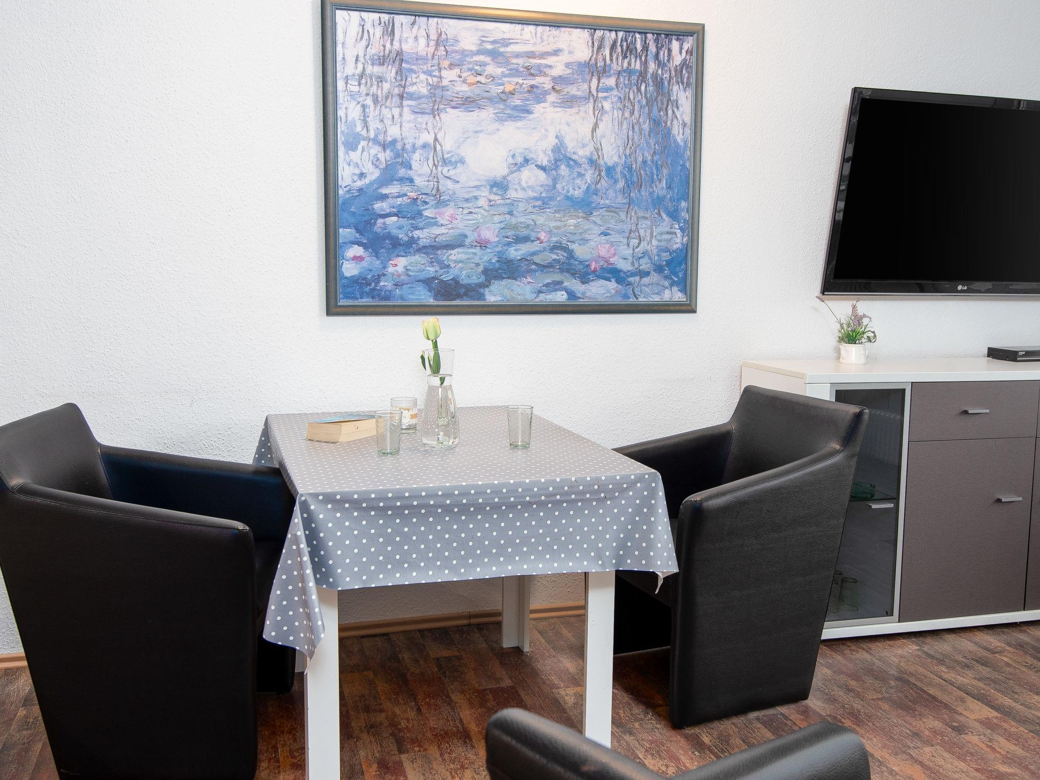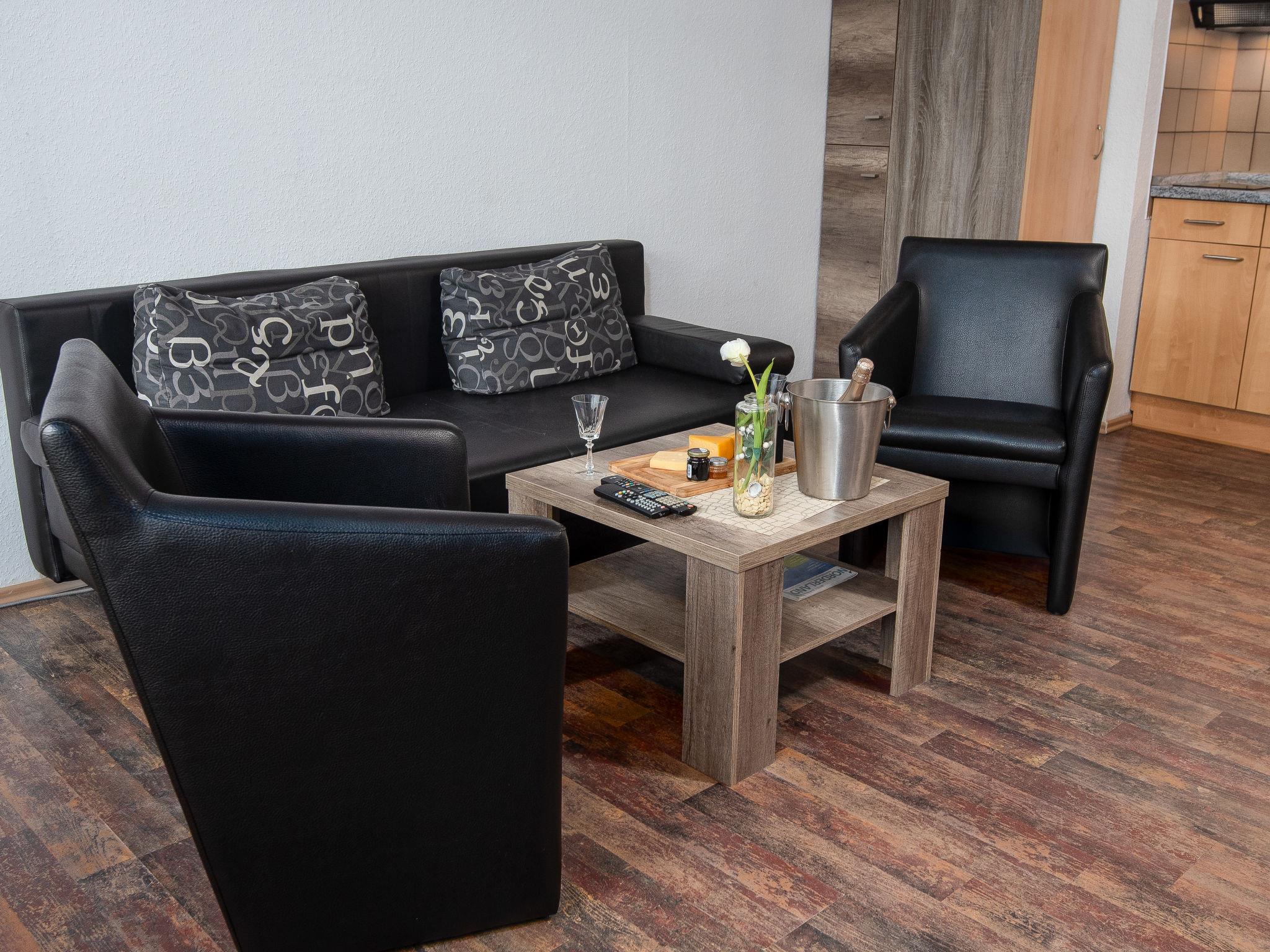 "Turmblick", 2-room apartment 45 m2, on the ground floor. Living/dining room 22 m2 with 1 double sofabed (140 cm, length 190 cm), cable TV (flat screen). 1 small room 6 m2 with 1 double bed (2 x 80 cm, length 200 cm). Kitchenette (2 hot plates, toaster, kettle, microwave, electric coffee machine). Shower/WC. Terrace. Terrace furniture. Facilities: children's high chair (extra). Internet (WiFi, free). Please note: non-smokers only. Shower chair available.
