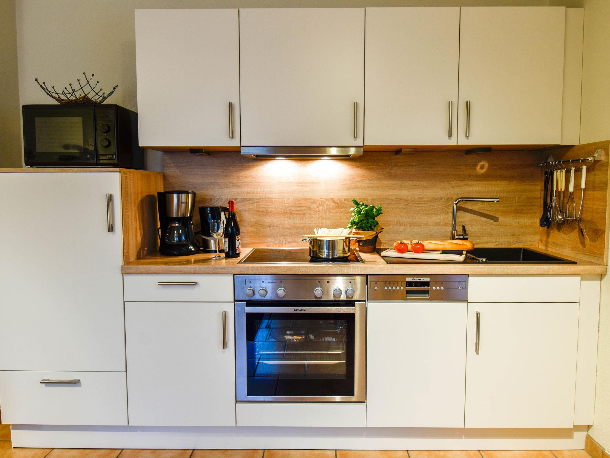 2-room apartment 38 m2, on the upper floor. Living/dining room 18 m2, with sloping ceilings with cable TV (flat screen), radio. Exit to the balcony. 1 room 10 m2, with sloping ceilings with 1 double bed (2 x 90 cm, length 200 cm). Kitchenette (4 hot plates, oven, dishwasher, toaster, kettle, microwave, electric coffee machine). Shower/WC. Balcony 6 m2. Balcony furniture. Facilities: children's high chair (extra). Internet (WiFi, free). Please note: non-smokers only. Smoke alarm.