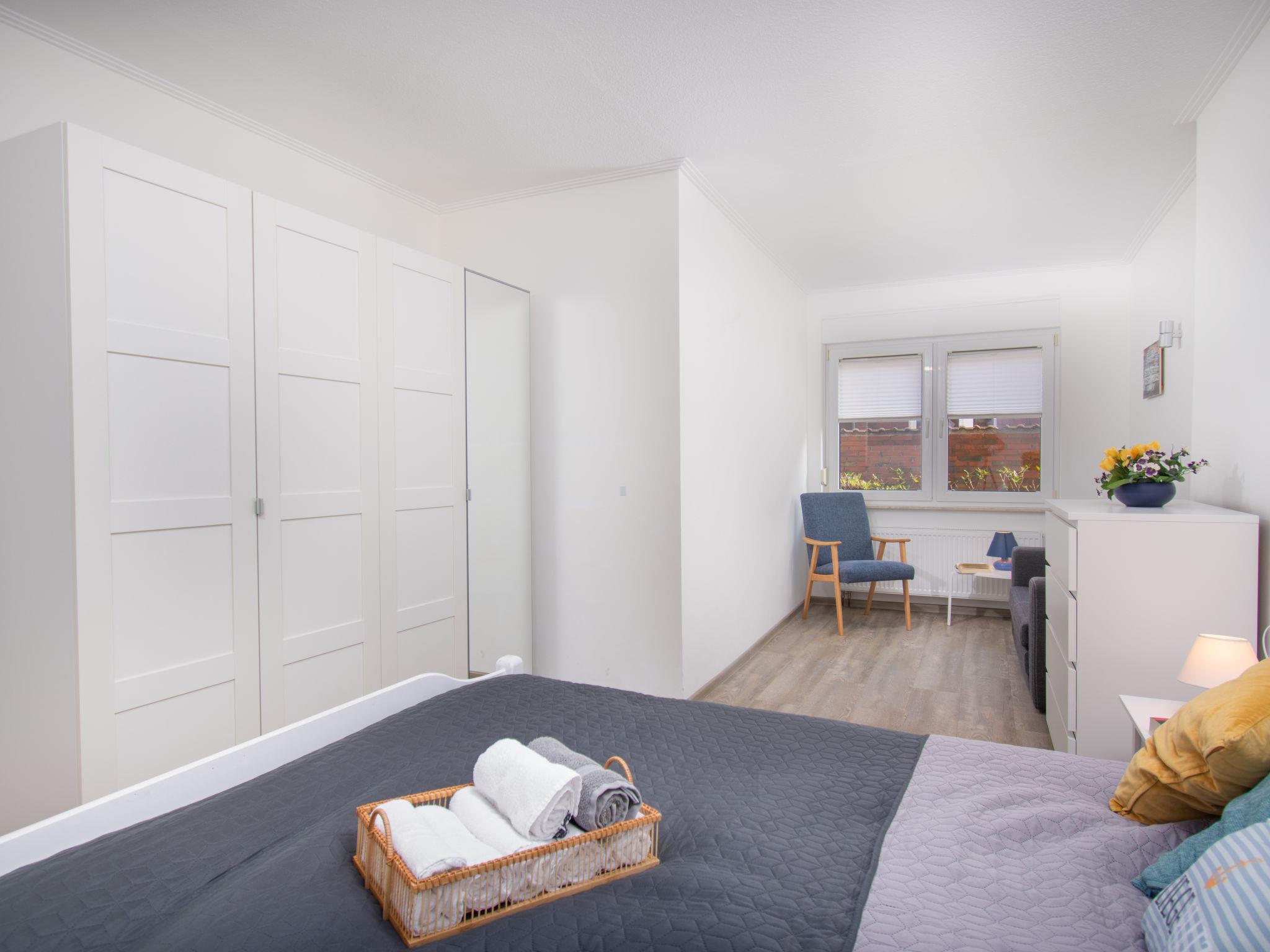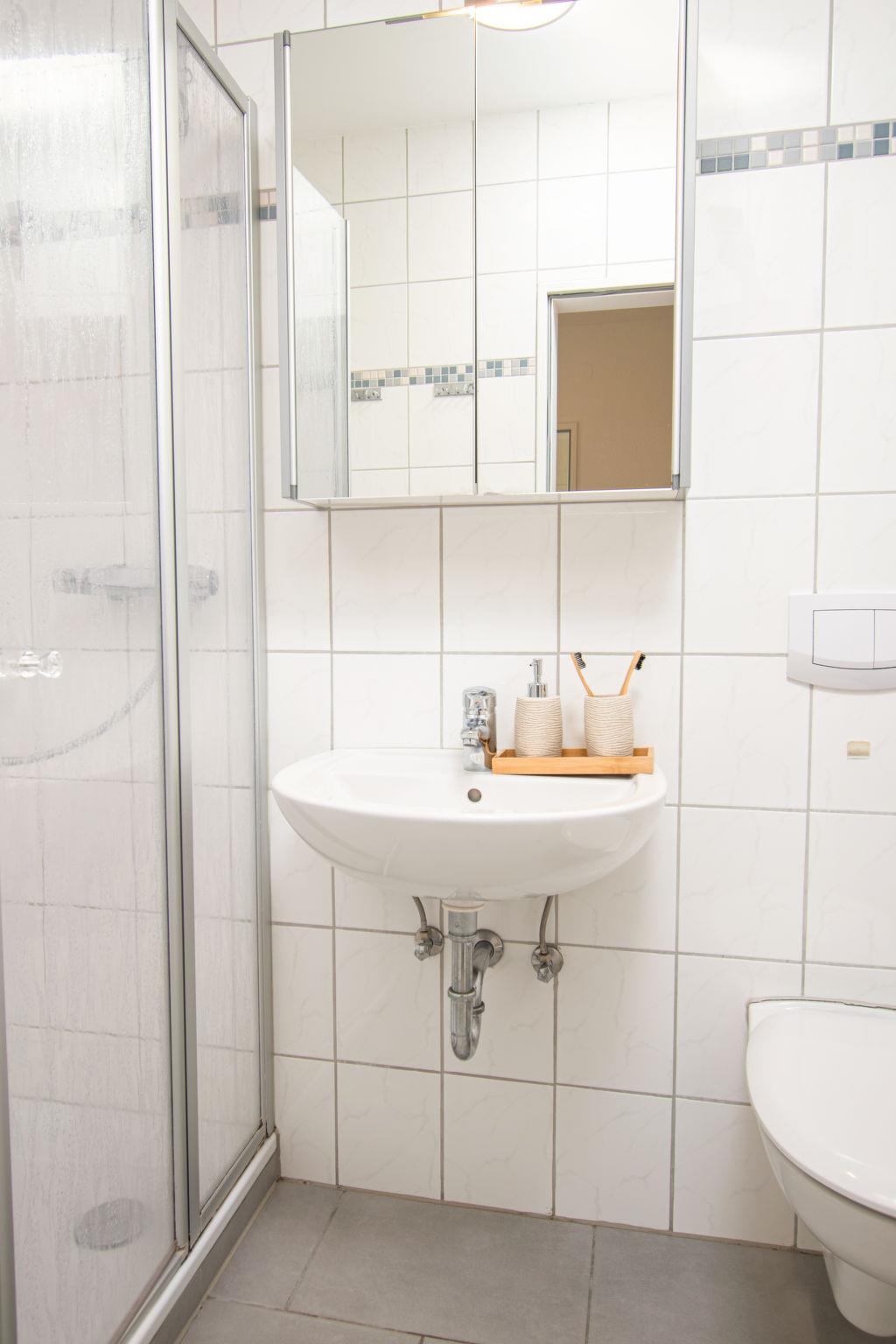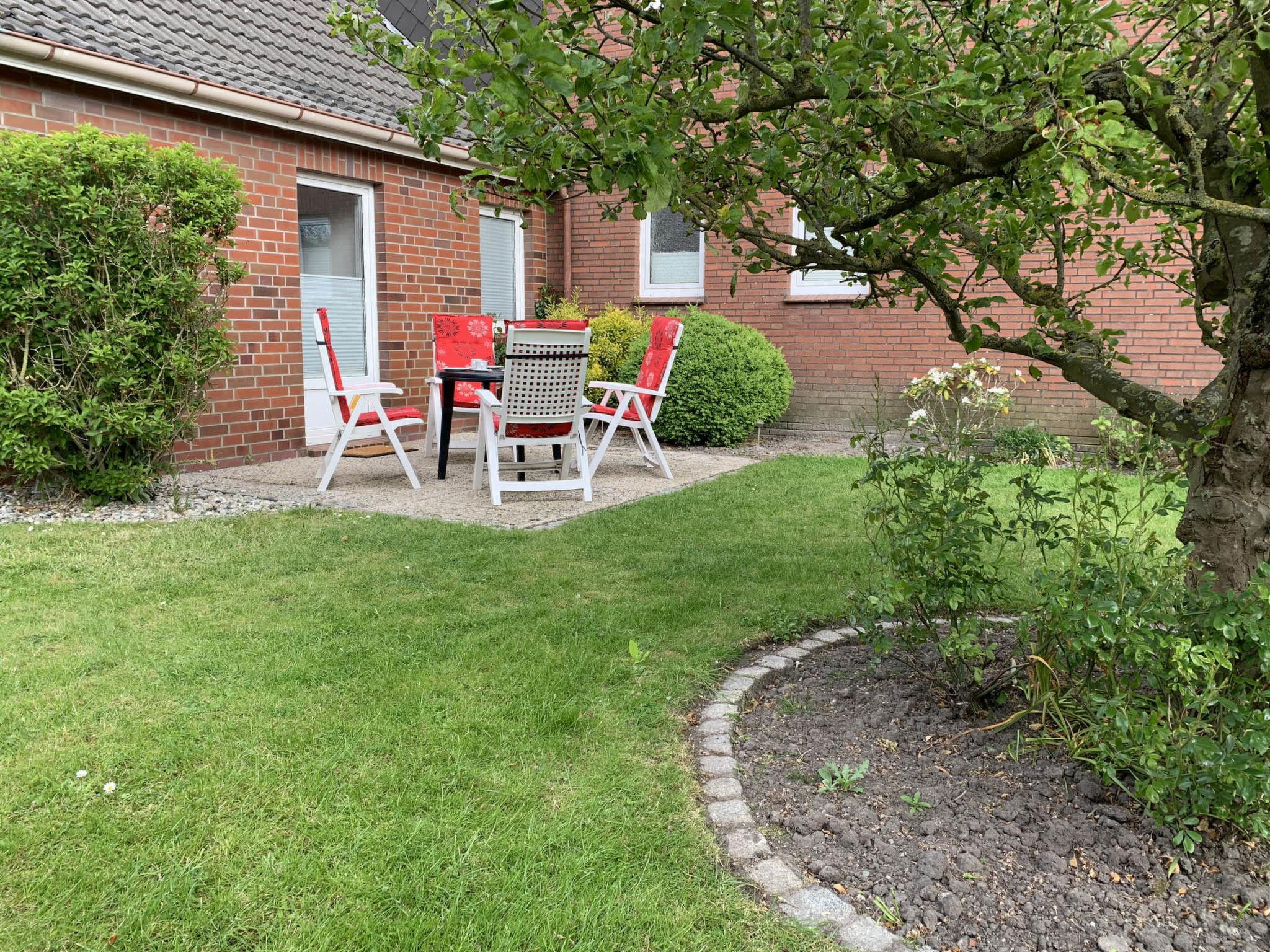 "Strandmuschel", 3-room apartment 56 m2, on the ground floor. Beautiful and cosy furnishings: living/dining room 22 m2 with satellite TV (flat screen), radio and CD-player. Exit to the garden, to the terrace. 1 room 20 m2 with 1 double bed (2 x 90 cm, length 200 cm). 1 room 6 m2 with 2 beds (90 cm, length 200 cm). Small kitchen (2 ceramic glass hob hotplates, electric coffee machine, pizza oven). Shower/WC. Terrace furniture, barbecue (portable). Facilities: children's high chair (extra). Please note: non-smokers only.