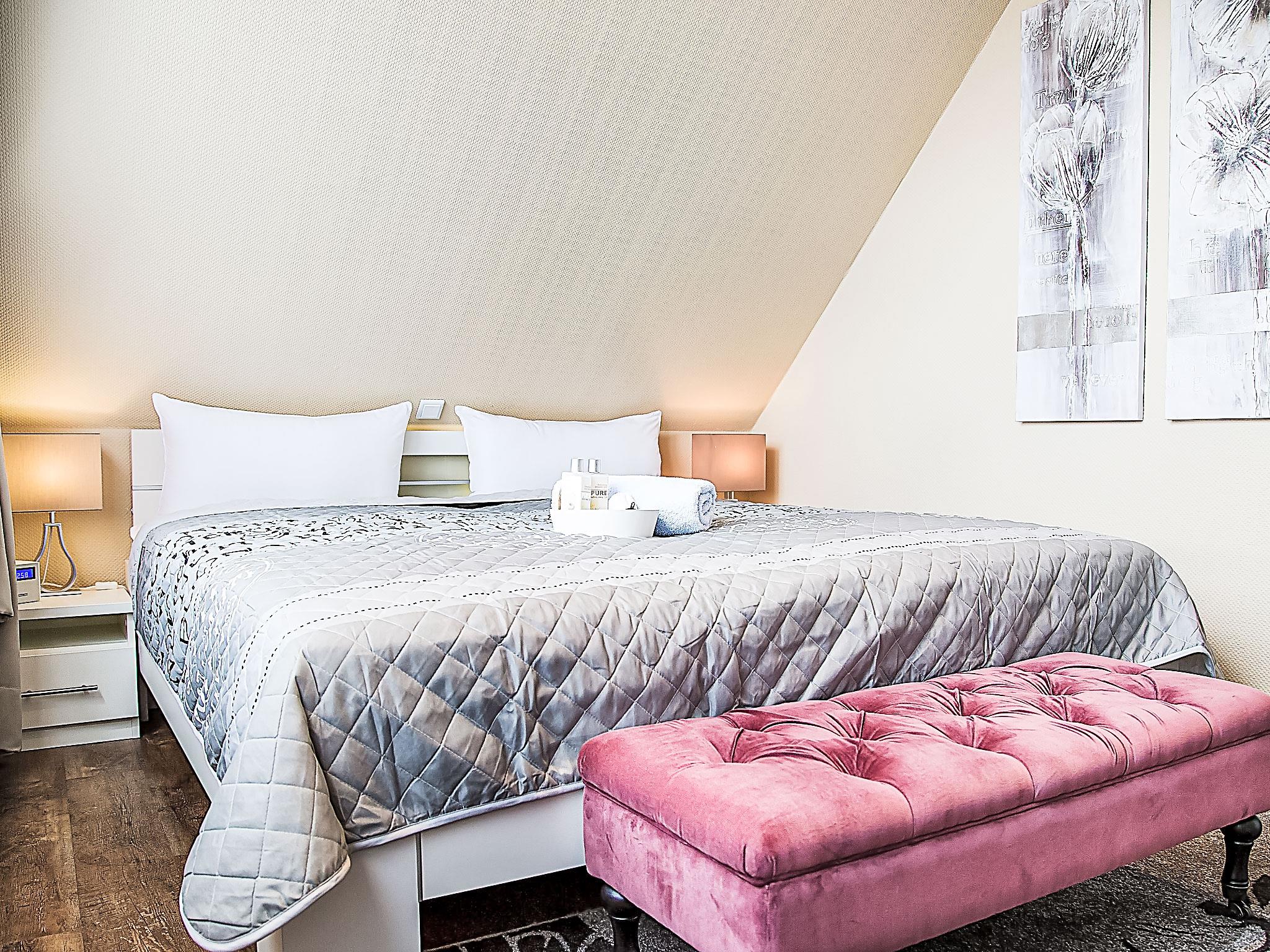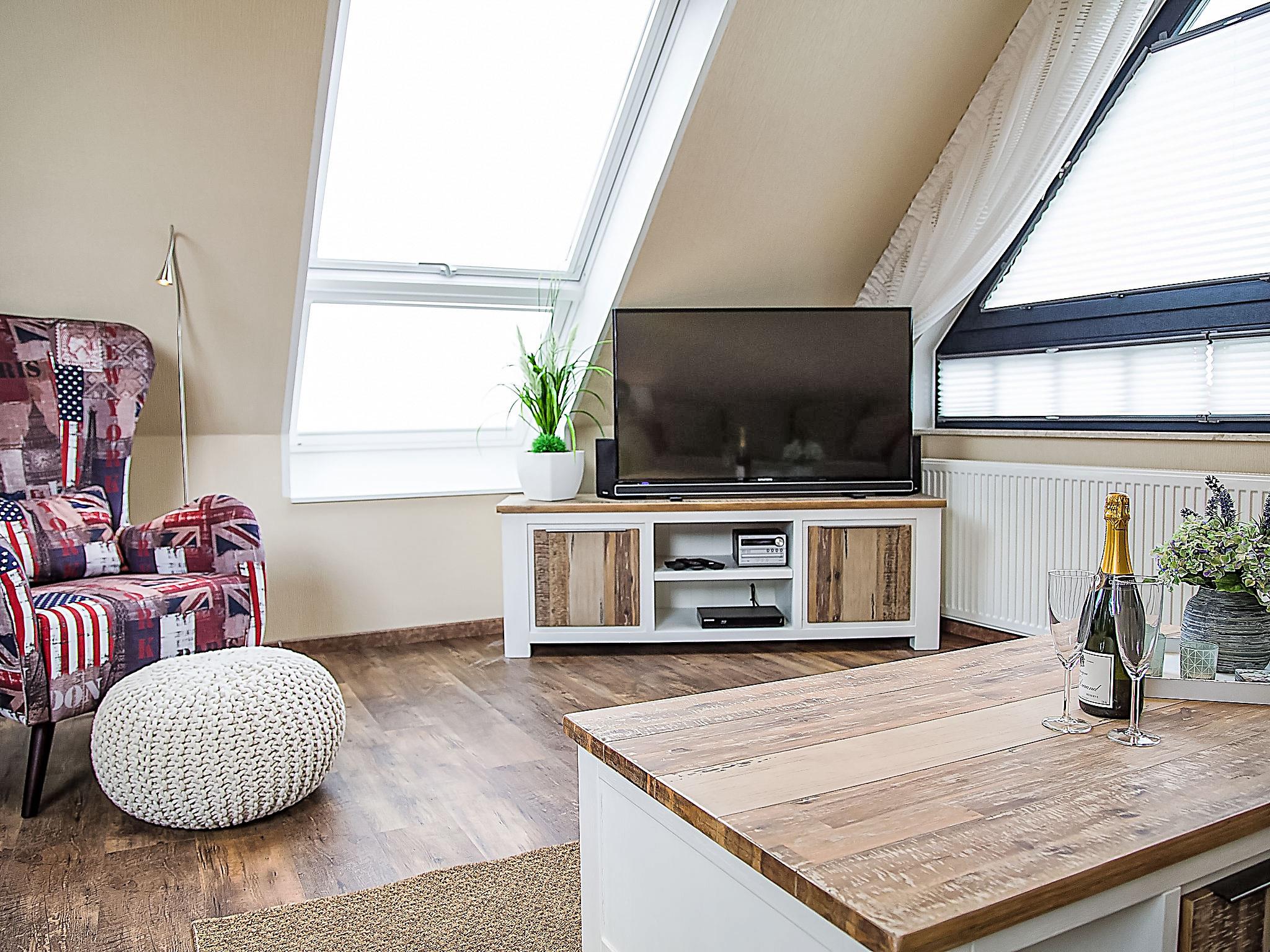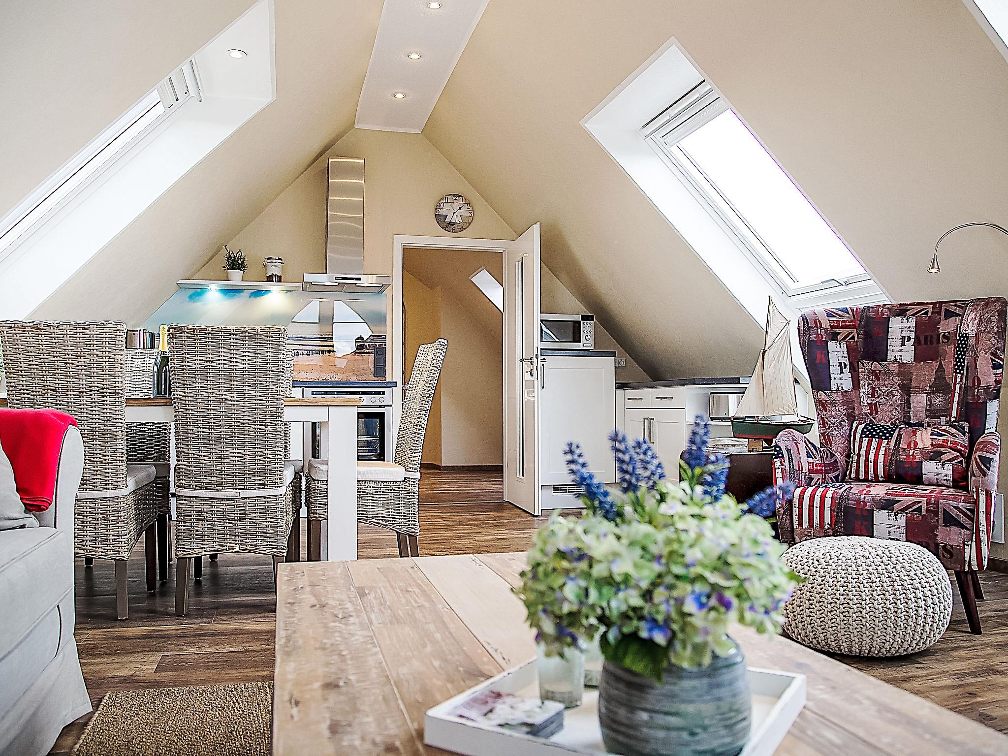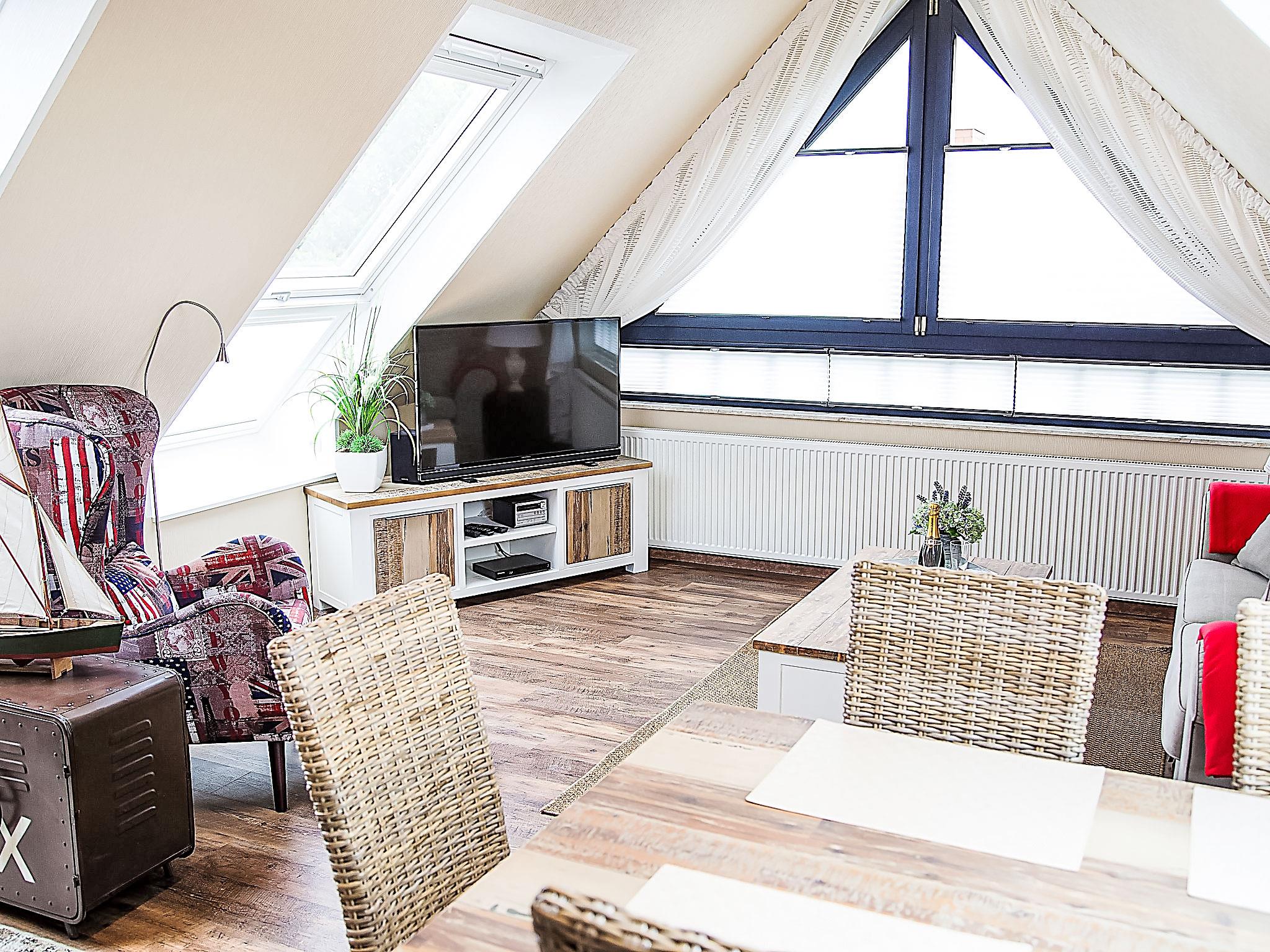"Witthuus-Wangerooge", 3-room apartment 75 m2, on the top floor. With sloping ceilings, very comfortable and stylish furnishings: living/dining room 30 m2 with satellite TV (flat screen), radio, CD-player and DVD. 1 room 13 m2 with 1 double bed (2 x 90 cm, length 200 cm), satellite TV (flat screen). 1 room 13 m2 with 2 beds (90 cm, length 200 cm), satellite TV (flat screen). Kitchenette (oven, dishwasher, 4 induction hot plates, toaster, kettle, microwave, electric coffee machine). Shower/WC. Underfloor heating. Beautiful view of the resort. Facilities: children's high chair. Internet (WiFi, free). Parking at the house. Please note: non-smokers only.