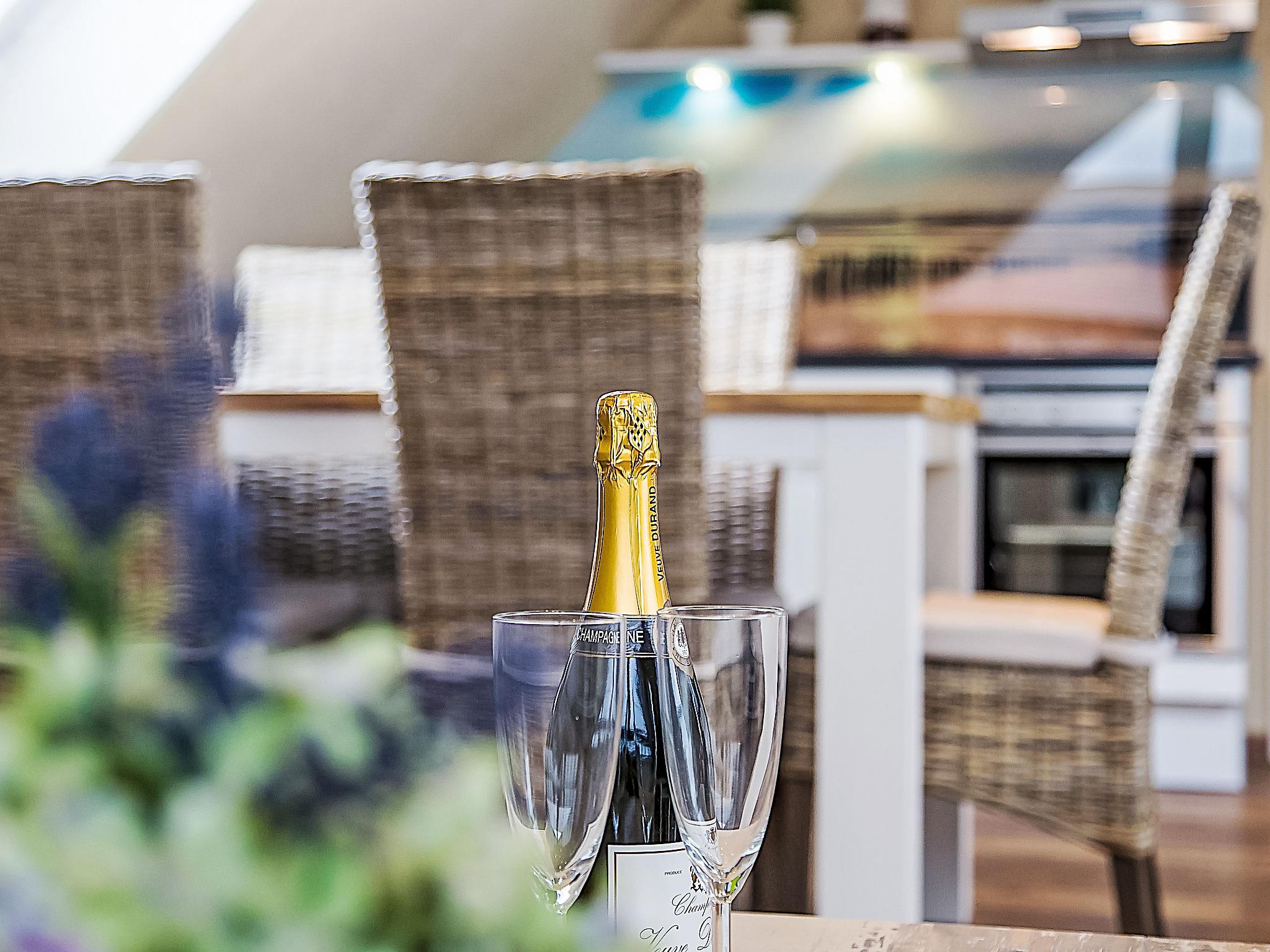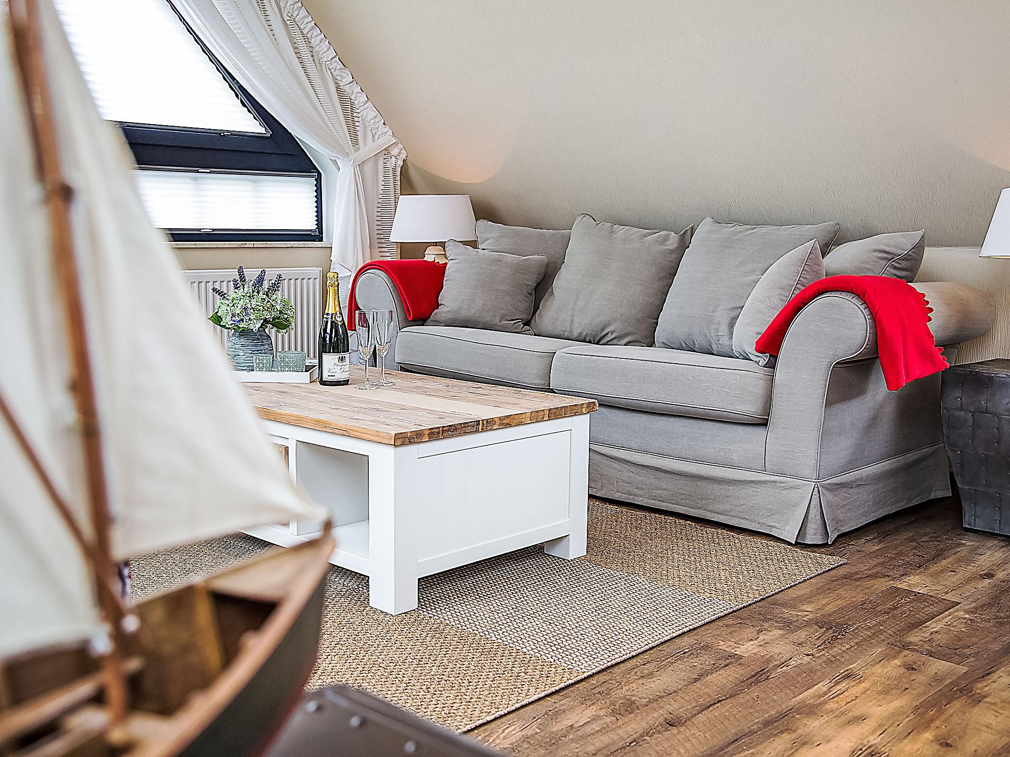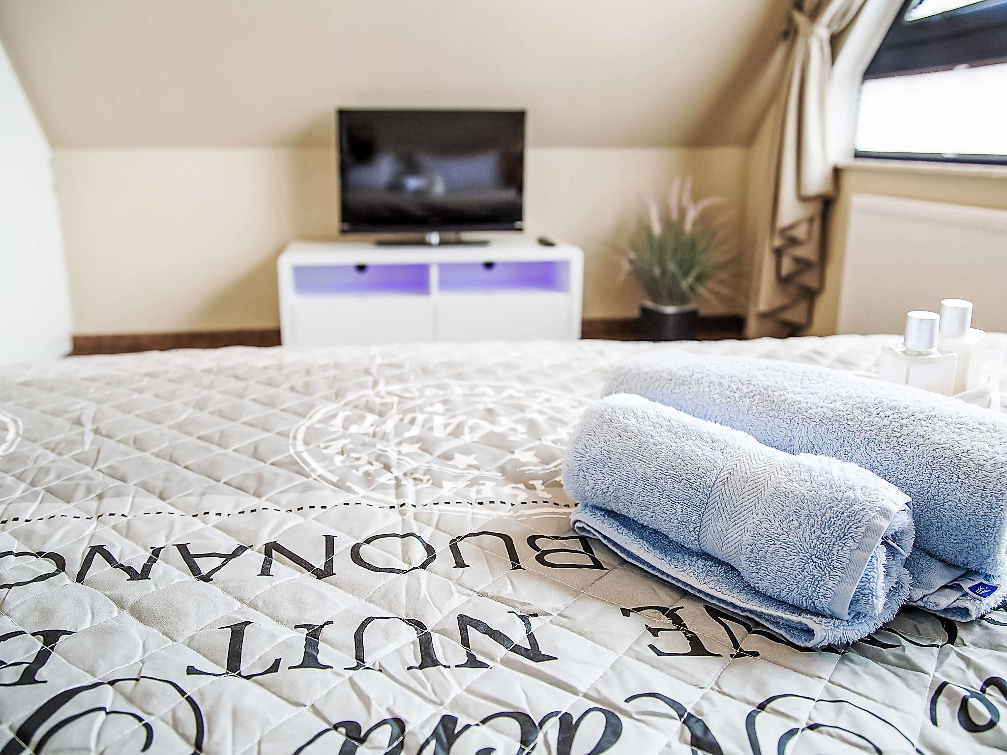 "Witthuus-Wangerooge", 3-room apartment 75 m2, on the top floor. With sloping ceilings, very comfortable and stylish furnishings: living/dining room 30 m2 with satellite TV (flat screen), radio, CD-player and DVD. 1 room 13 m2 with 1 double bed (2 x 90 cm, length 200 cm), satellite TV (flat screen). 1 room 13 m2 with 2 beds (90 cm, length 200 cm), satellite TV (flat screen). Kitchenette (oven, dishwasher, 4 induction hot plates, toaster, kettle, microwave, electric coffee machine). Shower/WC. Underfloor heating. Beautiful view of the resort. Facilities: children's high chair. Internet (WiFi, free). Parking at the house. Please note: non-smokers only.