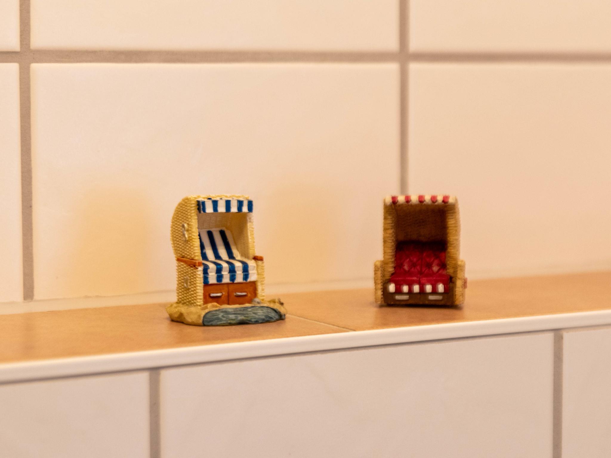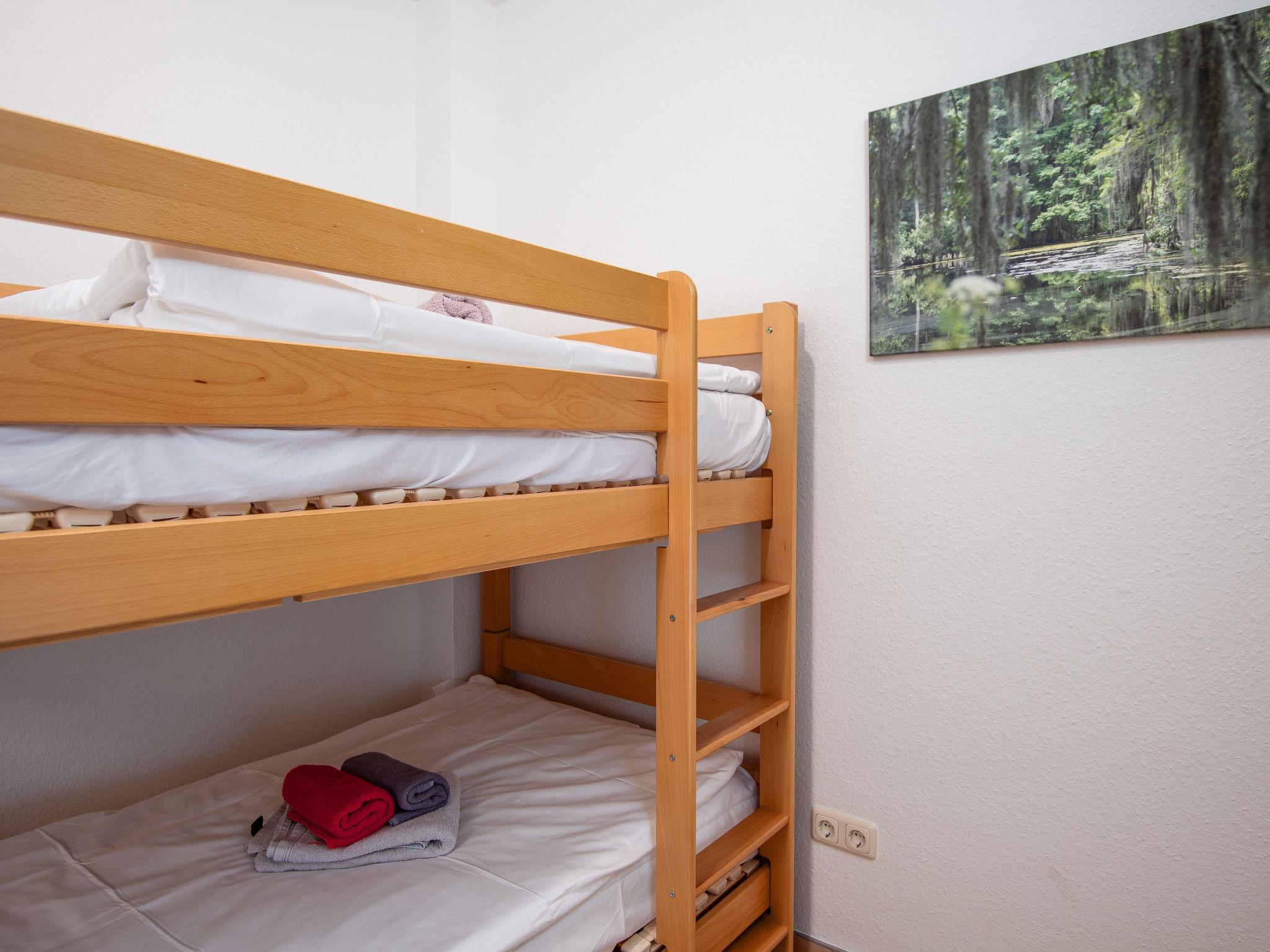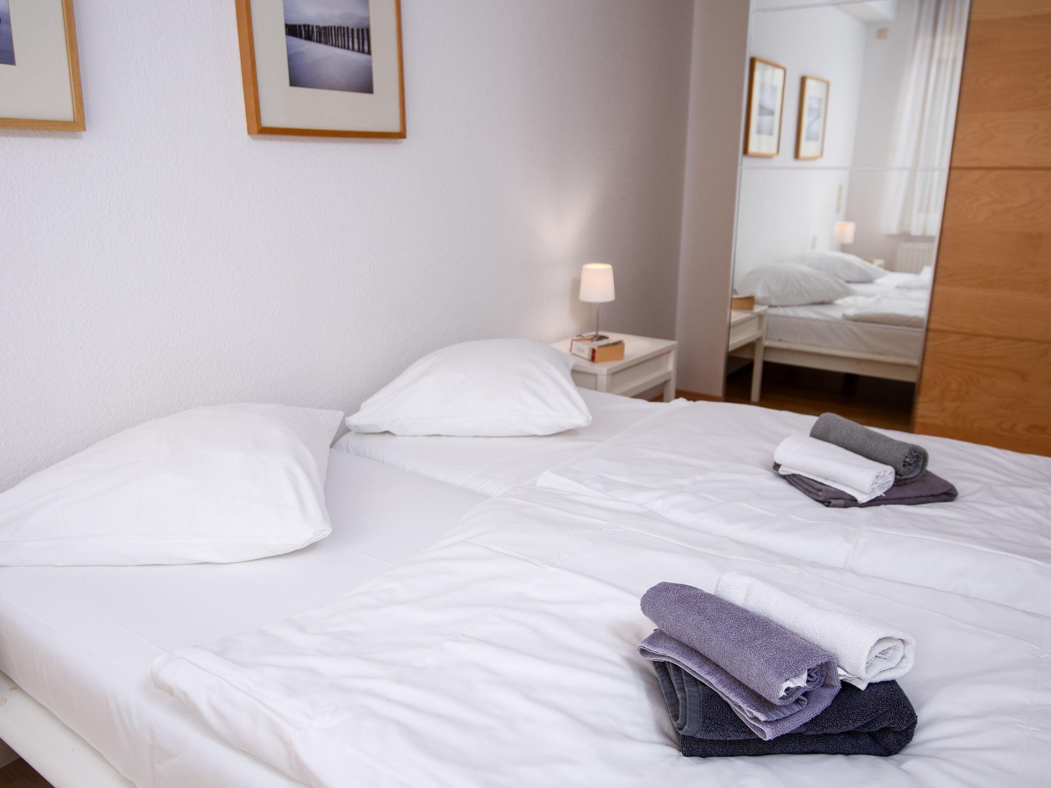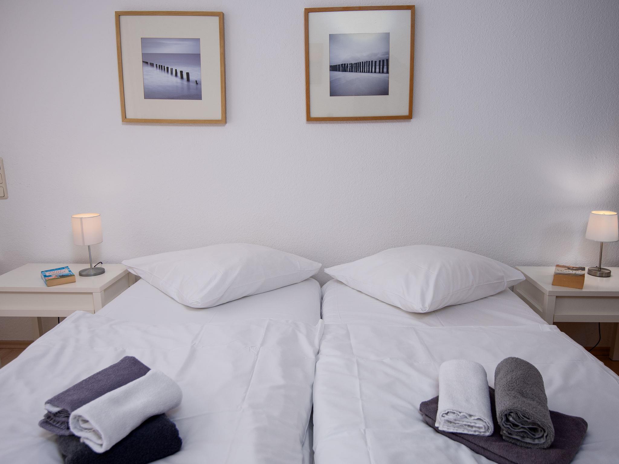 3-room apartment 65 m2, on the ground floor. Tasteful and cosy furnishings: living/dining room with satellite TV (flat screen), radio, DVD and electric shutters. Exit to the terrace. 1 room with 1 double bed (2 x 90 cm, length 200 cm). 1 room with 1 x 2 bunk beds (90 cm, length 200 cm). Kitchenette (oven, dishwasher, 4 ceramic glass hob hotplates, toaster, kettle, microwave, electric coffee machine, Capsules for coffee machine (Senseo) extra). Shower/WC, sep. WC. Terrace furniture, barbecue (portable). Facilities: washing machine, children's high chair (extra). Internet (WiFi, free). Please note: non-smokers only. Smoke alarm.