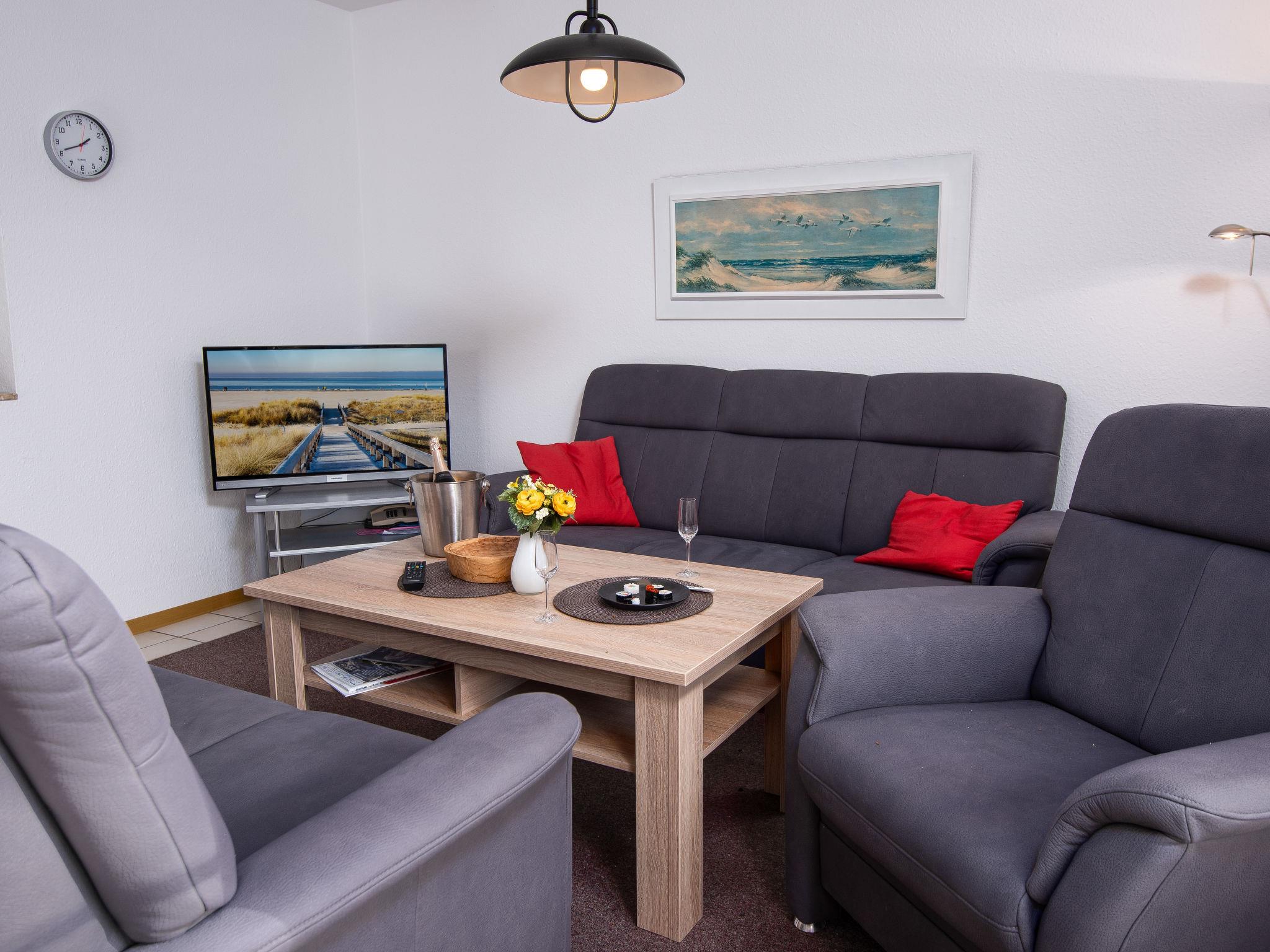 "Küstennebel", 3-room apartment 56 m2, on the ground floor. Living/dining room 23 m2 with satellite TV (flat screen), CD-player. 2 rooms 8 m2, each room with 1 double bed (2 x 90 cm, length 200 cm). Kitchen (4 hot plates, toaster, kettle, microwave, electric coffee machine) with hatch. Shower/WC. Terrace 12 m2. Terrace furniture. Facilities: children's high chair (extra). Internet (WiFi, free). Please note: non-smokers only. Smoke alarm.