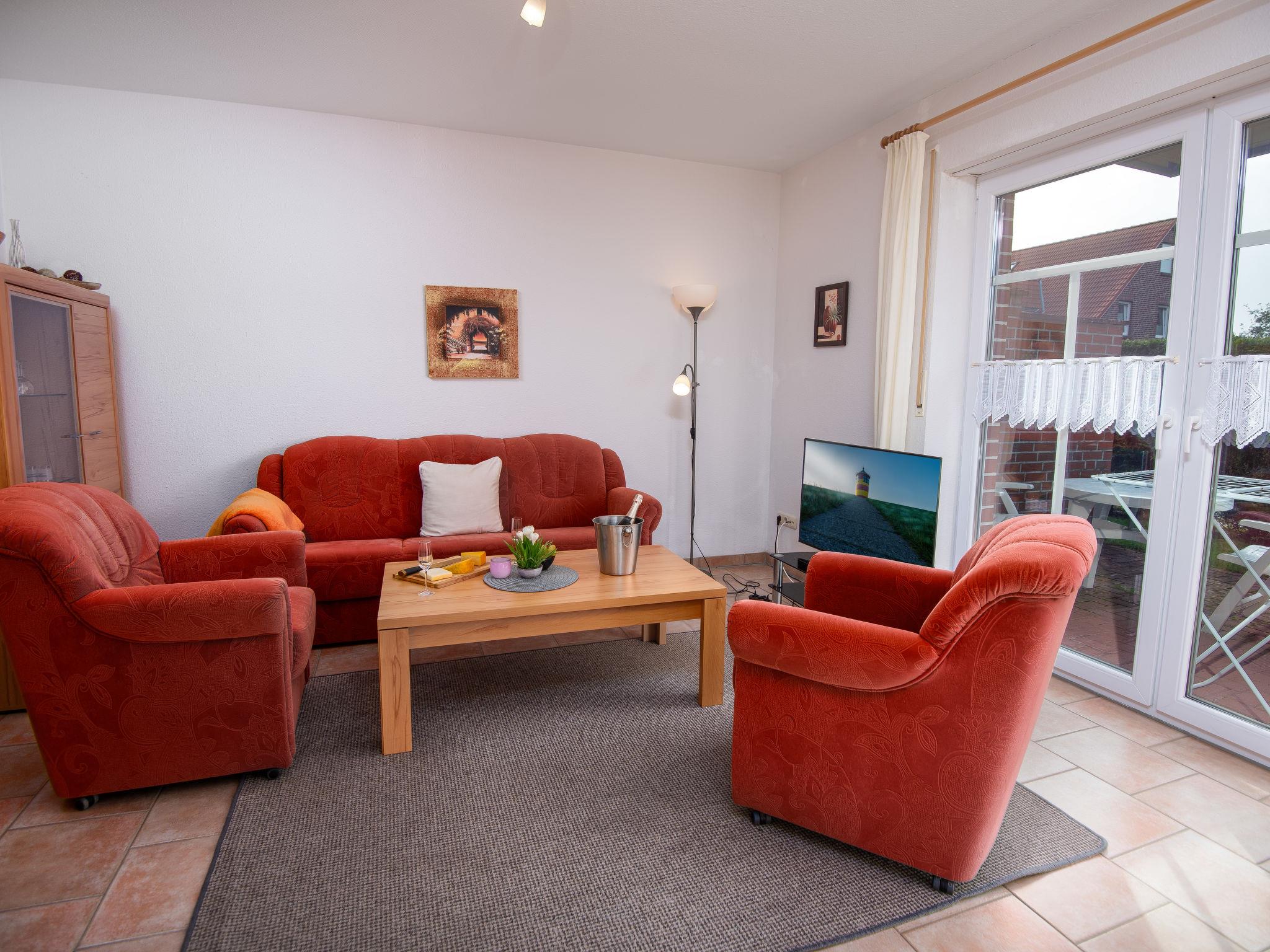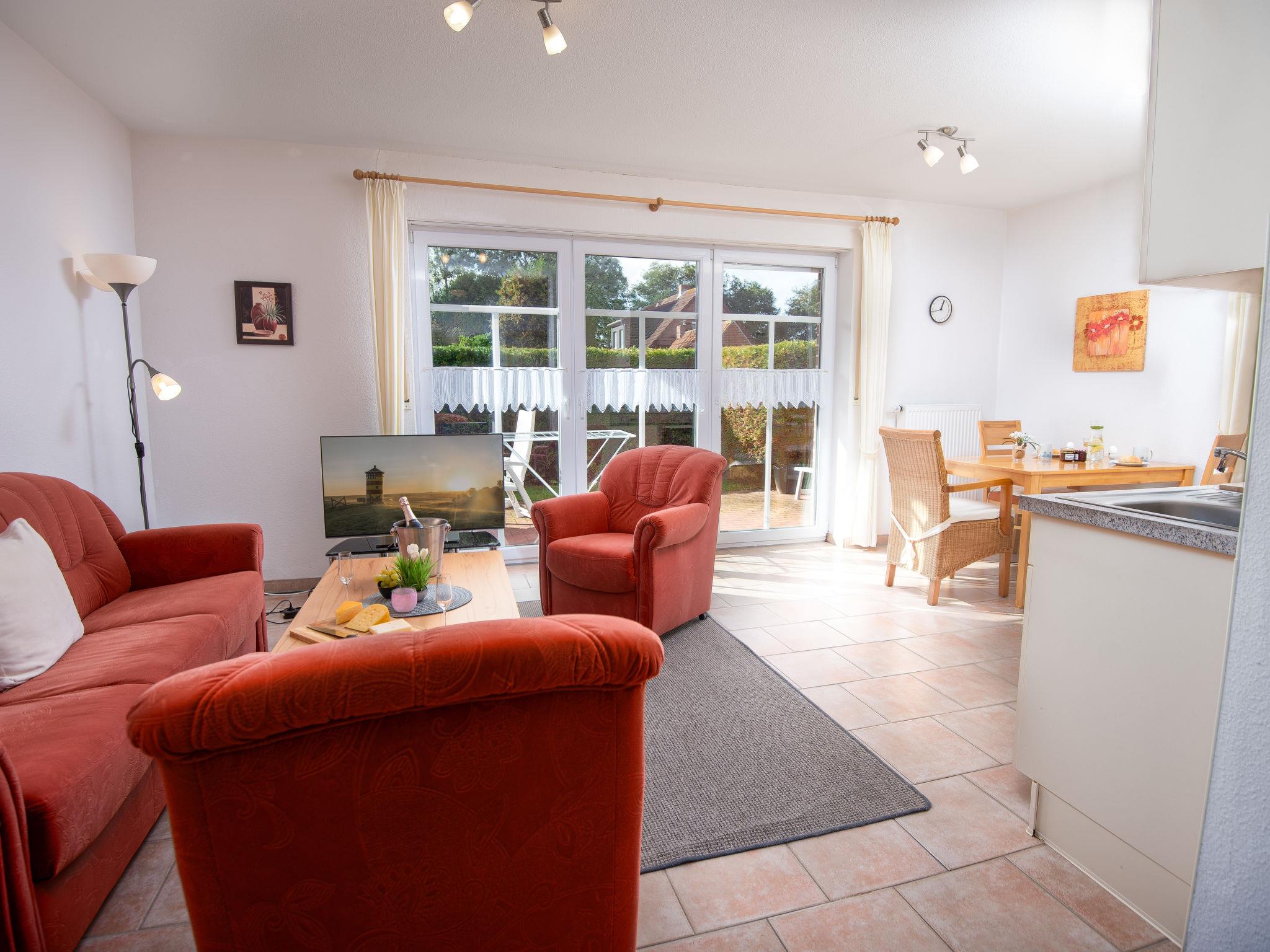 "Westerriede", 2-room apartment 45 m2, on the ground floor. Beautiful and tasteful furnishings: living/dining room 20 m2 with digital TV, flat screen and CD-player. Exit to the terrace. 1 room 11 m2 with 1 double bed (2 x 90 cm, length 200 cm). Open kitchen (oven, dishwasher, 4 ceramic glass hob hotplates, toaster, kettle, electric coffee machine) with dining table. Shower/WC. Terrace 18 m2, lawn. Terrace furniture. Facilities: children's high chair (extra). Please note: non-smokers only. Smoke alarm.