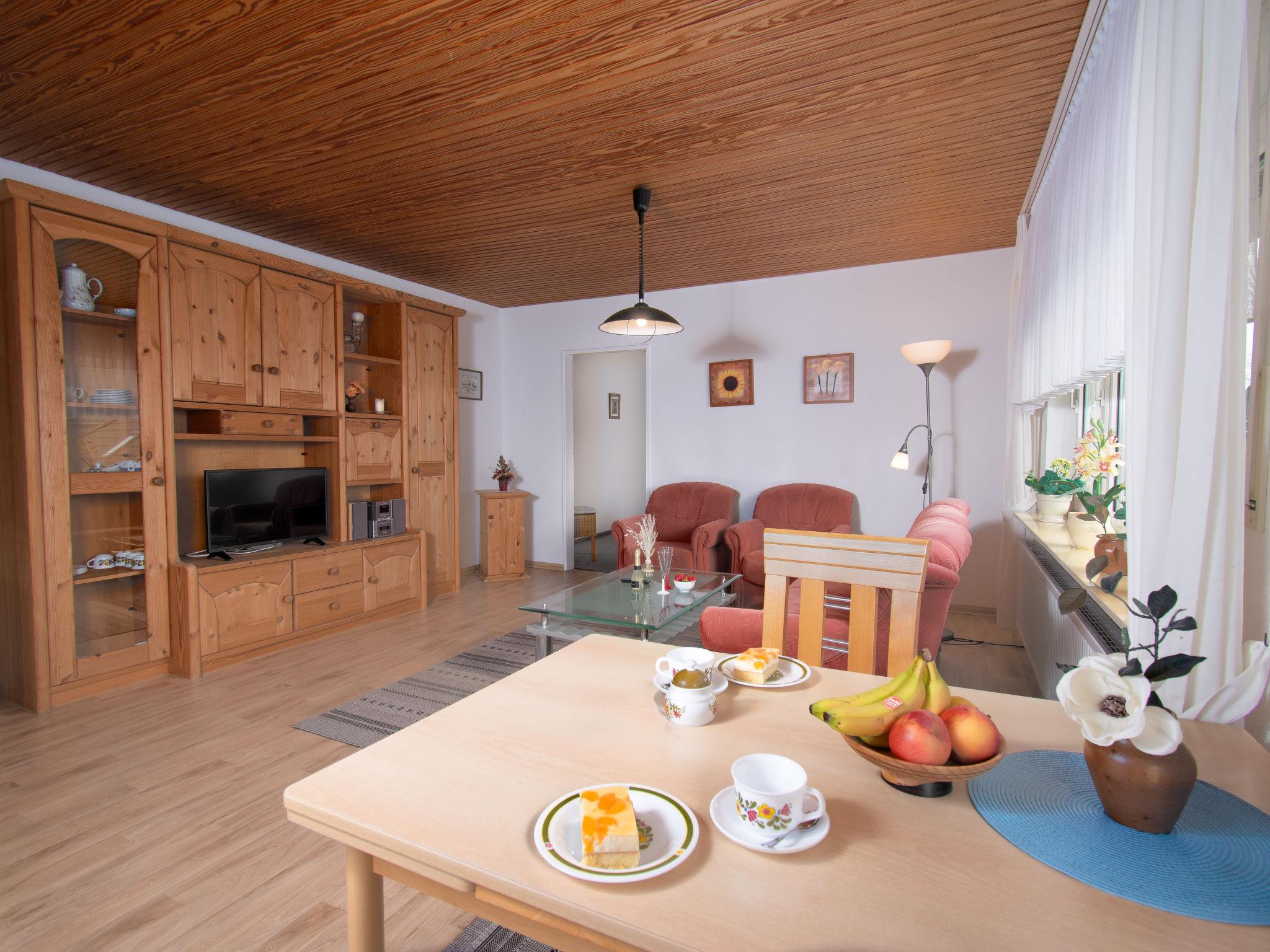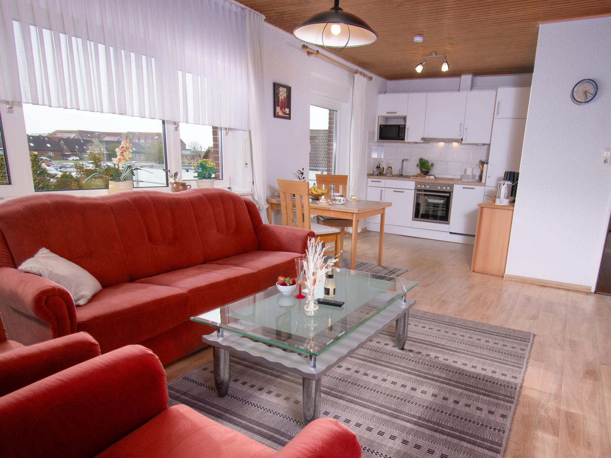 "Lachmöwe", 2-room apartment 50 m2 on 1st floor. Cosy furnishings: living/dining room 24 m2 with cable TV (flat screen), radio and hi-fi system. Exit to the balcony. 1 room 16 m2 with 1 double bed (2 x 90 cm, length 200 cm). Kitchenette (4 hot plates, oven, toaster, kettle, microwave, electric coffee machine). Shower/WC. Balcony 8 m2, north-west facing position and west facing position. Balcony furniture. Facilities: children's high chair (extra), hair dryer. Internet (WiFi, free). Please note: non-smokers only. Smoke alarm.