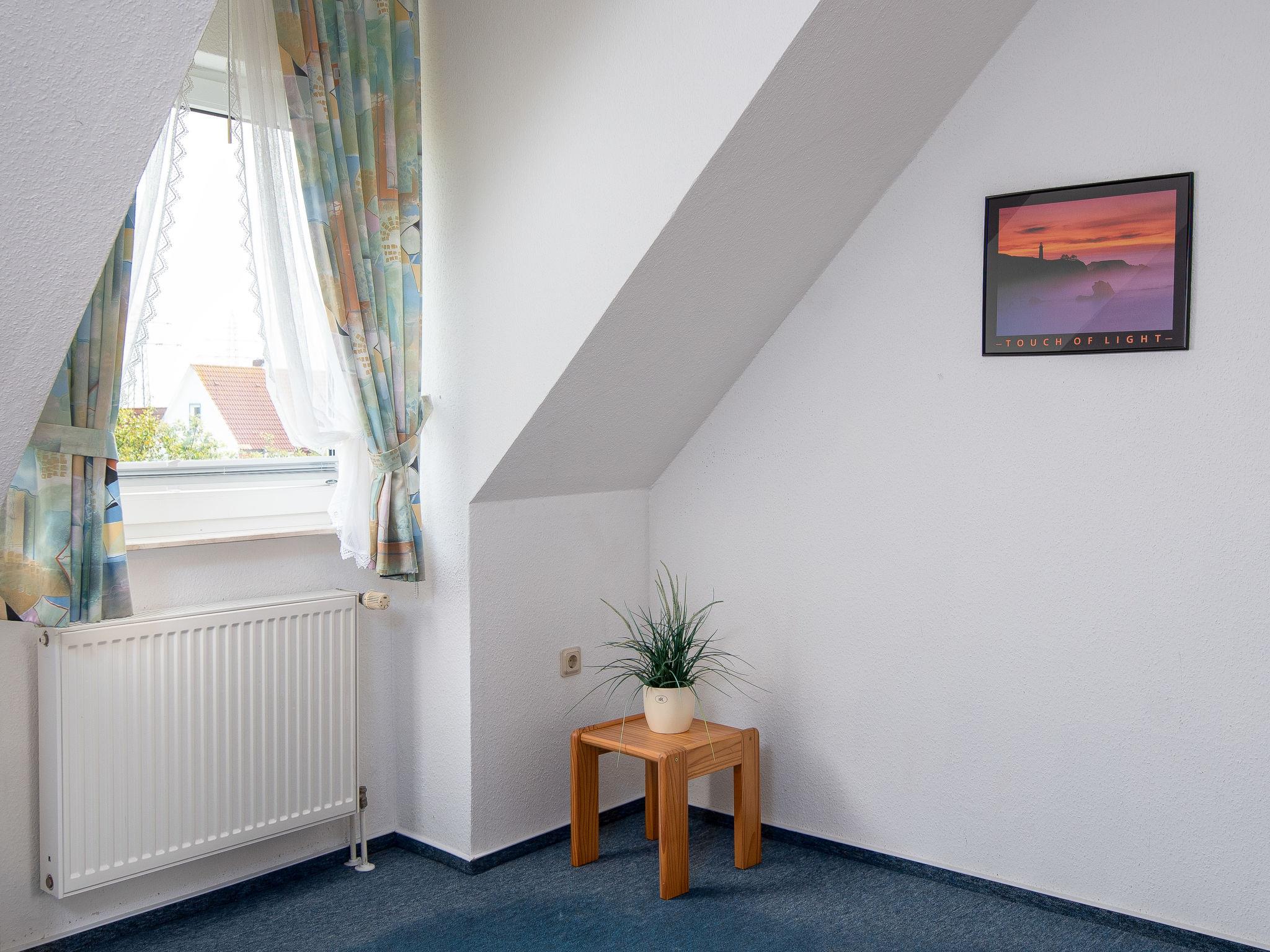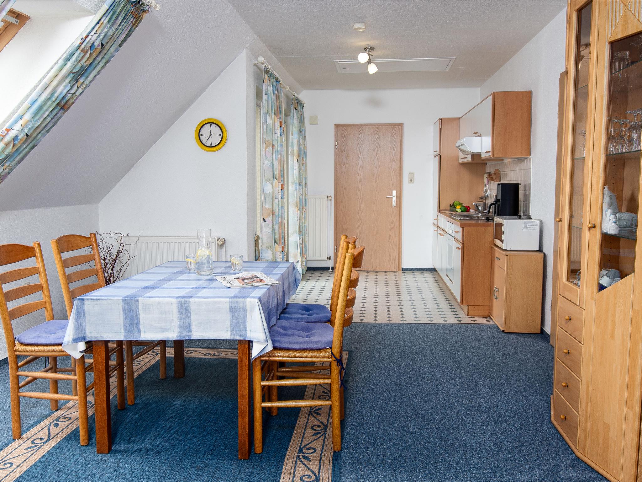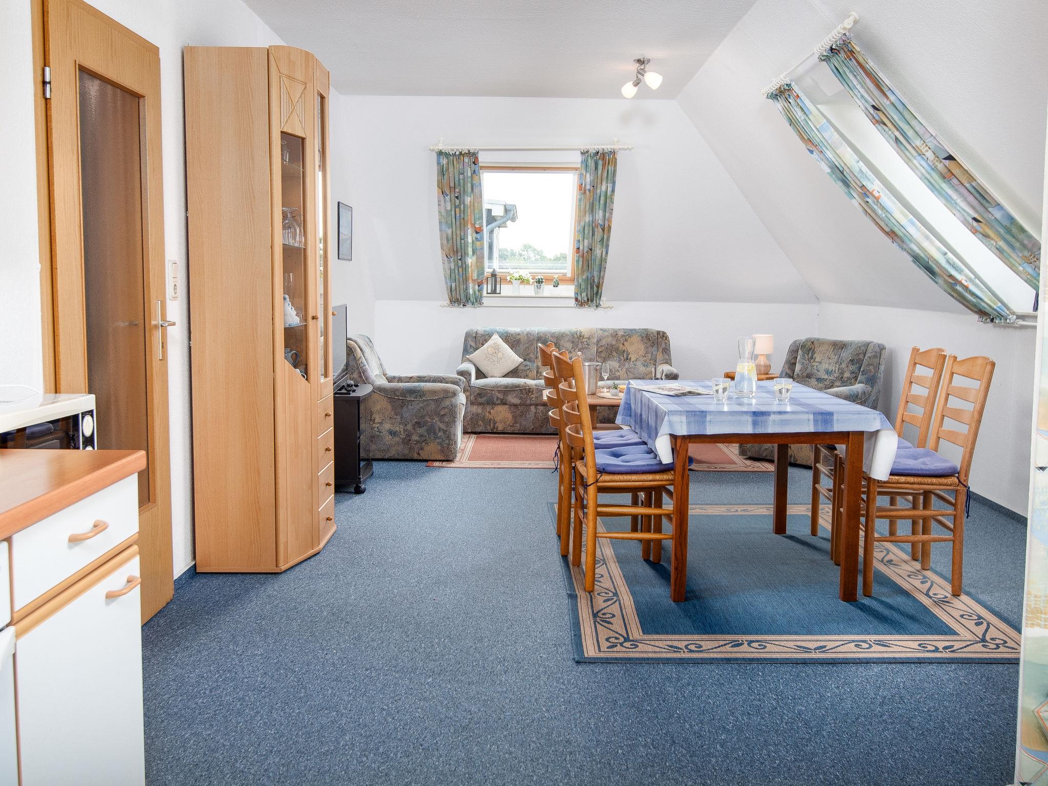 "Mantelmöwe", 2-room apartment 65 m2, on the top floor. With sloping ceilings, cosy furnishings: living/dining room 32 m2 with cable TV (flat screen), hi-fi system. Exit to the balcony. 1 room 13 m2 with 1 double bed (2 x 90 cm, length 200 cm). Kitchenette (4 hot plates, oven, toaster, kettle, microwave, electric coffee machine). Shower/WC. Balcony 10 m2, north-west facing position and west facing position. Balcony furniture. Facilities: children's high chair (extra), hair dryer. Internet (WiFi, free). Please note: non-smokers only. Smoke alarm.
