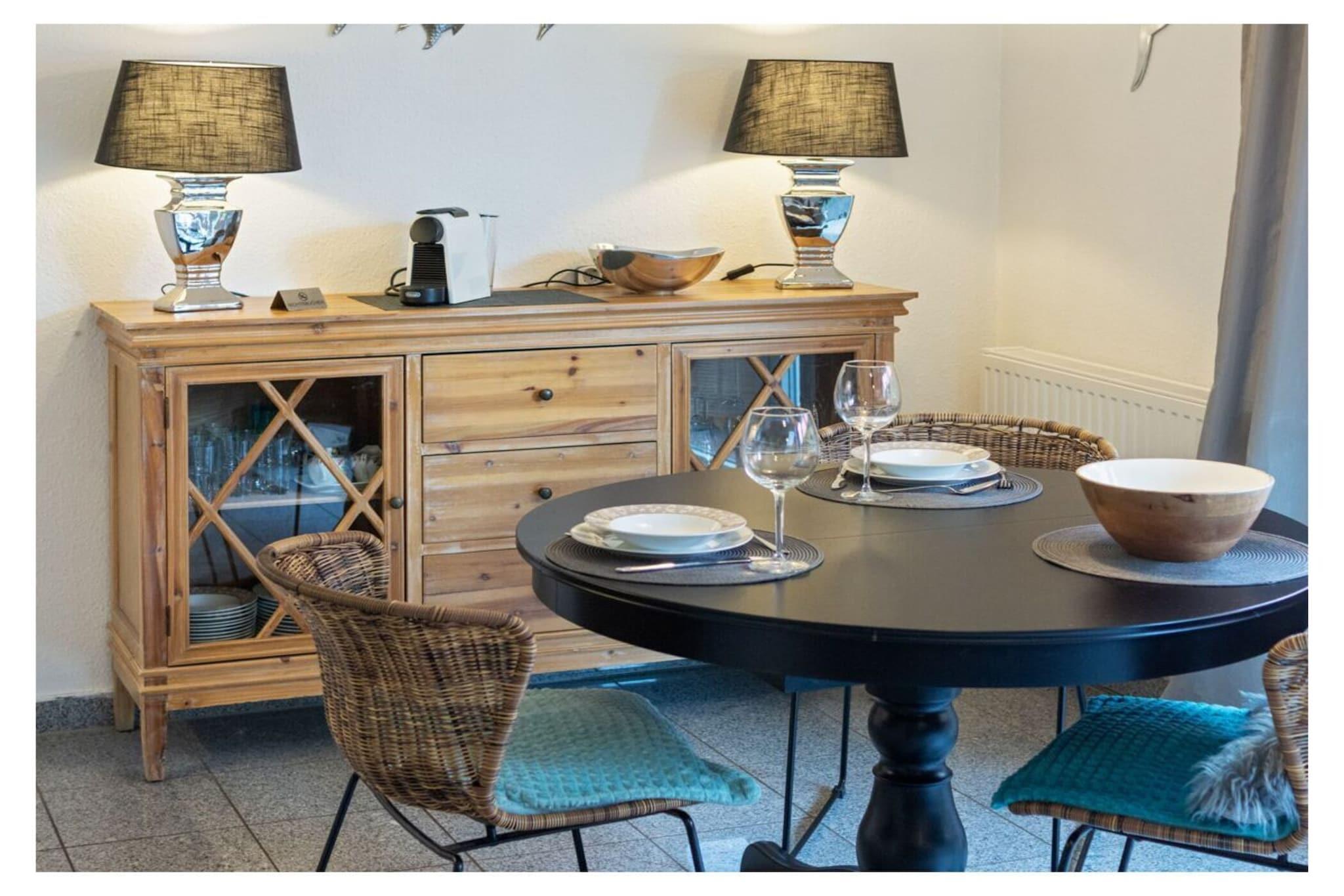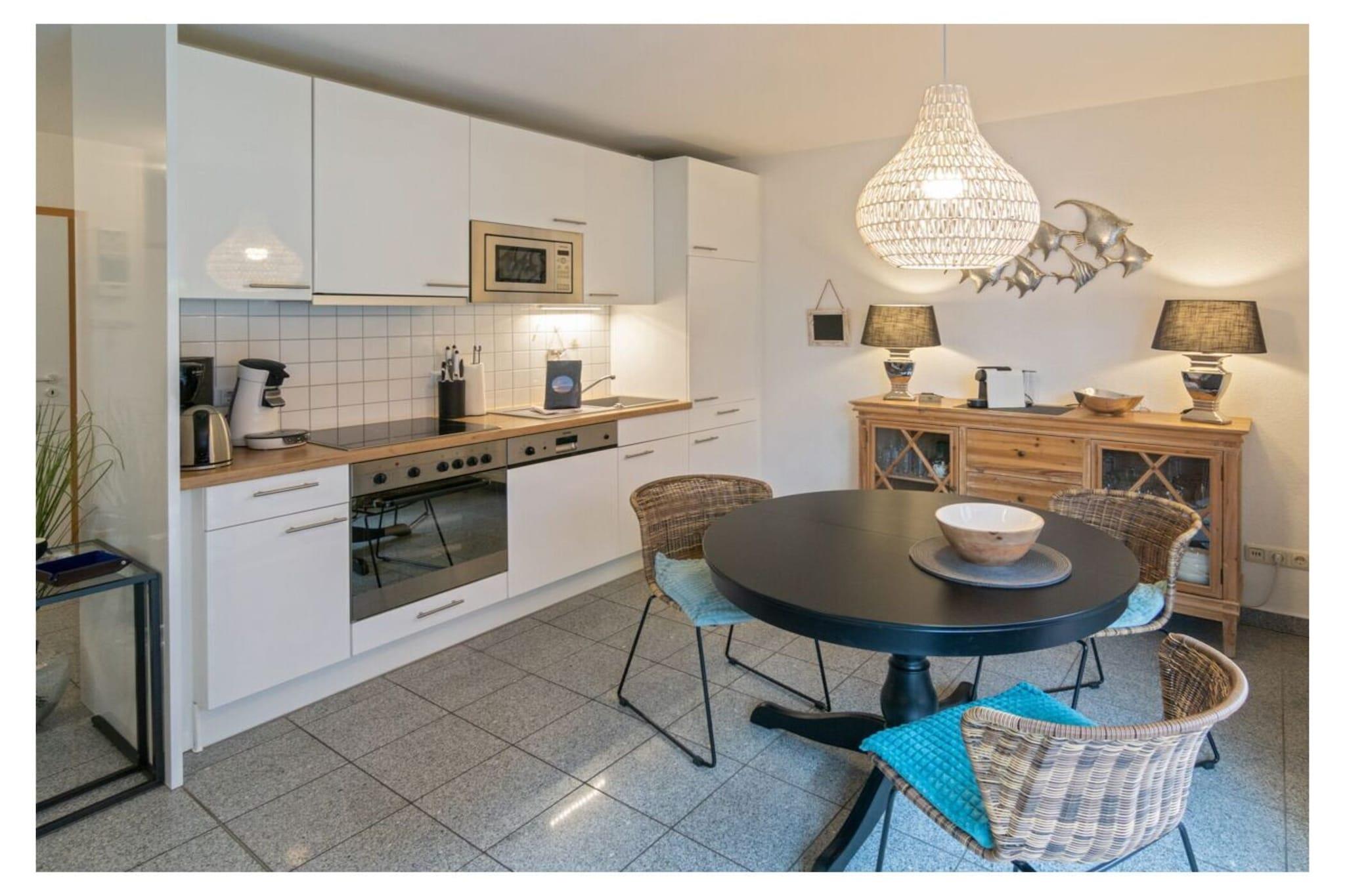 Holiday apartment Dünenrose Anyone who assumes that a holiday apartment is sober and impersonal will quickly be proven wrong by this beautiful property. The holiday apartment Dünenrose lives up to its name. The apartment is located right behind the dune on the extensive beach of Norddeich and leaves nothing to be desired for two to three people with a maximum of one child (baby or toddler). All rooms are cozy and furnished with great attention to detail. In addition, the Dünenrose has all the technical comforts. There are modern flat screen TVs in both the living room and the bedroom with the beautiful four-poster bed. Of course, you also have a satellite system and DVD player as well as a music system at your disposal. The kitchen also has everything your heart desires. In addition to the usual cooking utensils, you will find all electrical appliances here, including a microwave and dishwasher. In the bathroom, the underfloor heating ensures homely comfort even on cold days. Enjoy the immediate proximity to the beach. You can end the evening on the terrace. For a carefree start to your vacation, book our linen package. This consists of bed linen, towels, shower mats, tea towels and a service set (toilet paper, dishwasher tablets, garbage bags, dishwashing brush, cleaning cloths and other little helpers for a carefree start to your vacation.