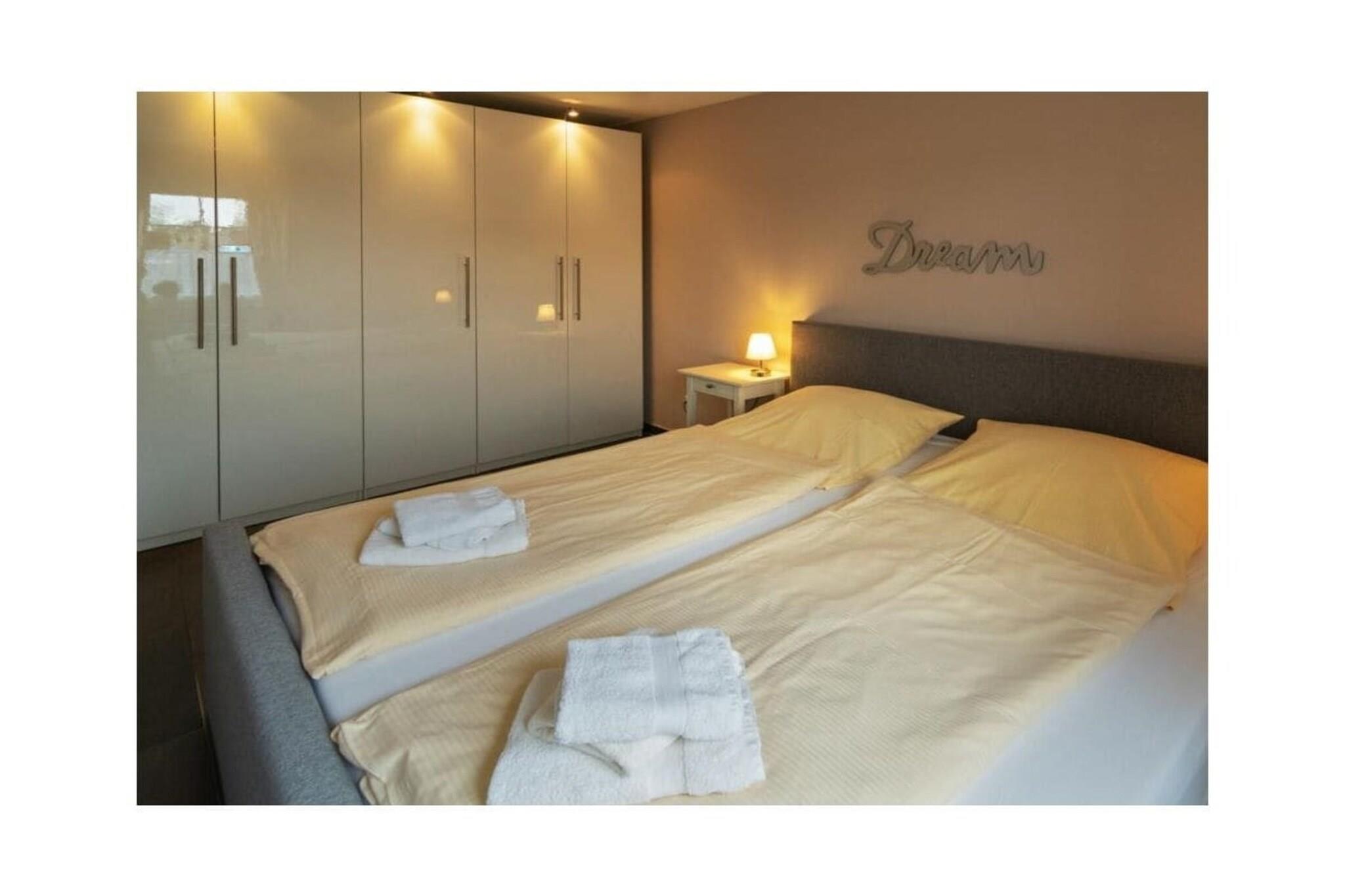 Holiday apartment Meerestraum This beautiful holiday apartment for 2 people near the coast is really a dream. Taste and a sense of style were demonstrated in the renovation and design of the rooms. Many small, loving details make the ambience something very special. The living and dining area is extremely luxurious. Warm wood tones with friendly white and fine leather dominate here. The chic fitted kitchen offers every comfort, including a microwave and a dishwasher. In the living area, a cozy sofa corner offers enough space for evenings together. Here you will find a modern LED/plasma TV, a satellite system and a DVD player, as well as a music system with a USB connection and a collection of board games for completely electronics-free hours together. The bedroom is equipped with a luxurious bed with a light canopy. It is a pleasant place to dream. A baby travel cot can also be placed here for a baby or toddler traveling with you. This will be made available to you if required. Underfloor heating throughout the apartment ensures cozy warmth on cold days. Enjoy your holiday evenings on your own terrace, where there are plenty of places to sit. Your pet doesn't have to stay home alone, because it is very welcome in this apartment. The fee for the dog is EURO10.00 per night. For a carefree start to your holiday, book our linen package. This consists of bed linen, towels, shower mats, tea towels and a service set (toilet paper, dishwasher tablets, garbage bags, dish brush, cleaning cloths and other little helpers for a carefree start to your holiday.