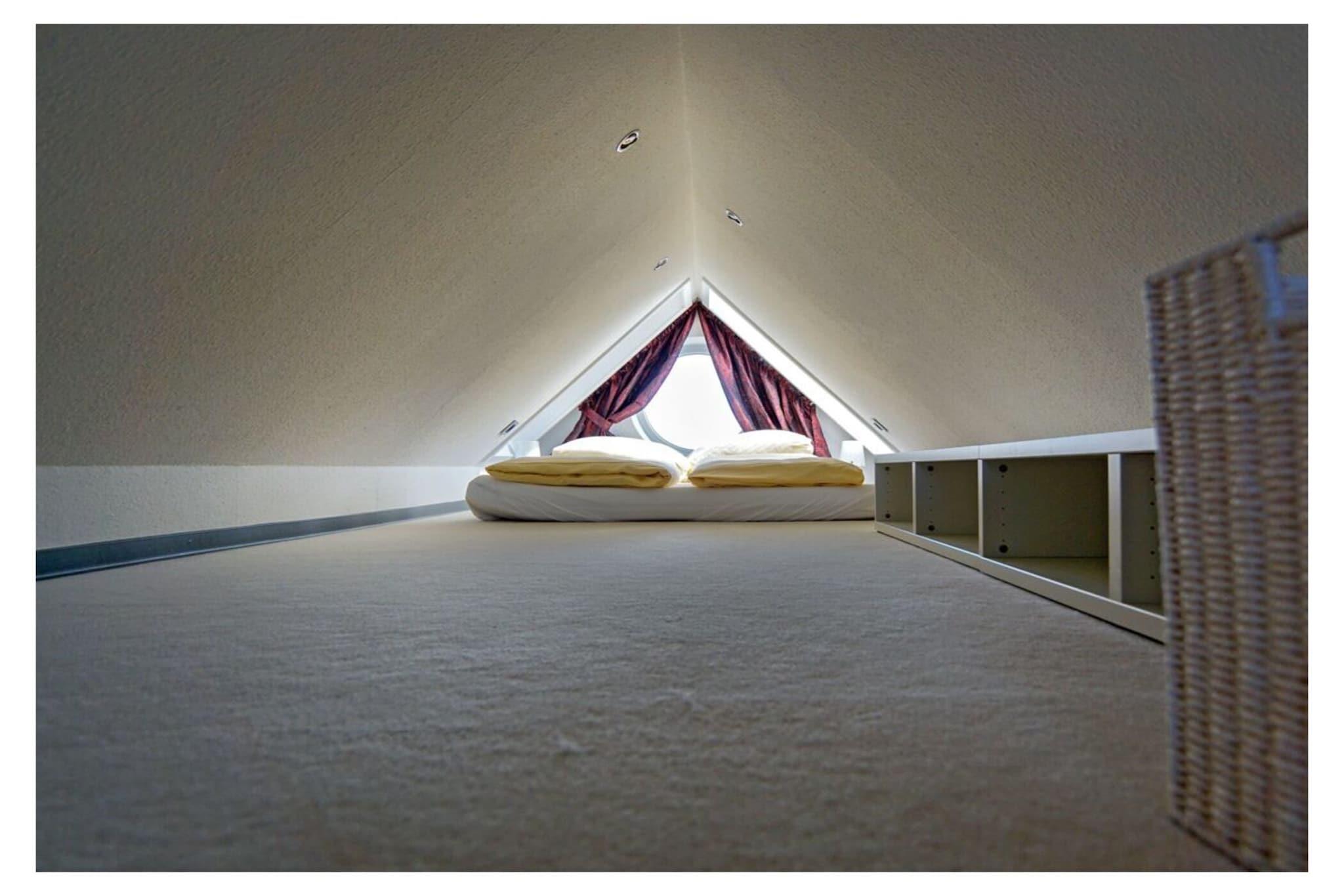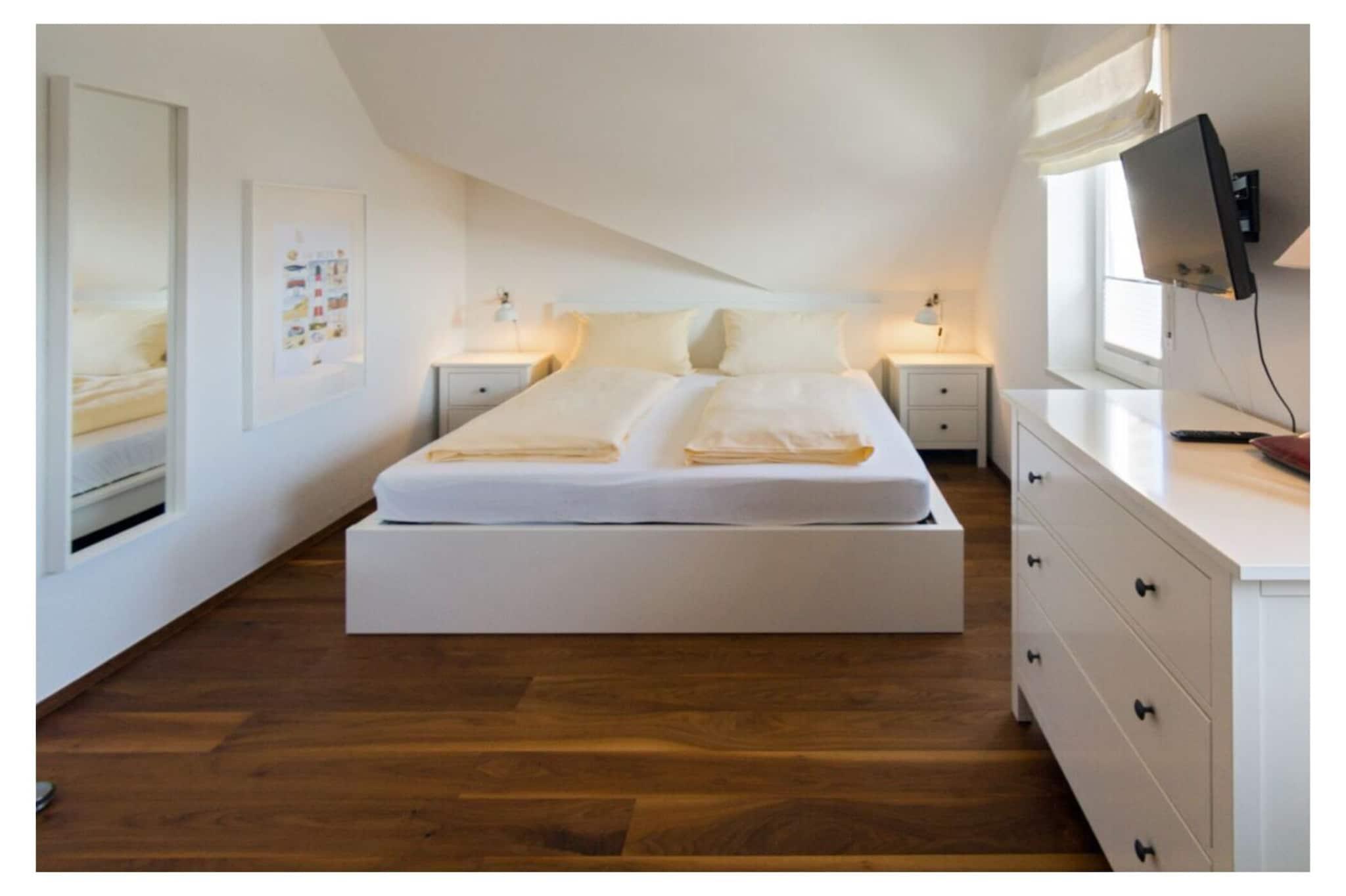 Holiday apartment Norddeich Loft This elegant yet cozy penthouse apartment in the heart of Norddeich offers exclusive living flair - even during the holiday season. The apartment offers a loft-like, spacious living area that combines functionality and luxury in an appealing way. The living and dining areas are deliberately designed to be comfortable. The exclusive fitted kitchen from the "Bulthaupt" brand completes the representative open design of the loft. The parquet floor made of walnut wood, which also has a very luxurious character, is particularly exclusive. The wide window front ensures the perfect incidence of light. Thanks to the modern underfloor heating, comfort is guaranteed in every season. The apartment also has a fireplace in which a warming fire can be quickly lit in bad weather. Two people can find space in the spacious master bedroom with the high double bed. Like the living area, this room is equipped with a modern flat-screen TV. A child can also find additional sleep in an additional extra bed. The loft also has a converted gable in which there is an unconventional mattress camp - ideal for older children who like to look out at the starry sky. For a carefree start to your vacation, book our linen package. This consists of bed linen, towels, shower mats, tea towels and a service set (toilet paper, dishwasher tablets, garbage bags, dishwashing brush, cleaning cloths and other small helpers) for a carefree start to your vacation.