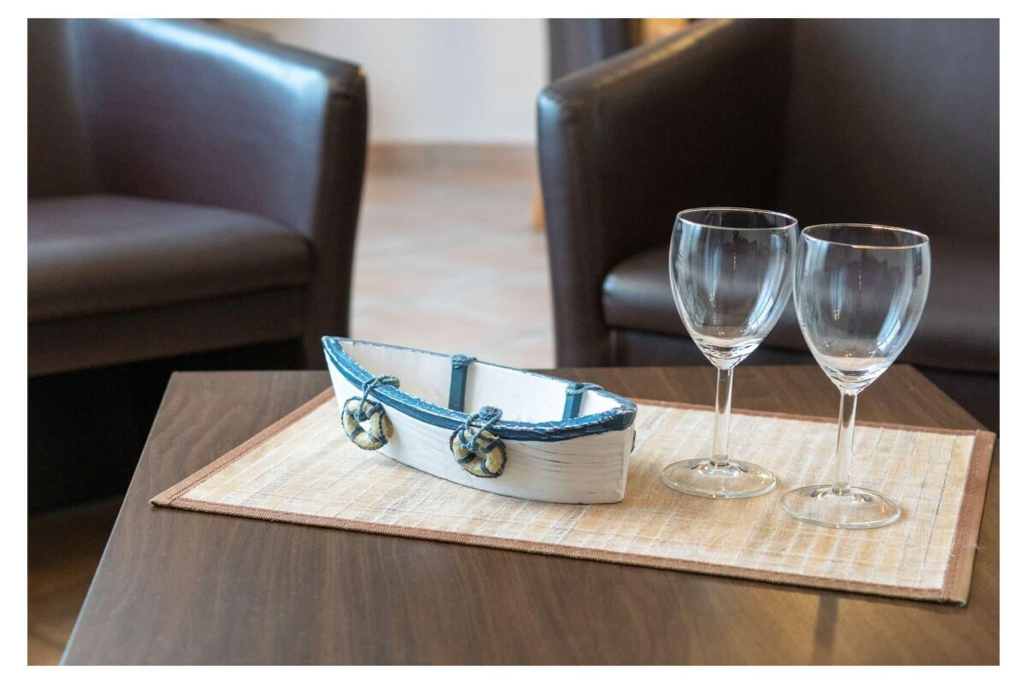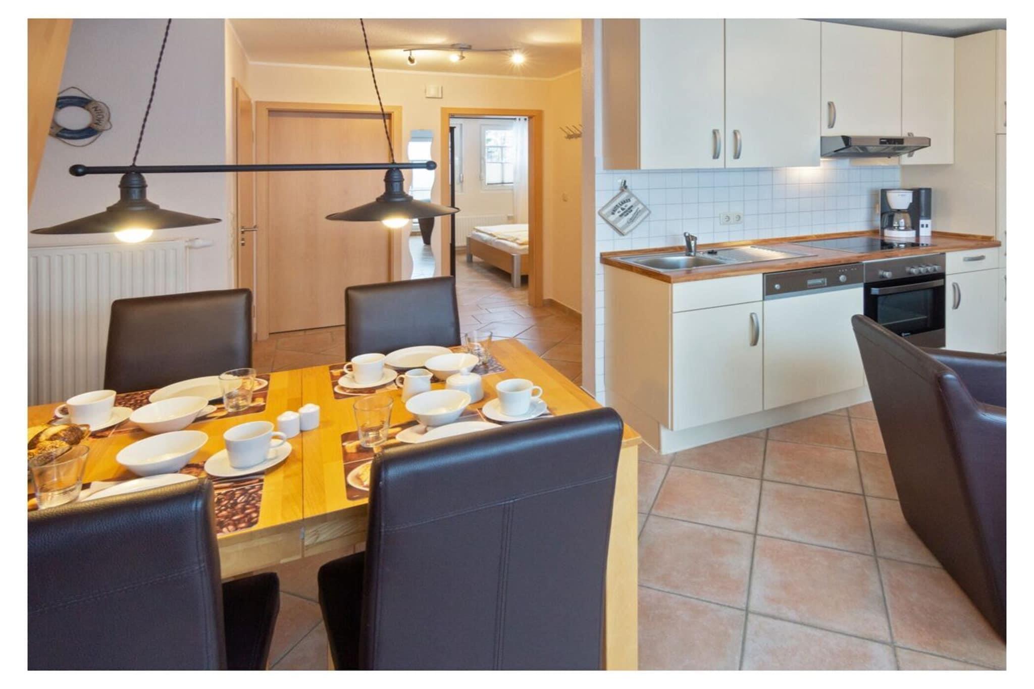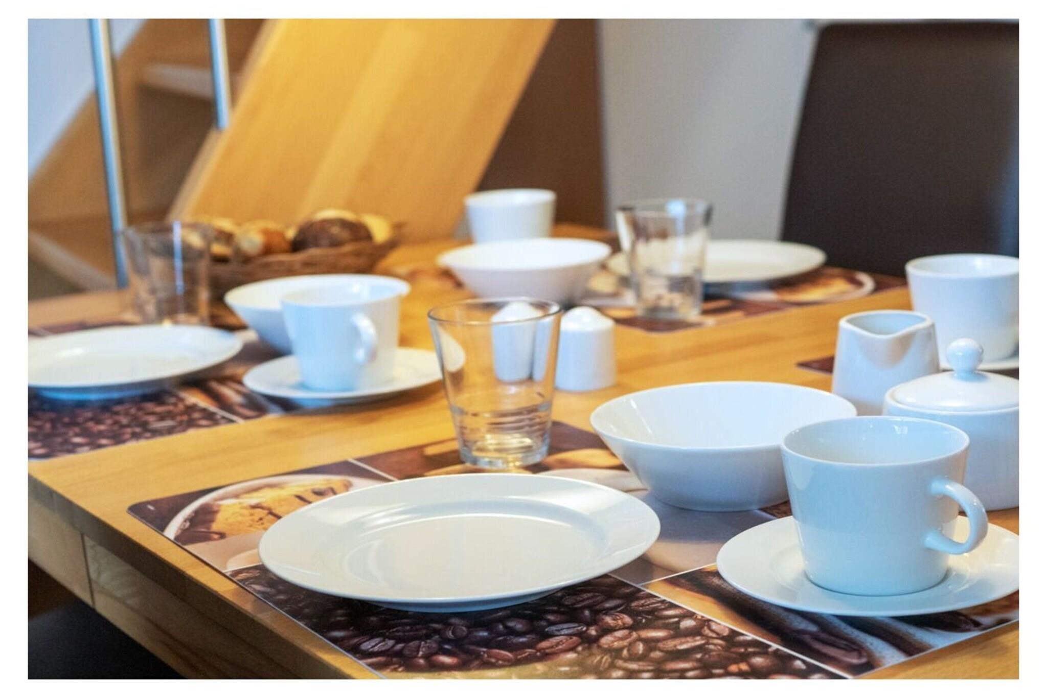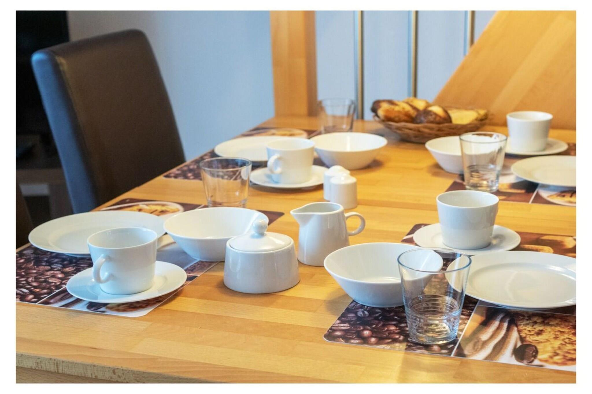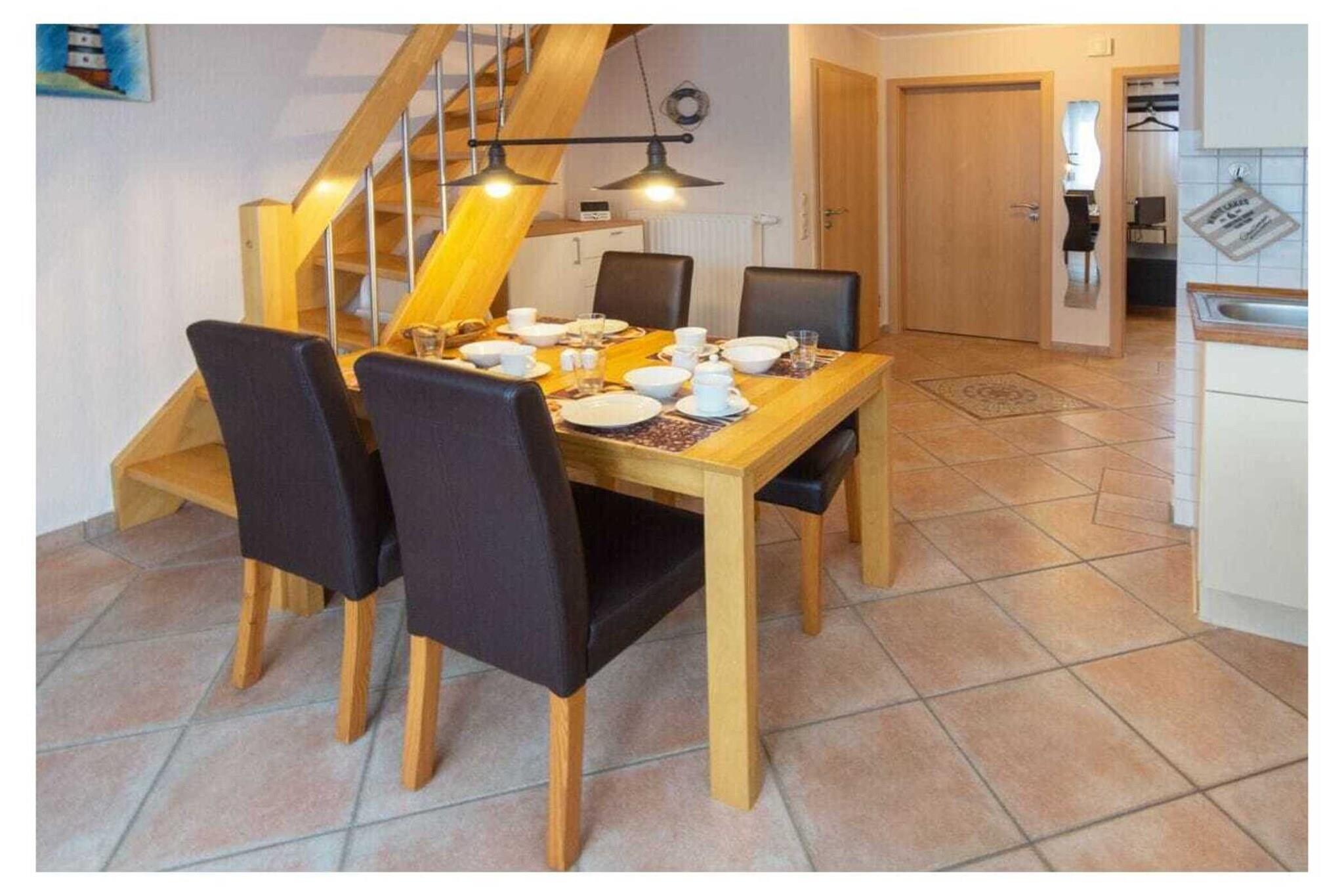Holiday apartment "achtern Deich" The holiday apartment "achtern Deich" is equipped for 4 people. It is located in the north, at Muschelweg 22 K, and there on the upper floor of a terraced house in a quiet side street not far from the beach, it is only about 200 - 300 meters as the crow flies. A combined living room with kitchen and dining area is available to our guests for cooking and sitting together comfortably. The balcony can be used directly from the dining room (furnished). The kitchen is fully equipped, with oven, stove, coffee/pad machine, refrigerator and microwave, dishwasher, dishes, toaster and kitchenette. A bedroom can be found in the basement; here a double bed measuring 180 x 200 with separate mattresses awaits our guests; it is completed with an open closet system and a television with integrated DVD player and a TV with satellite. The bedroom on the upper floor offers additional overnight accommodation with two single beds (90 x 200), as well as an open closet system and a television. In the bathroom we offer a toilet/shower/washing combination - a washing machine is in the storage room. A parking space belongs to the holiday apartment. Smoking is not permitted here. We can provide bed linen, bath mats, tea towels and hand towels on request. Your pet does not have to stay home alone, because it is very welcome in this apartment. The fee for the dog is EURO10.00 per night. For a carefree start to your holiday, book our linen package. This consists of bed linen, hand towels, bath mats, tea towels and a service set (toilet paper, dishwasher tablets, garbage bags, dish brush, cleaning cloths and other little helpers for a carefree start to your holiday.