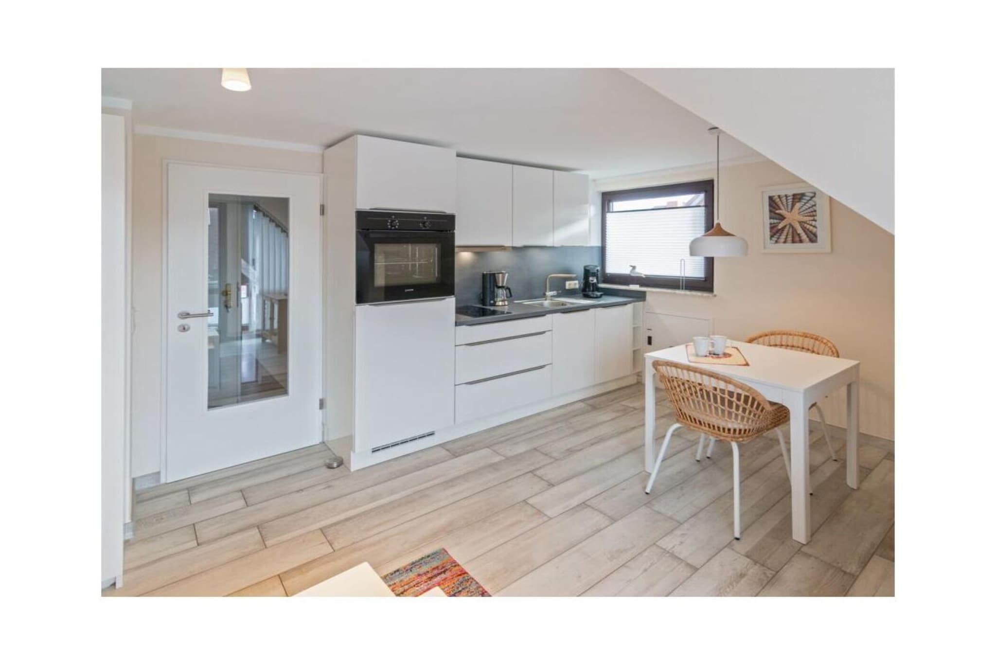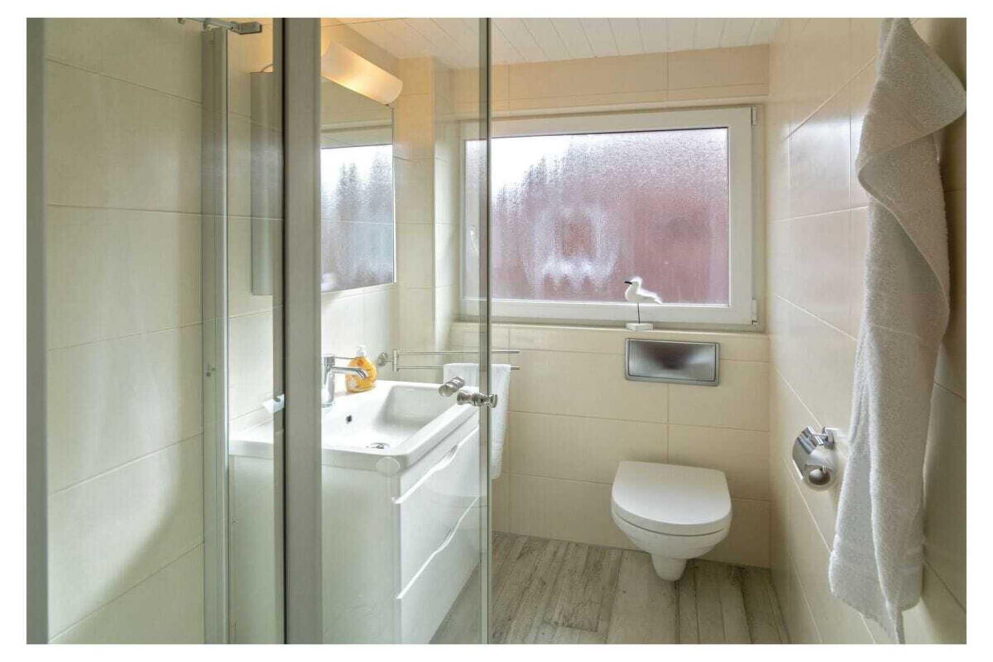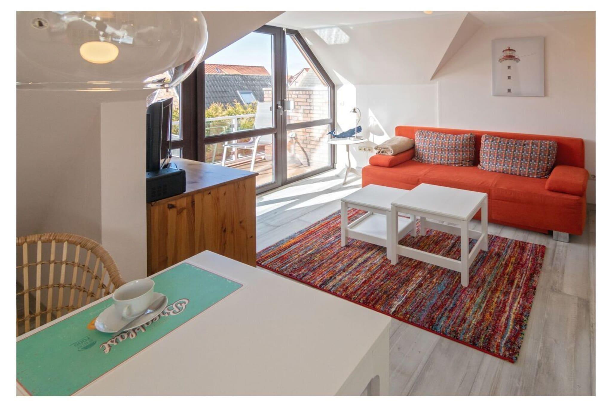 Holiday home Am Koper Sand 15, house "Ekke Nekkepenn" (Apartment 3, first floor, right, Gyde) In this holiday apartment in the holiday home Ekke Nekkepenn, nothing stands in the way of a relaxing holiday in the beautiful Norddeich. The Ekke Nekkepenn house consists of four residential units. Thanks to its detached location in a quiet side street, you can look forward to a peaceful time, far away from the usual tourist activity. Nevertheless, you live centrally: In just ten minutes on foot you can reach the dike and let your gaze wander over the North Sea. It is also only a few minutes to Dörper Weg. The holiday apartment The holiday apartment is optimally designed for two people and has an open living and dining area with an integrated kitchen. Cooking, eating and living form a unit here, so that you can look forward to evenings together. The kitchen area has been furnished compactly and functionally. Here you will find everything you need to prepare a meal. The equipment includes a stove with 2 hotplates, a coffee machine and a pad machine, a refrigerator and even a dishwasher as well as a toaster, egg cooker and mixer. Sufficient dishes, glasses, cups, etc. are of course also available. There is a corner seating area directly attached. In the evening, guests can make themselves comfortable in the living area. The holiday apartment also has a comfortable 2-seater couch with a coffee table. A television and stereo are of course available, so you can look forward to one or two TV evenings. A door leads directly from the living area out onto the balcony facing south-west. In the comfortable seating area, you can enjoy sunny, warm days well into the evening. The apartment also has a bedroom, which is equipped with a 140 x 200 cm double bed with a full-length mattress and another small closet. Additional wardrobe and utensils are in the closet.