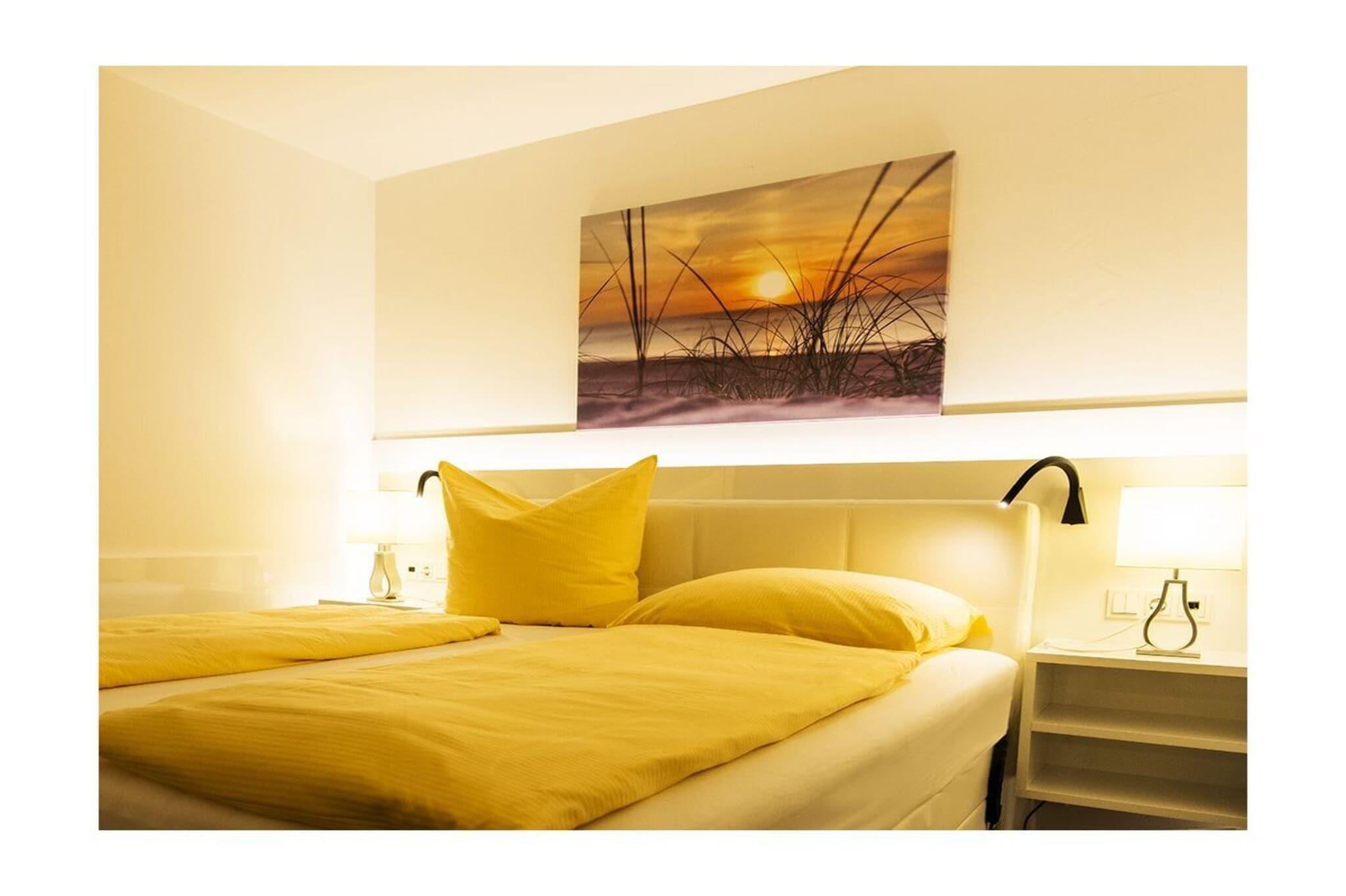 Luxury Apartment Norddeich Dream Pearl Experience a luxurious holiday in Norddeich. This holiday apartment offers you an extraordinary flair. Completely renovated in 2019, the apartment not only offers every comfort that guests could wish for for a pleasant stay, but also sets high standards with its luxurious furnishings. The holiday home is in a prime location in the heart of Norddeich. Only a few meters separate the holiday guest from the dike and the beach behind it. It is also only a few minutes' walk to the center with its various leisure activities and shopping opportunities. Nevertheless, guests can look forward to a quiet location in which absolute relaxation from everyday life is possible. The holiday apartment The heart of the apartment is the spacious living room. The very elegant sofa is a great place to relax. Perfect entertainment is guaranteed thanks to the large wall-mounted TV. The room has an exquisite flair not least thanks to the high-quality modern vinyl floor. The trendy LED lighting also provides pleasant, warm light. As in the rest of the apartment, this is built into the suspended ceiling construction. If required, the lighting can be dimmed individually. All windows in the room as well as the patio lift-sliding door are equipped with fly screens and electrically operated roller blinds, and there are also elegant pleated blinds on two French doors. The kitchen is also completely new, in addition to high-quality kitchen appliances, a back wall with 2 seats for the dining area has been integrated, and there are 2 very comfortable kitchen chairs on castors to match. In the bedroom there is a new 1.80m x 2.00m box spring bed with an additional back wall panel structure, in which an LED light strip is built behind the headboard and on the sides. In addition to the usual bedside lamps, the bed has two high-quality gooseneck reading lamps. There is also a sufficient