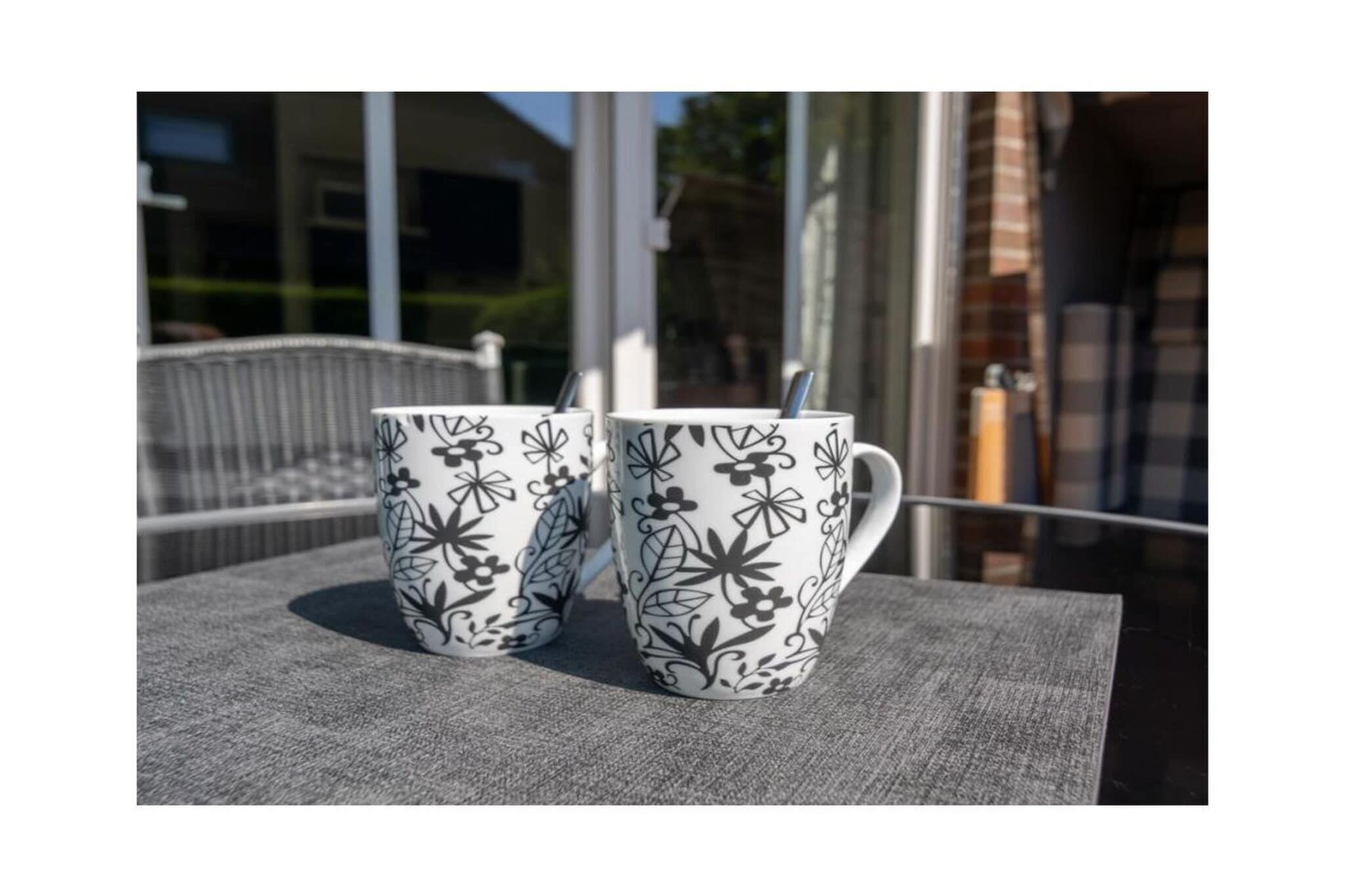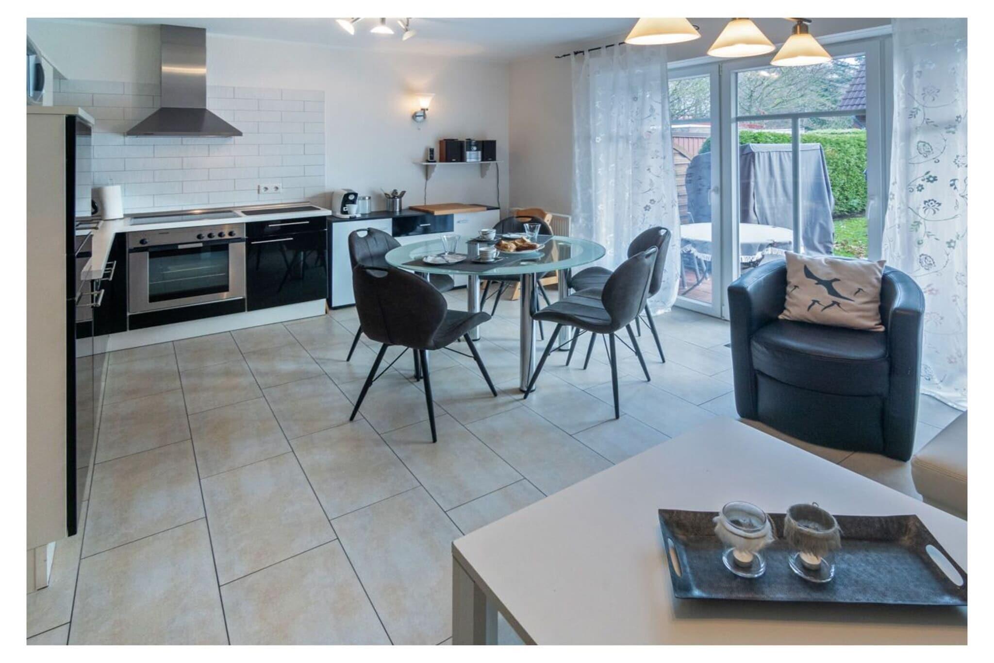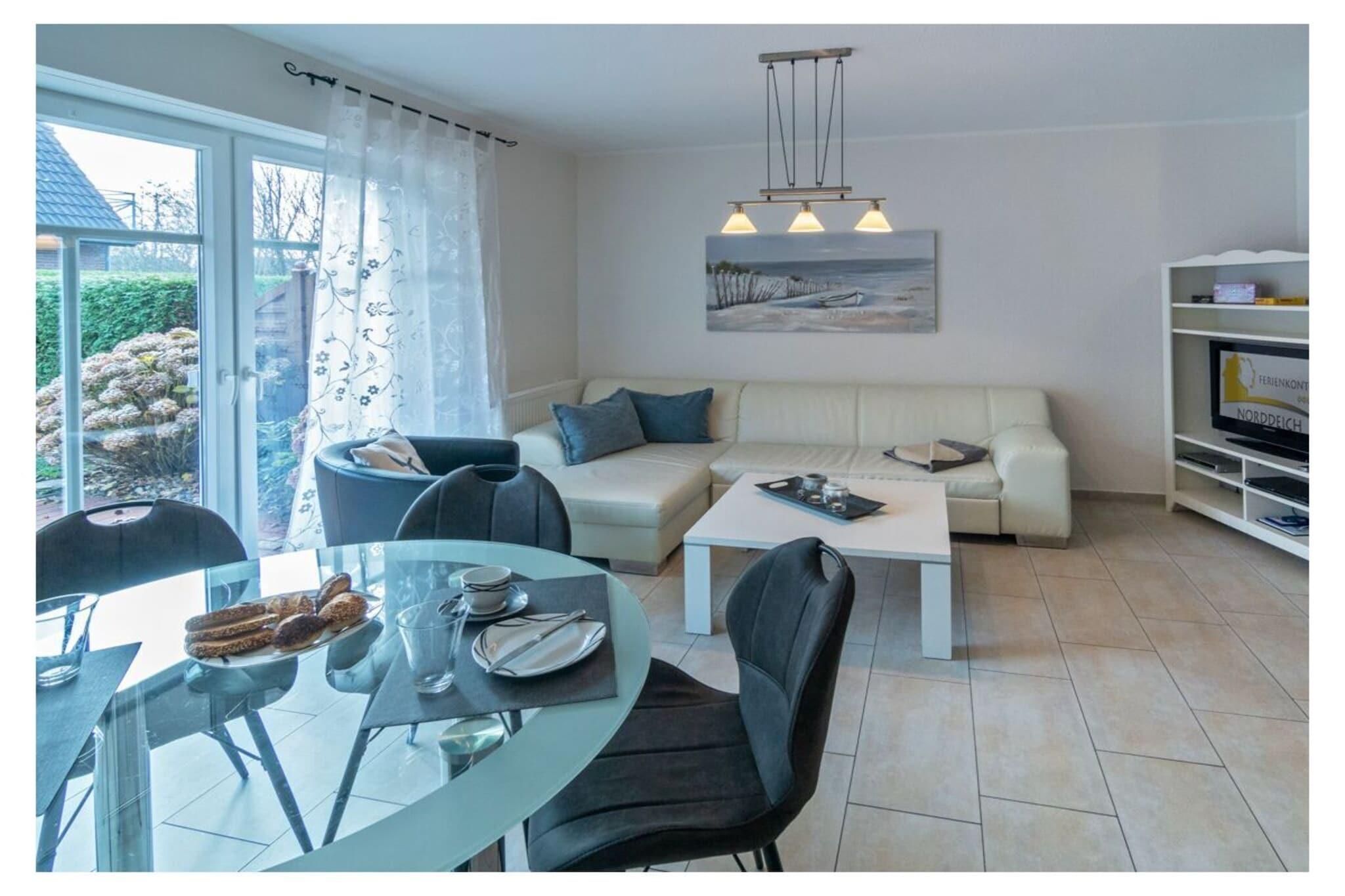 Holiday apartment Leuchtfeuer 1 ground floor A stay in this beautiful and bright holiday apartment promises unadulterated holiday pleasure. The apartment is in a central location in Norddeich. The regional leisure activities, restaurants and numerous shops can be reached in a few minutes on foot. In the middle of the action, you can also enjoy absolute peace and quiet, because the apartment building is located in a quiet side street with no traffic. This means you can enjoy all the advantages of your Norddeich holiday - relaxation and leisure activities - to the fullest. The holiday apartment The very bright and friendly holiday apartment has space for two people. A lot of emphasis was placed on creating a cozy ambience when furnishing it. At the same time, the black and white color scheme and the sparing, but carefully selected decoration appear very modern. The entire apartment has been laid out with modern and practical tiles. The heart of your holiday home is the living and dining area with integrated fitted kitchen. This is where you can come together, whether to relax in the comfortable sofa corner in front of the TV, to have a quiet chat, to cook together in the modern kitchen or to eat together at the dining table. The TV area is equipped with a DVD and Blu-ray player, so nothing stands in the way of your cozy evenings in front of the TV. There is also access to the garden here. With its southeast orientation, it offers you the opportunity to enjoy the sunrise on nice days and thus start the day properly. The integrated seating area ensures comfort. The beach chair provides a real North Sea flair. A charcoal grill is also available. The fitted kitchen is equipped with everything you need for cooking together. You will find a stove with oven, a modern coffee pad machine, a refrigerator, a microwave, a dishwasher and a coffee machine.