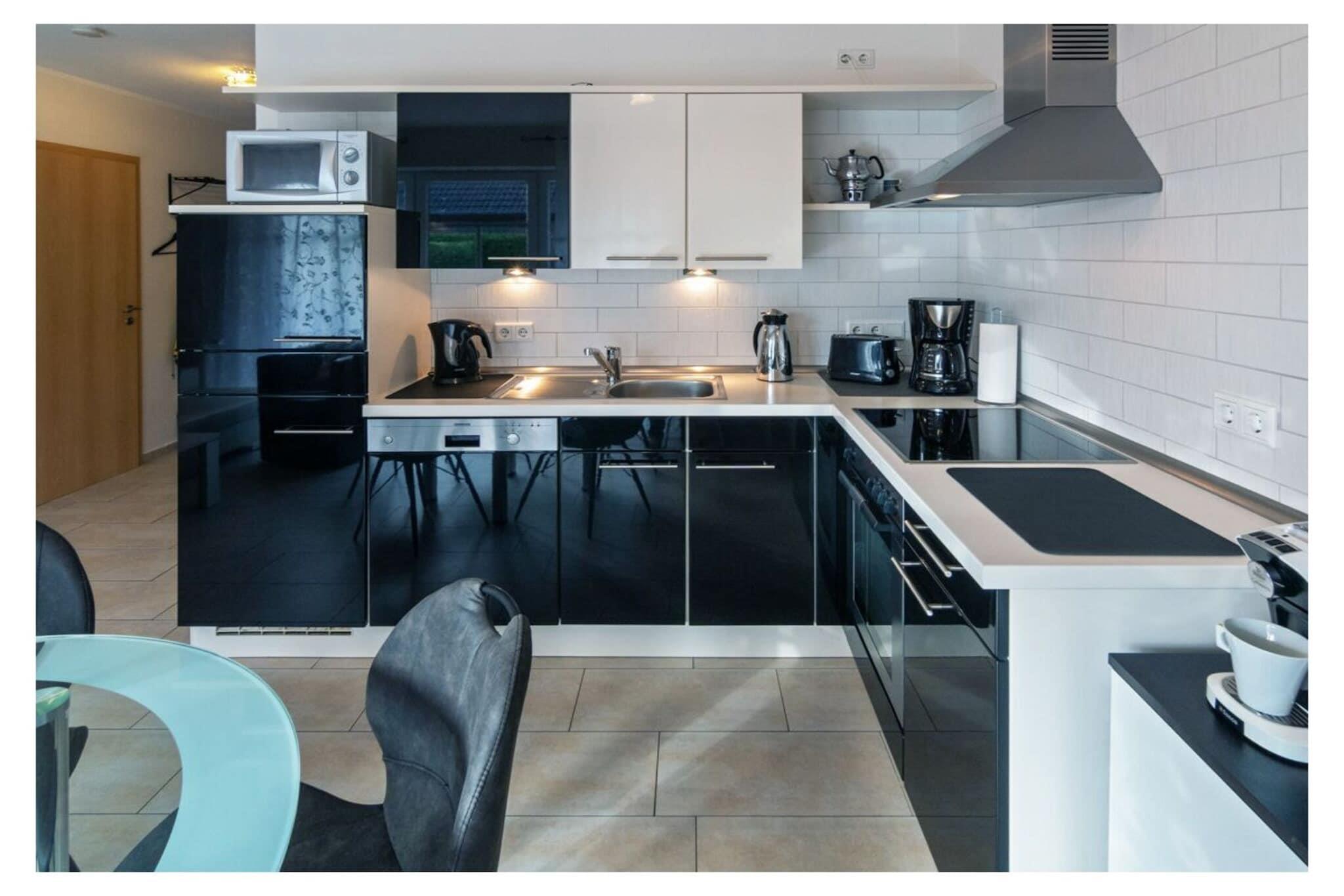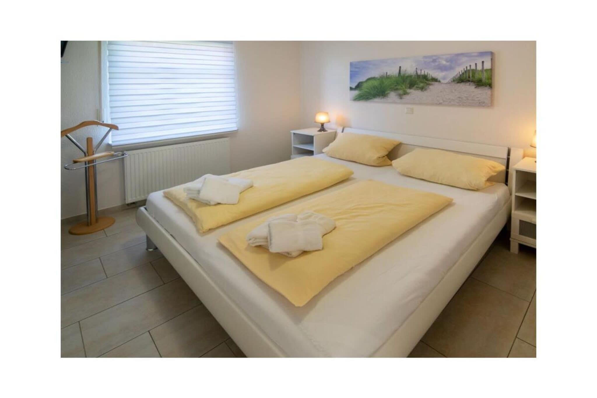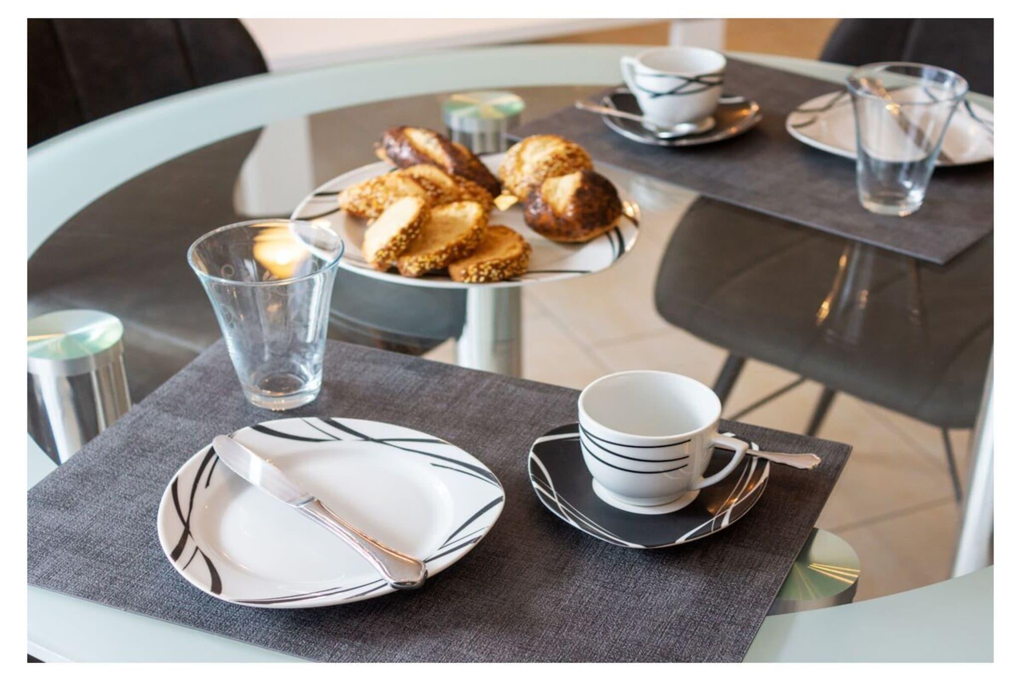 Holiday apartment Leuchtfeuer 1 ground floor A stay in this beautiful and bright holiday apartment promises unadulterated holiday pleasure. The apartment is in a central location in Norddeich. The regional leisure activities, restaurants and numerous shops can be reached in a few minutes on foot. In the middle of the action, you can also enjoy absolute peace and quiet, because the apartment building is located in a quiet side street with no traffic. This means you can enjoy all the advantages of your Norddeich holiday - relaxation and leisure activities - to the fullest. The holiday apartment The very bright and friendly holiday apartment has space for two people. A lot of emphasis was placed on creating a cozy ambience when furnishing it. At the same time, the black and white color scheme and the sparing, but carefully selected decoration appear very modern. The entire apartment has been laid out with modern and practical tiles. The heart of your holiday home is the living and dining area with integrated fitted kitchen. This is where you can come together, whether to relax in the comfortable sofa corner in front of the TV, to have a quiet chat, to cook together in the modern kitchen or to eat together at the dining table. The TV area is equipped with a DVD and Blu-ray player, so nothing stands in the way of your cozy evenings in front of the TV. There is also access to the garden here. With its southeast orientation, it offers you the opportunity to enjoy the sunrise on nice days and thus start the day properly. The integrated seating area ensures comfort. The beach chair provides a real North Sea flair. A charcoal grill is also available. The fitted kitchen is equipped with everything you need for cooking together. You will find a stove with oven, a modern coffee pad machine, a refrigerator, a microwave, a dishwasher and a coffee machine.