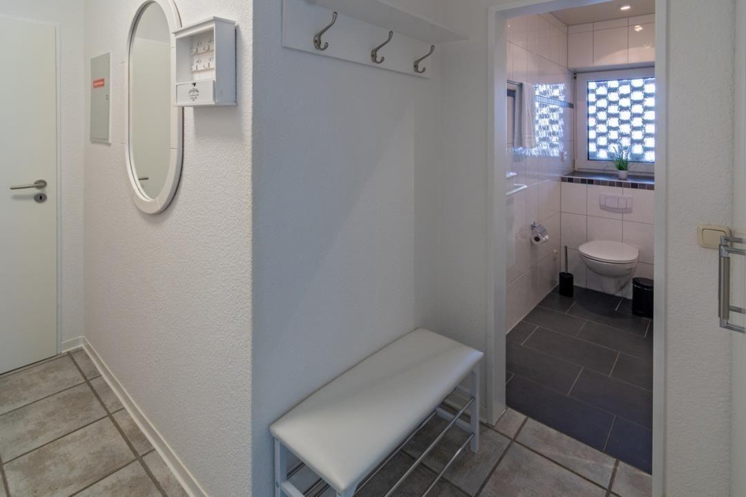 Der Flur des Apartments verfügt über eine schöne Garderobe, einen Spiegel, eine Ablagefläche für Ihre Schuhe sowie einen Schlüsselkasten.