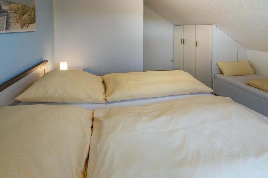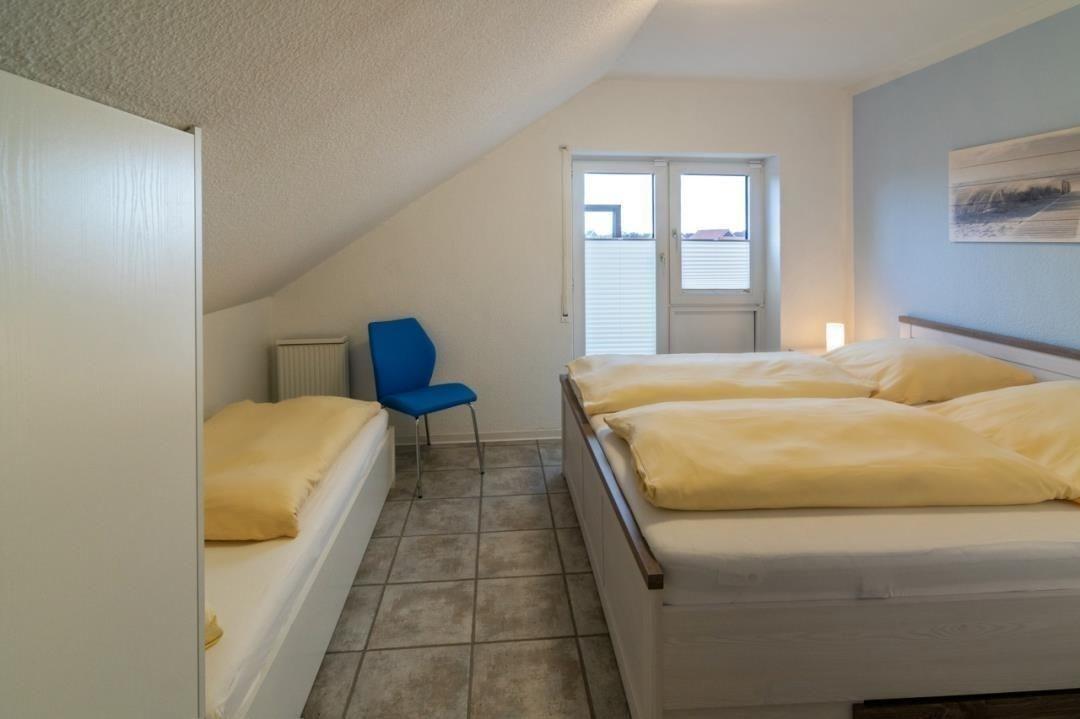 Das Schlafzimmer ermöglicht wie der Wohnraum den direkten Zugang zum Balkon und bietet Platz für drei Personen. Hier gehören ein 180 x 200 cm großes Doppelbett mit getrennten Matratzen und im Fuß- und Kopfbereich verstellbaren Lattenrosten, ein 90 x 200 cm großes Einzelbett, zwei Nachttische mit Leselampen sowie ein dreitüriger Kleiderschrank zur Ausstattung. Die Fenster lassen sich durch Rollläden verdunkeln.