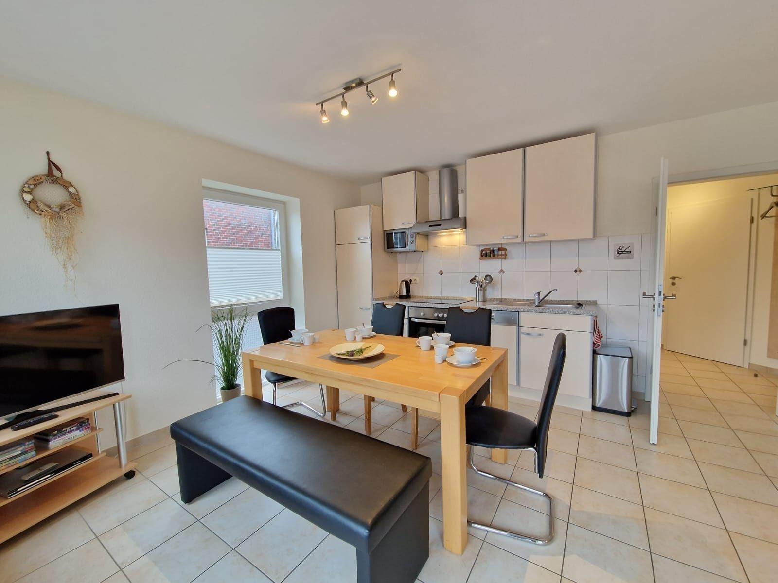 In dieser gemütlichen Ferienwohnung finden Gäste eine hochwertige Ausstattung, die hohen Komfort bietet. Die offene Küche ist mit modernen Geräten wie einem Elektro-/Gasherd, Geschirrspüler und Mikrowelle ausgestattet und lässt keine Wünsche offen. Ein Esstisch lädt zum geselligen Beisammensein ein.