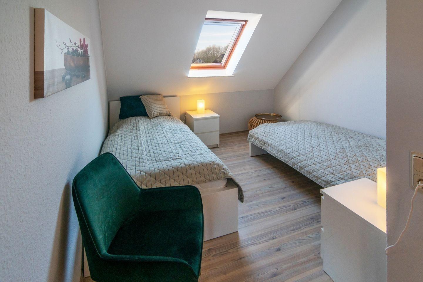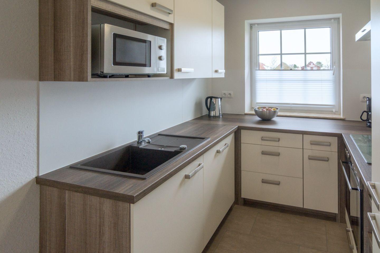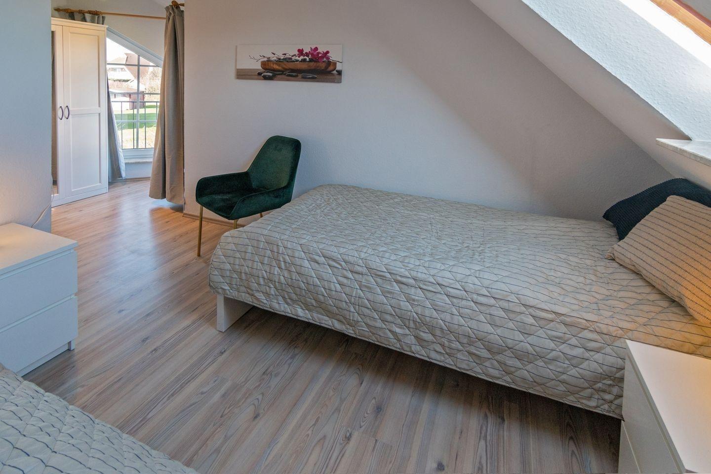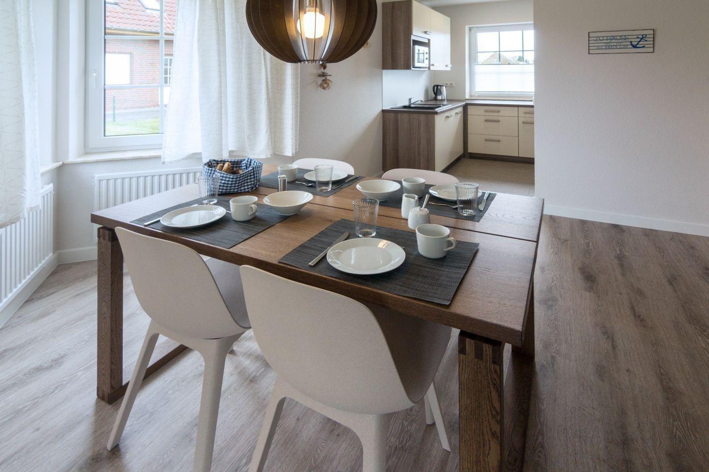 Die Ferienwohnung bietet ein modernes und allergikergeeignetes Ambiente mit zwei Schlafzimmern, in denen sich ein Doppelbett und zwei Einzelbetten befinden. Die offene Küche ist mit einem Geschirrspüler, einem Elektro-/Gasherd, einem Backofen, einer Mikrowelle, einem Kühlschrank und einer Kaffeemaschine ausgestattet. Ein Frühstückstisch mit Geschirr und Besteck lädt zu gemeinsamen Mahlzeiten ein. In dem hellen Duschbad mit Fenster stehen ein Haartrockner und ein Gäste-WC zur Verfügung. Der gemütliche Wohnbereich verfügt über ein Sofa, einen Sessel und eine HiFi-Anlage sowie einen TV. Internet mit WLAN sorgt für eine reibungslose Verbindung. Ein Parkplatz ist ebenfalls vorhanden. Praktische Extras wie eine Waschmaschine, ein Wasserkocher, ein Toaster, ein Kinderhochstuhl und eine Garderobe runden das Angebot ab. Die zentrale Lage der Wohnung ermöglicht einen entspannten Urlaub für die ganze Familie.