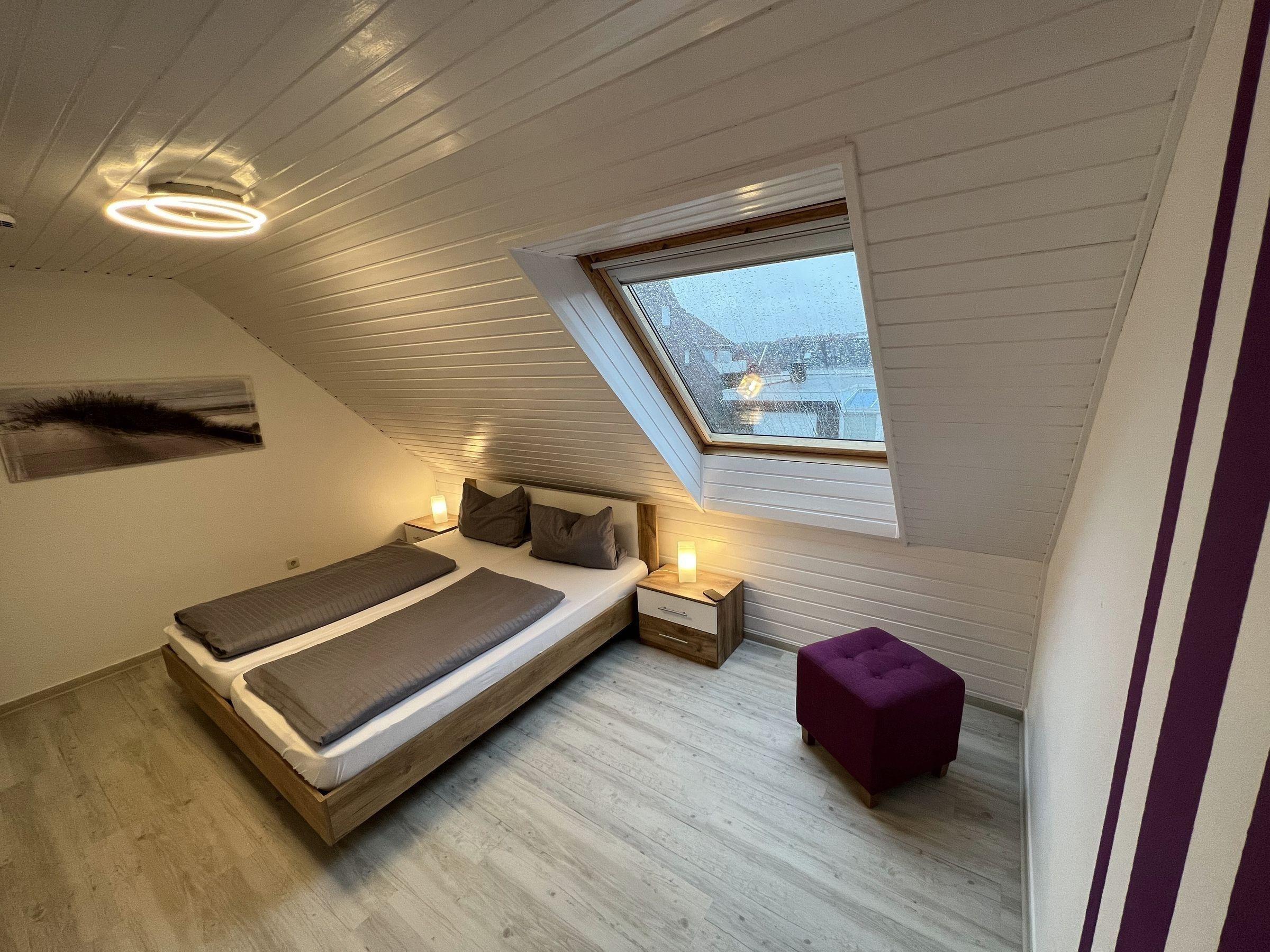 Weiter gehören zur Wohnung 2 freundliche Schlafzimmer mit jeweils einem Doppelbett. Das zweite Schlafzimmer im ausgebauten Dachgeschoss ist über eine Raumspartreppe zu erreichen. Das moderne Badezimmer hat eine Dusche, Waschbecken und WC.