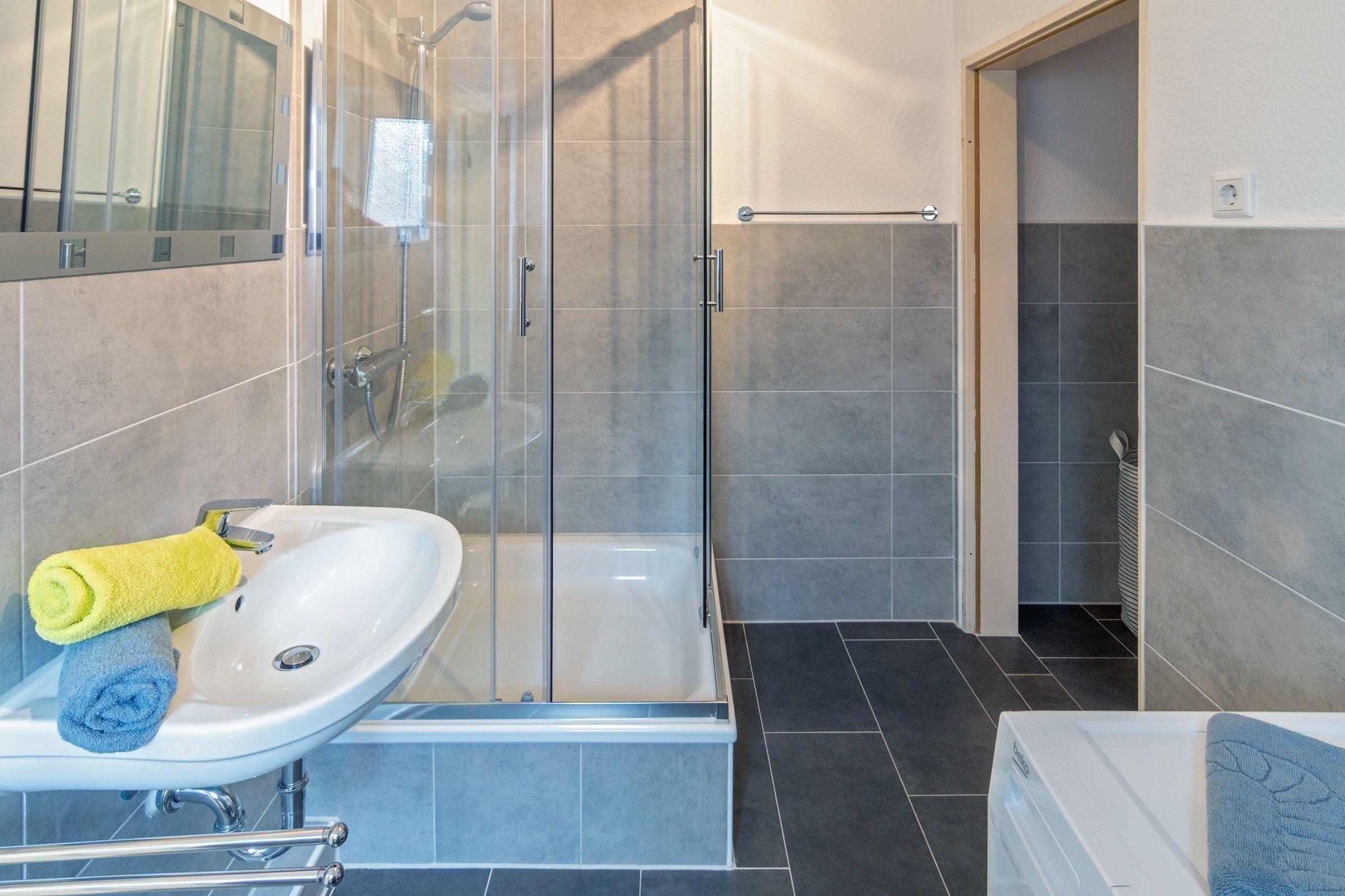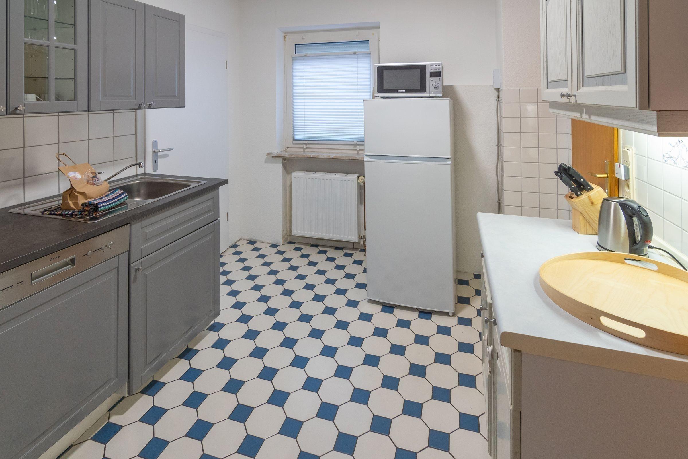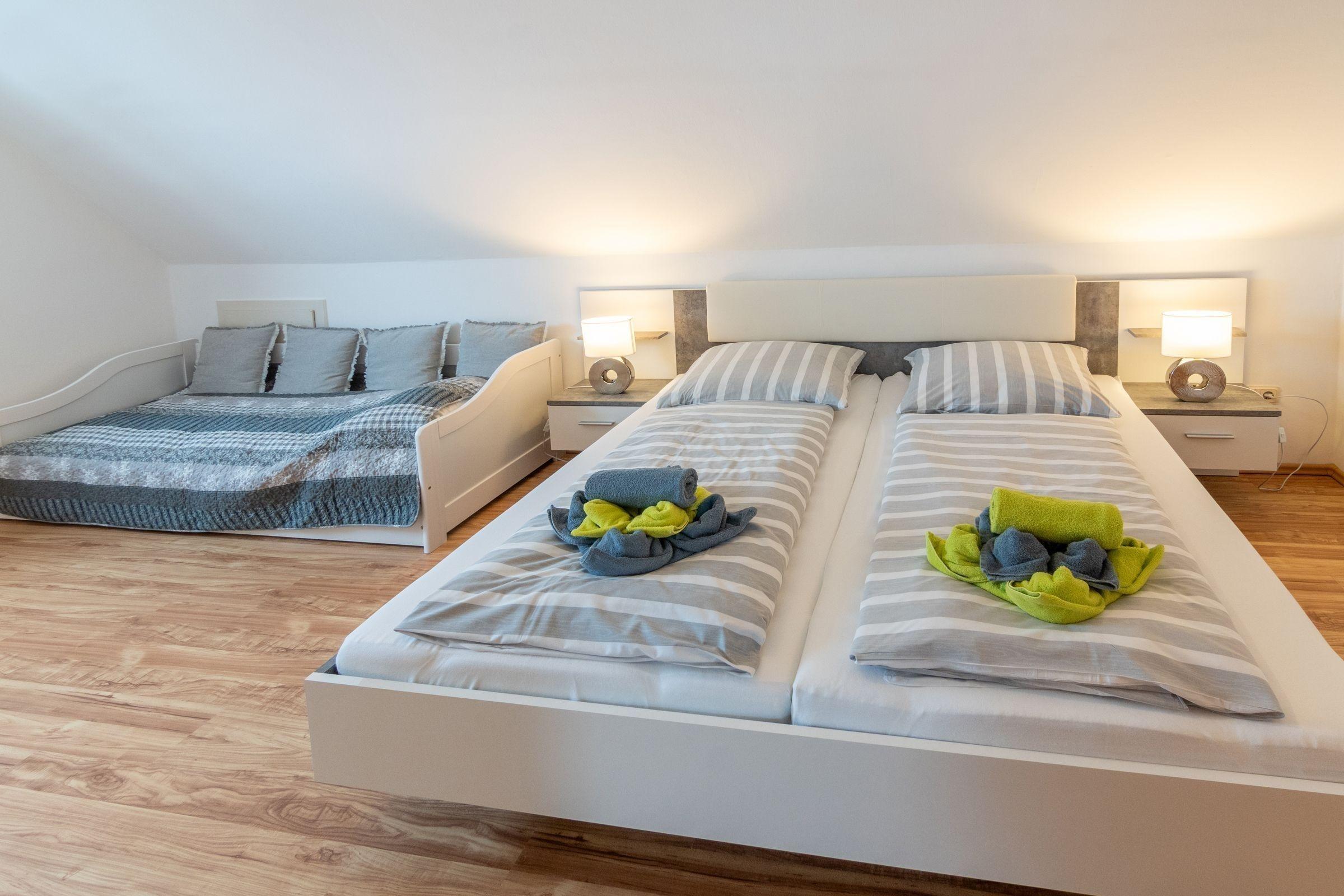 Die Ferienwohnung bietet eine großzügige und allergikergeeignete Ausstattung, die für entspannte Urlaube sorgt. Sie verfügt über 4 Schlafzimmer, darunter 2 Doppelbetten, 2 Einzelbetten und ein Kinderbett sowie eine Schlafcouch im Wohnschlafzimmer. Für die Zubereitung von Mahlzeiten steht eine separate Küche zur Verfügung, die mit einem Geschirrspüler, Elektro- und Gasherd, Backofen, Mikrowelle, Kühlschrank und Gefriermöglichkeit ausgestattet ist. Kaffeemaschine und Toaster sorgen für zusätzlichen Komfort. Die 2 Badezimmer bieten eine Dusche und eine Badewanne, ergänzt durch einen Haartrockner und einen Spiegel.